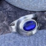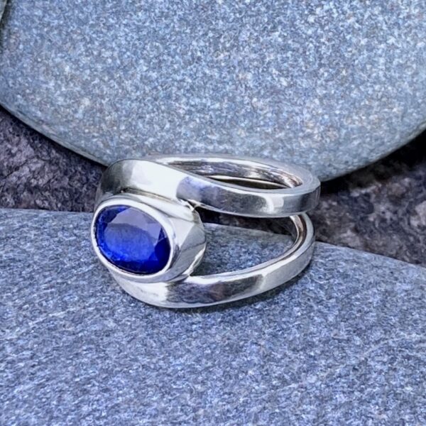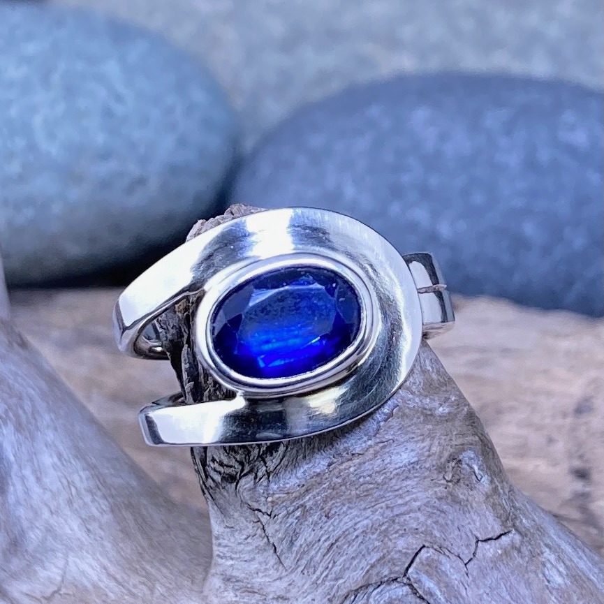 I form the band in bright Argentium 940 silver, creating two graceful passes of metal that meet and lock the stone in place. Then I widen the buttonhole edge for balance and polish the surfaces to a crisp shine. The open, looping shape lets light reach the kyanite from several angles, so its blue shifts softly as you move.