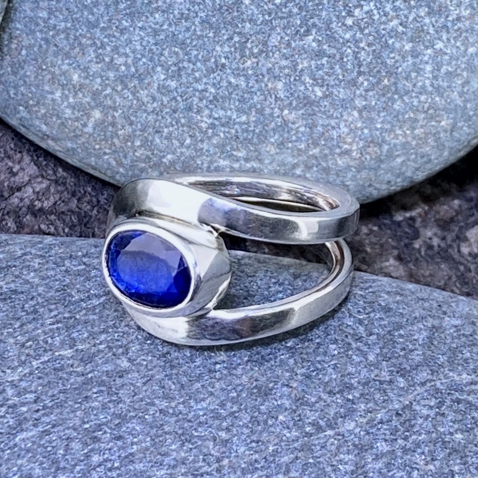 The Kyanite Ring Size 4.25 Argentium Silver Buttonhole blends clean lines with sculptural flow. I set an oval blue kyanite into my signature Buttonhole design — smooth, modern, and comfortable. The band wraps around the stone and doubles back to complete the ring, while a lightly hammered buttonhole edge adds extra silver presence.