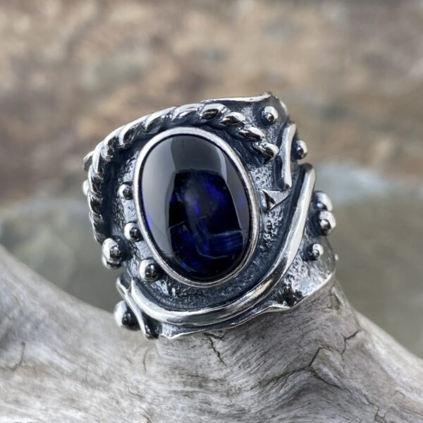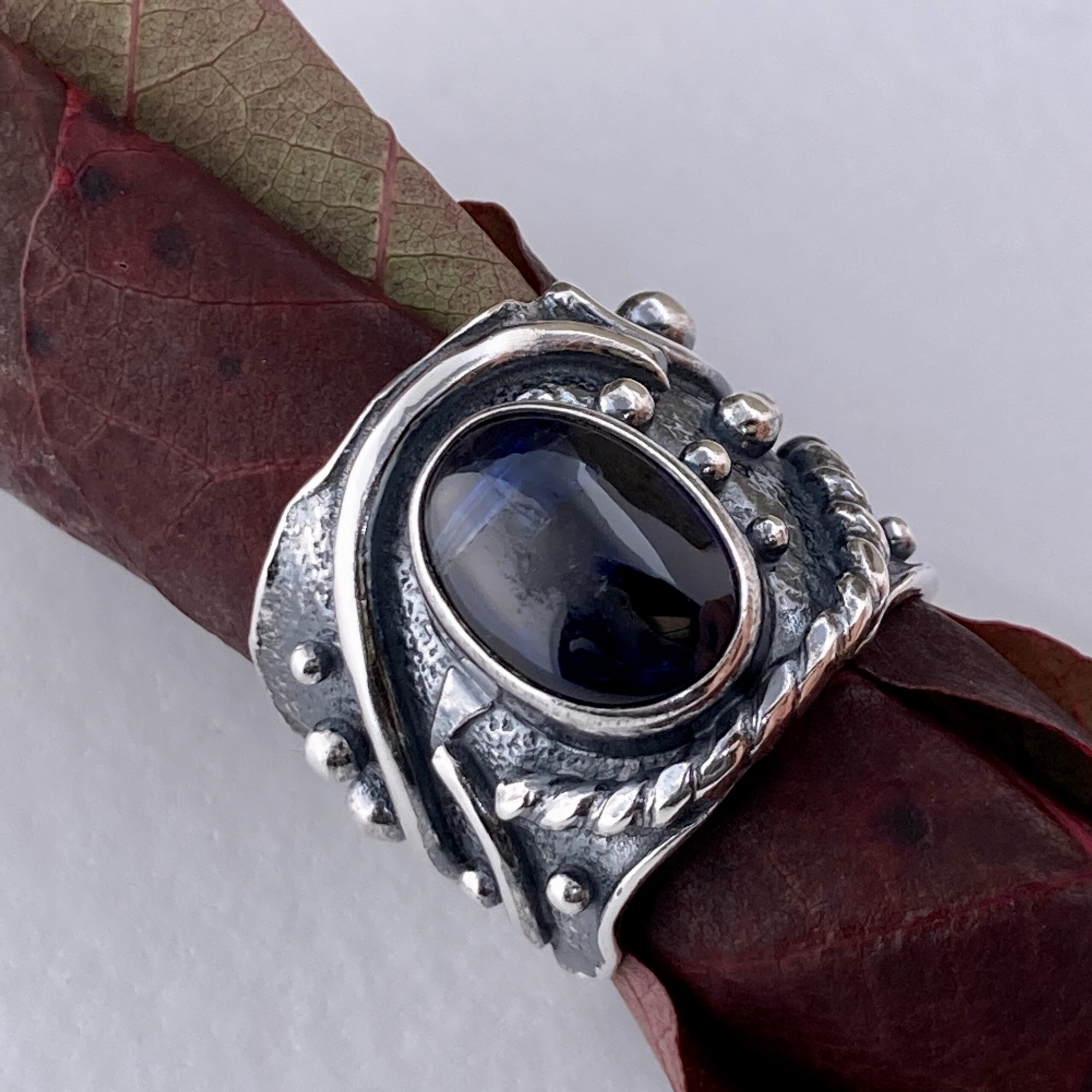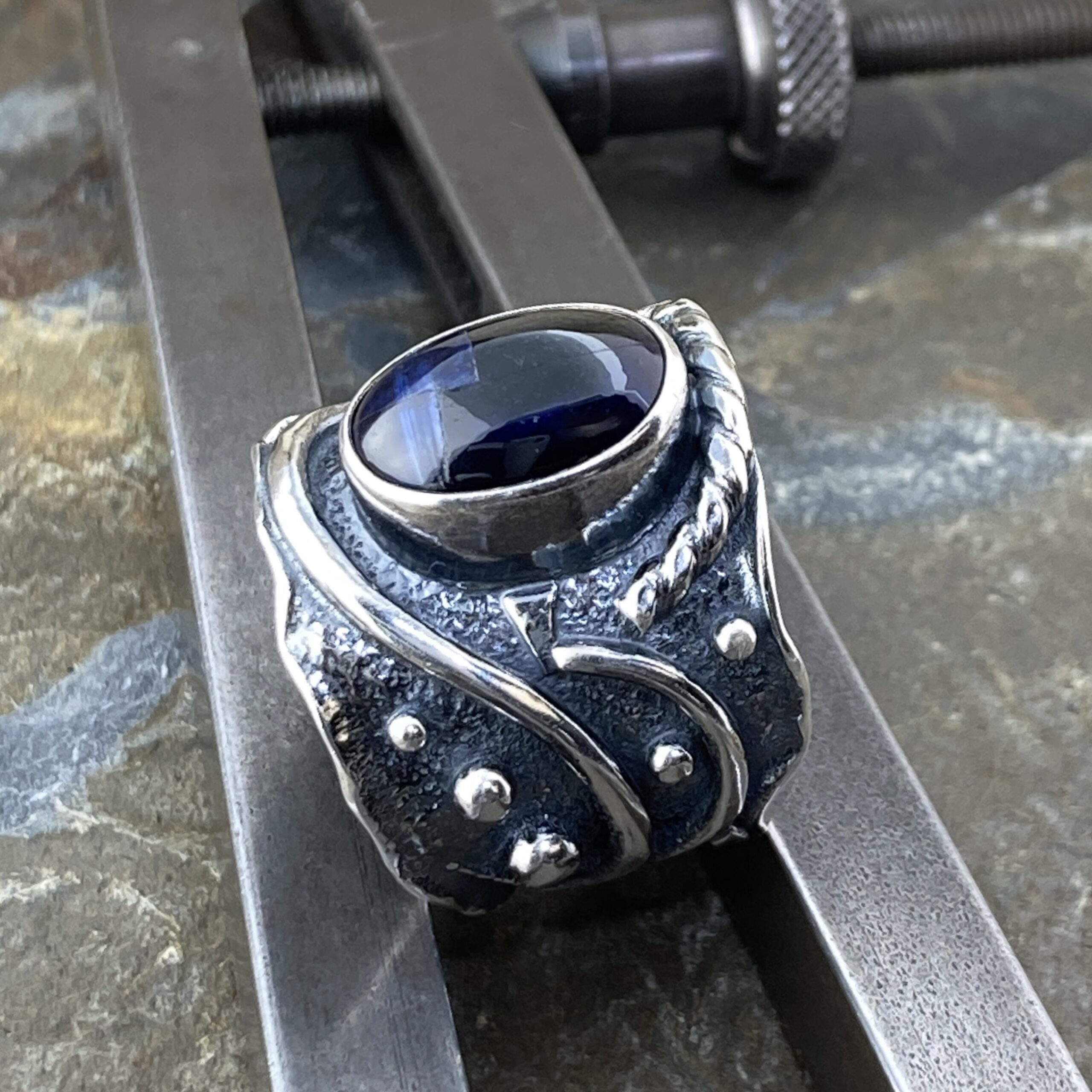 I form the Waves design from textured Argentium 940 silver, shaping each curve to echo the rhythm of water. The soft, undulating edges are heat-rolled for a naturally worn, wave-smoothed finish. The wide bezel anchors the gemstone securely while emphasizing its reflective depth.