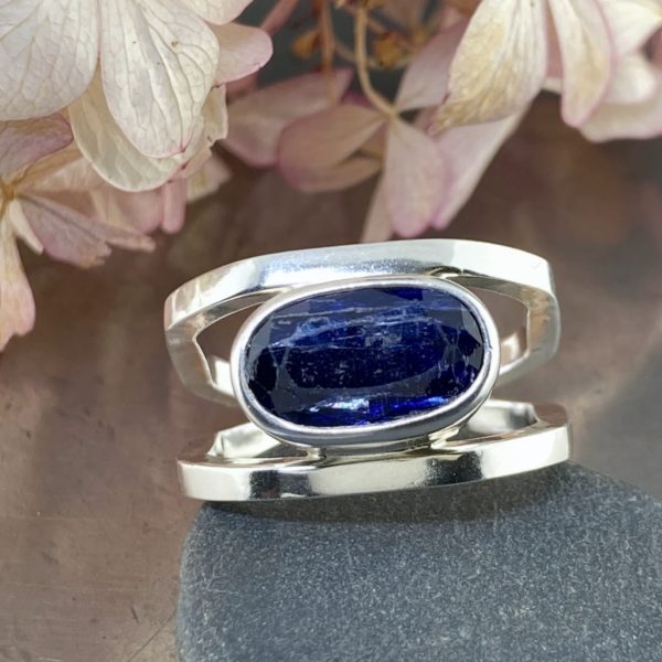 Handmade Kyanite ring with a geometric Octagon double band and natural gemstone mined in Nepal.