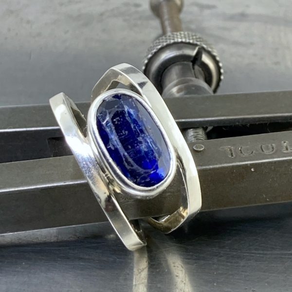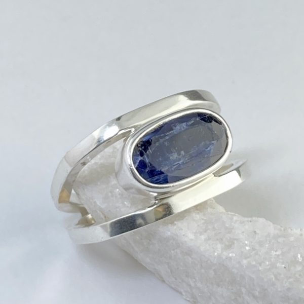 The gemstone is a natural 4.88 carat Kyanite, long oval cut and bezel set. It was mined in Nepal and shows deep, shifting blue tones that catch light from every angle. The shape fits perfectly within the Octagon band, creating a balance between form and colour.