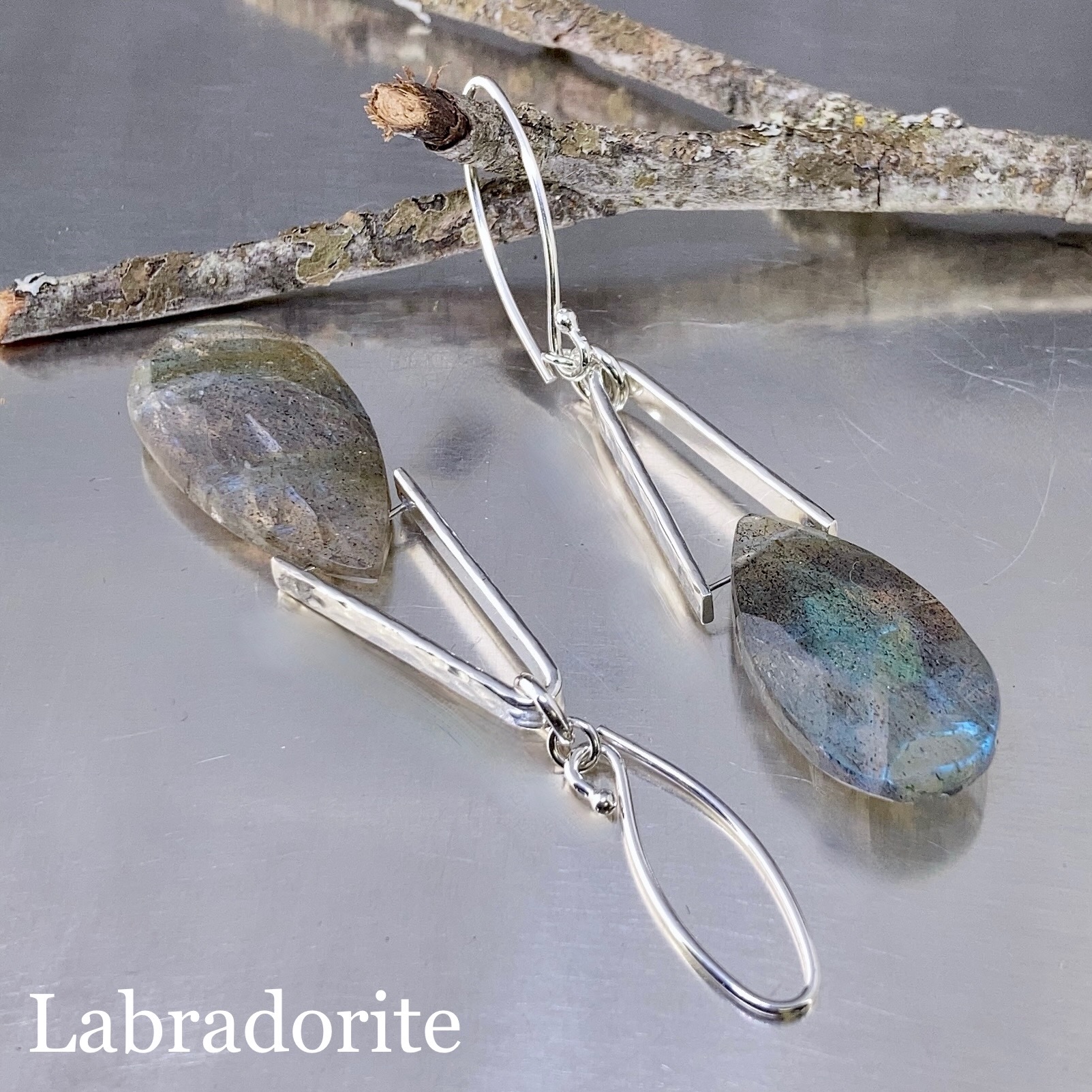 Natural gemstone teardrops on a hand hammered V bail. These earrings have the long Argentium silver earwires.