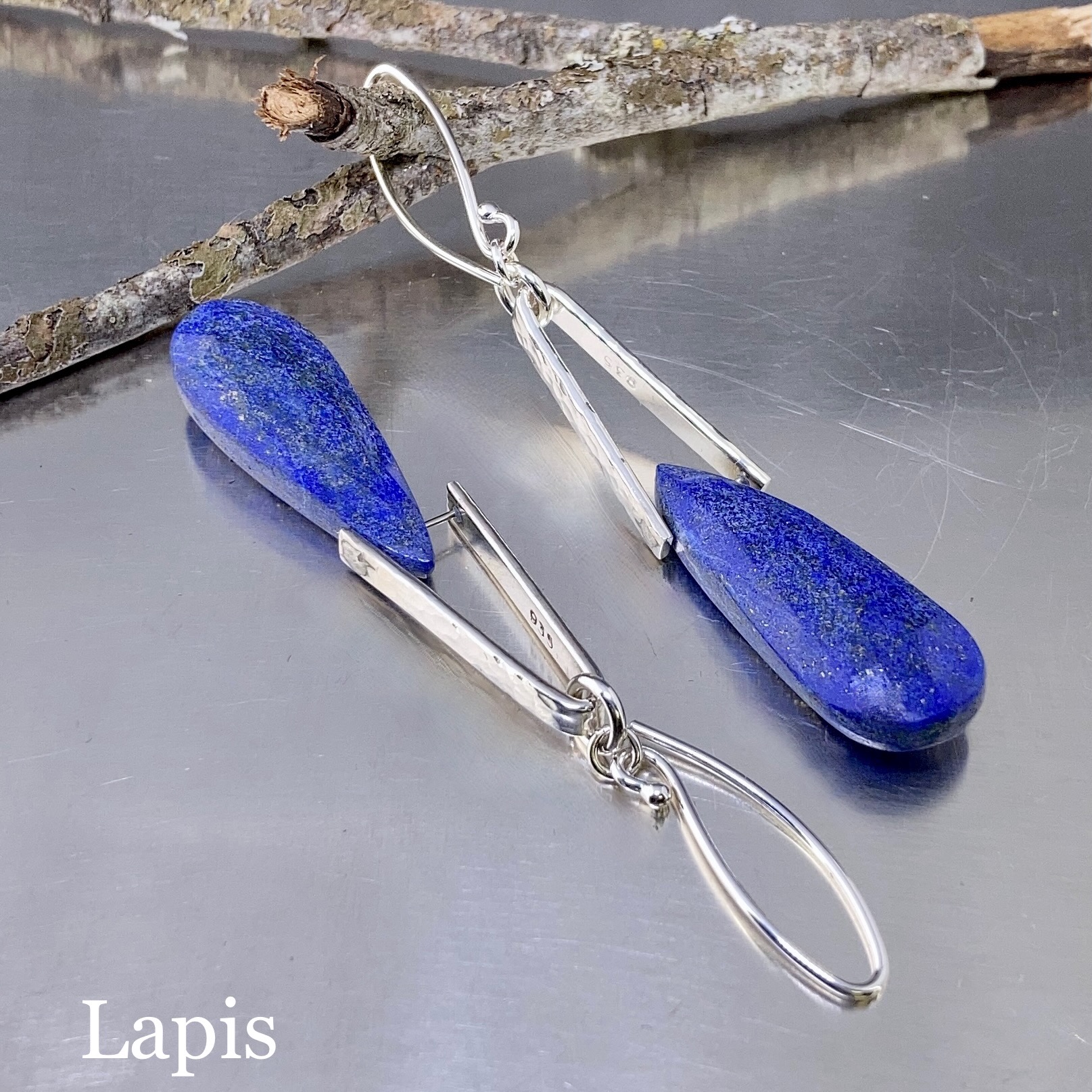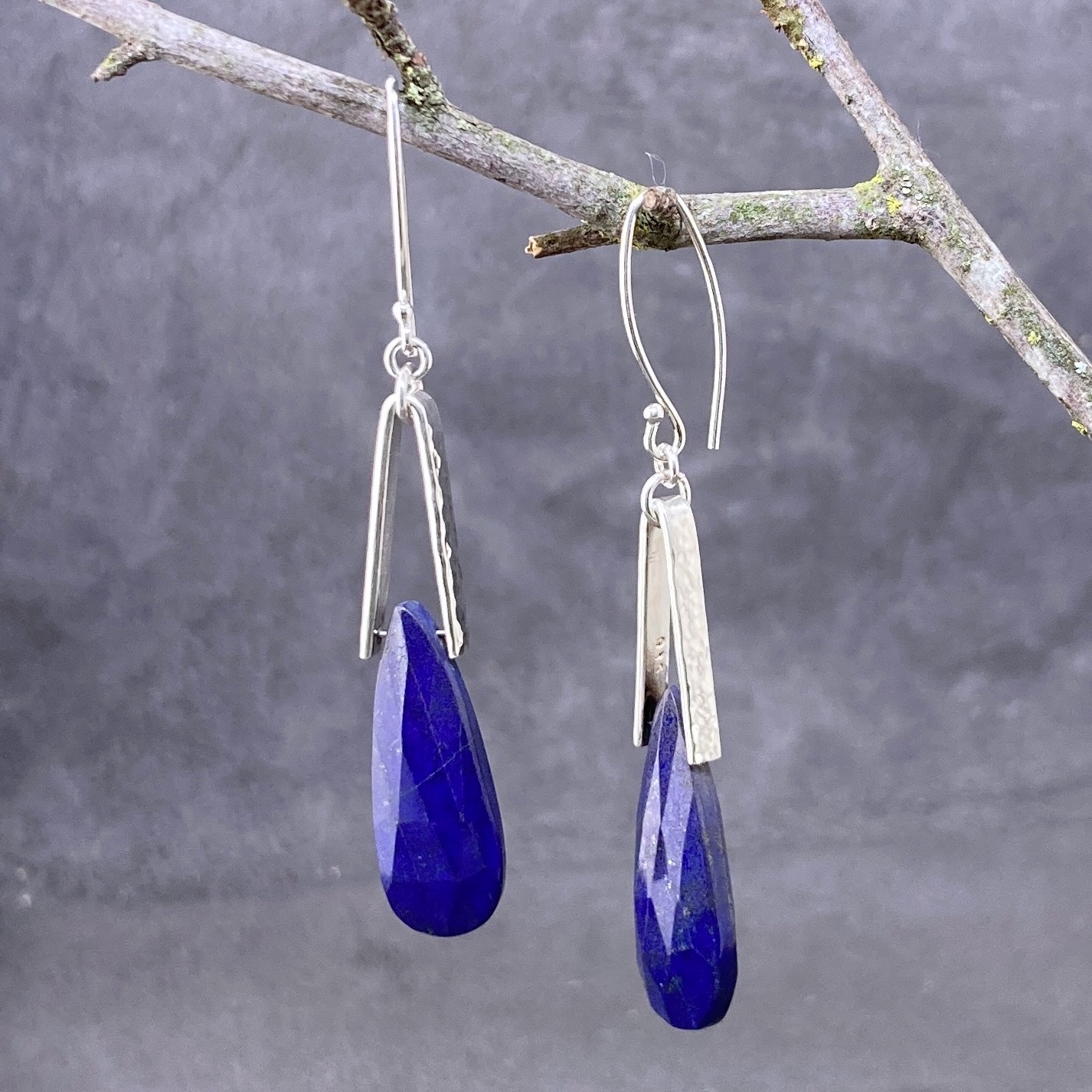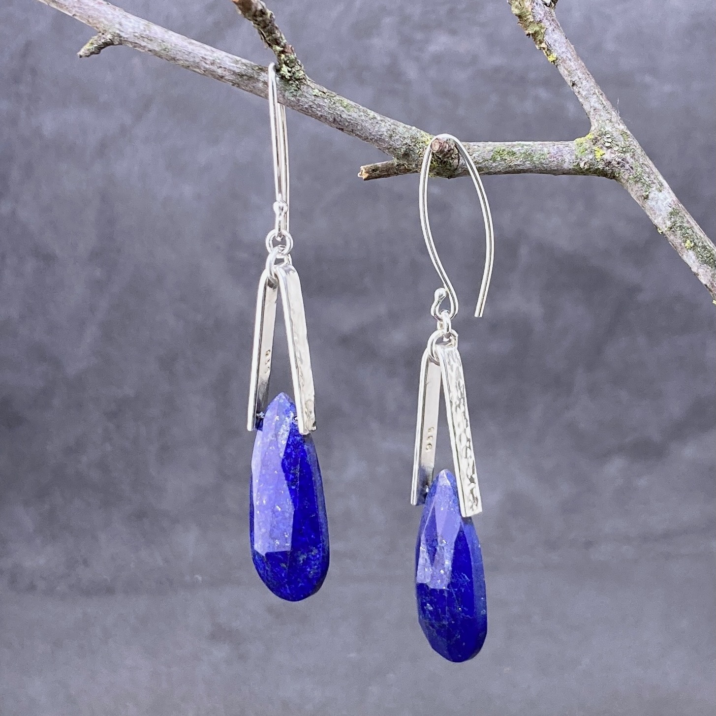 Natural gemstone teardrops on a hand hammered V bail. These earrings have the long Argentium silver earwires.