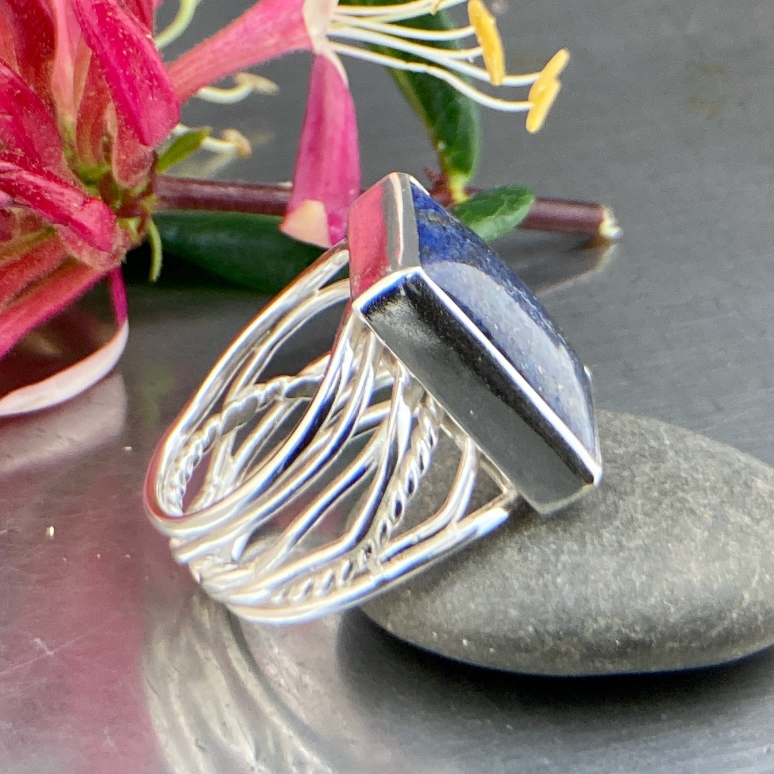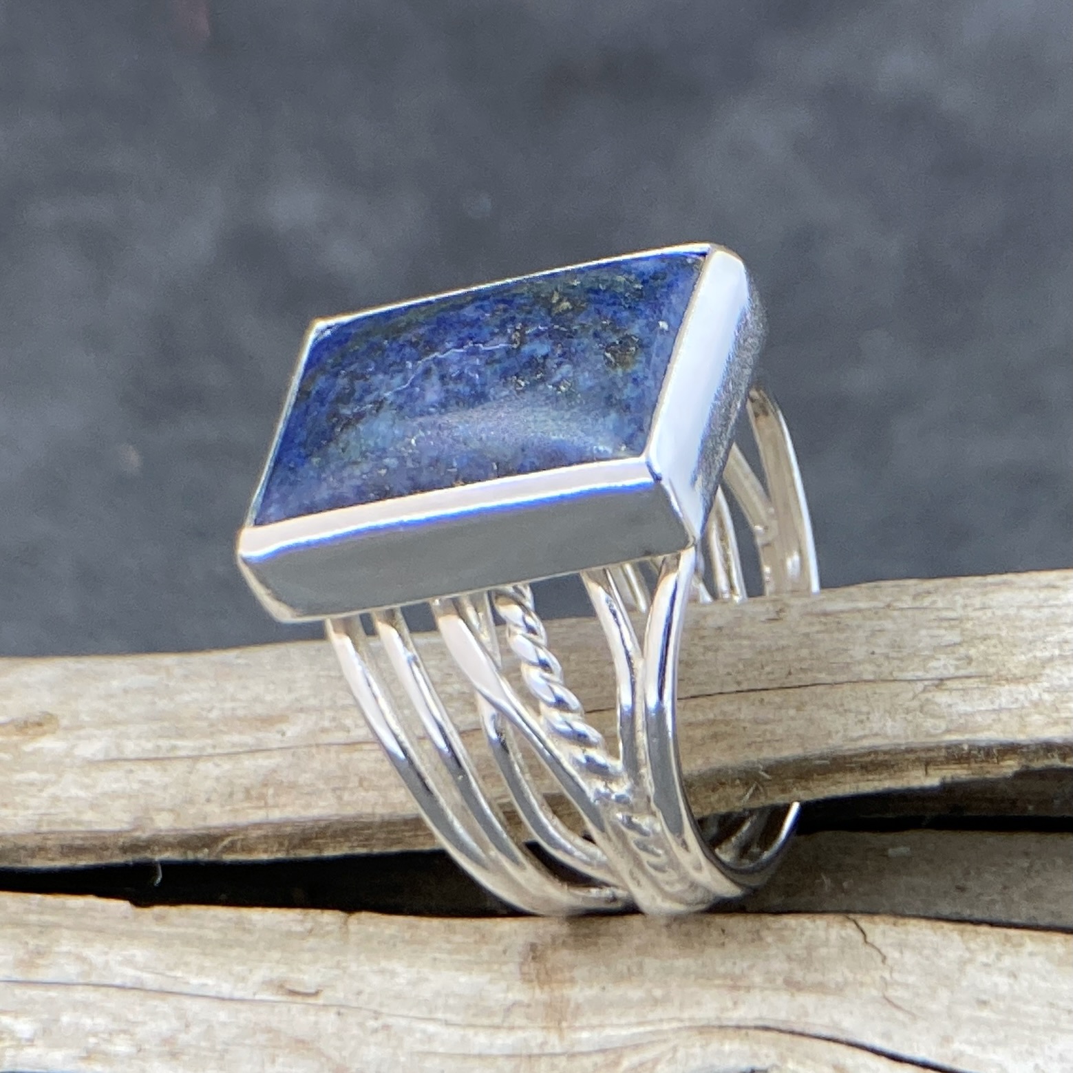 A natural Twig Band ring featuring a rectangular Lapis cabochon from Afghanistan. The gemstone’s deep blue color pairs beautifully with the organic lines of Argentium silver. The twig texture adds movement and airiness, giving the piece both strength and life.