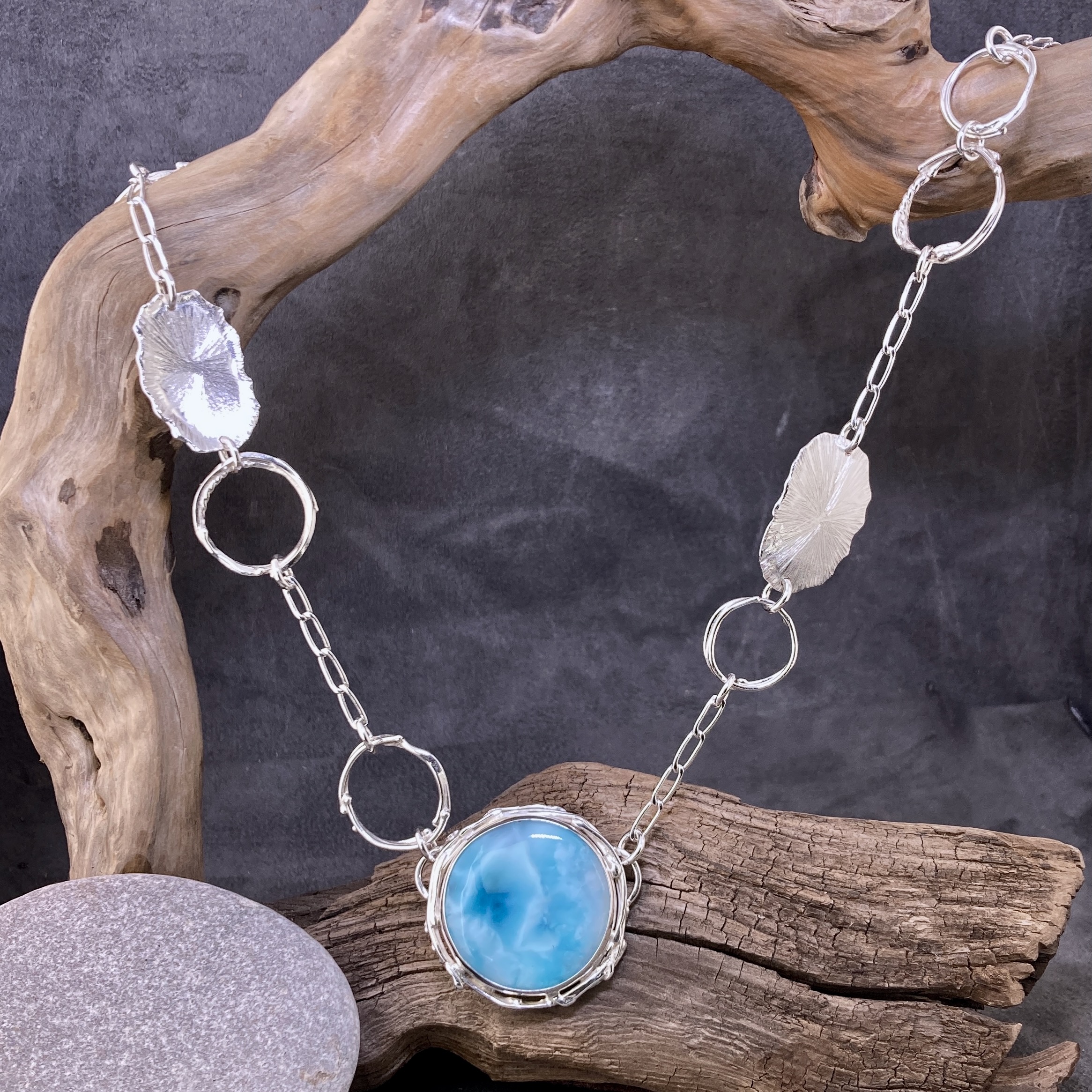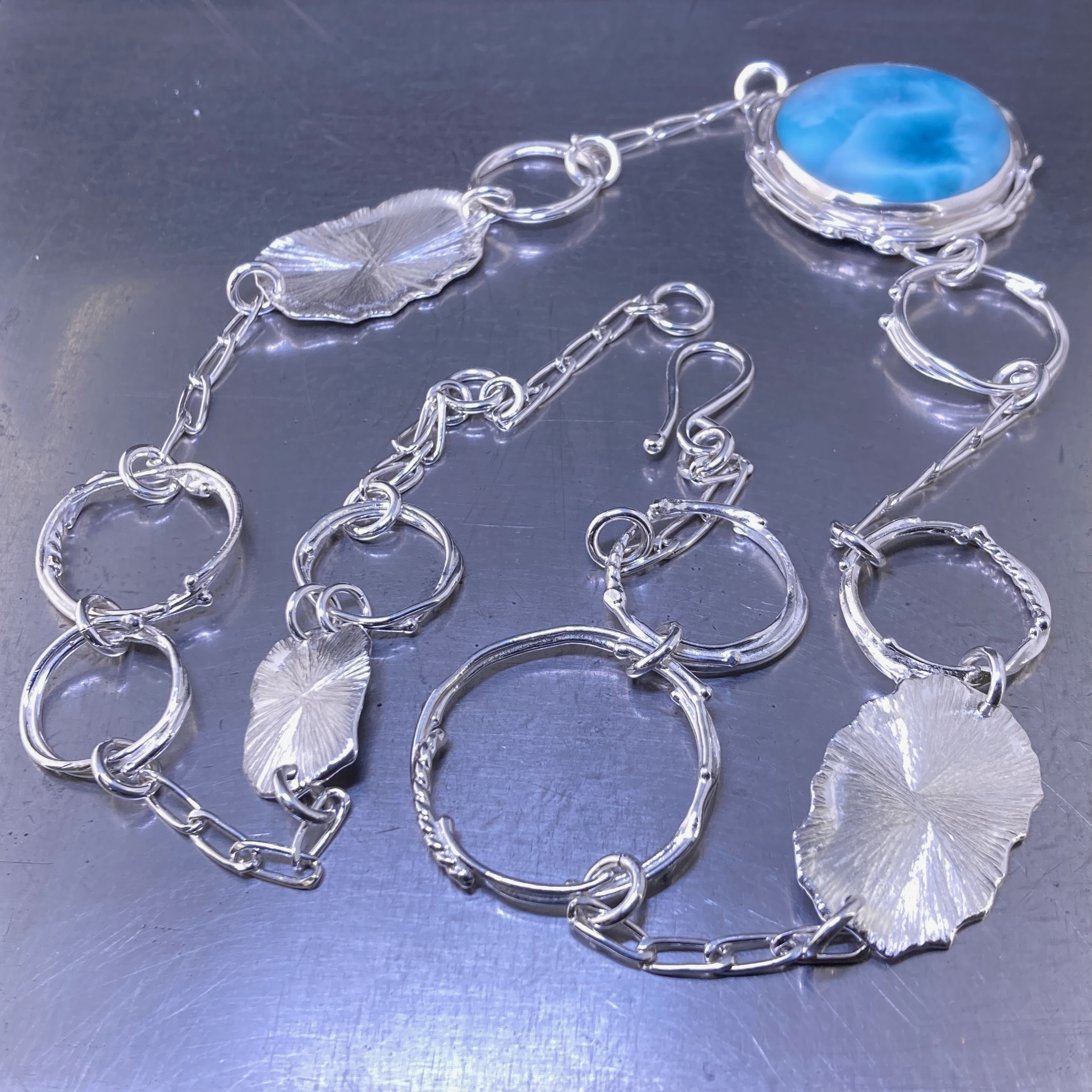 Larimar Necklace – Freeform Circle and Suns – Argentium Silver