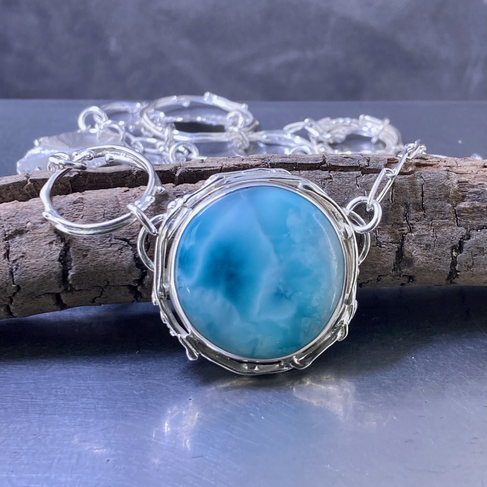 Larimar Necklace – Freeform Circle and Suns – Argentium Silver - Image 4