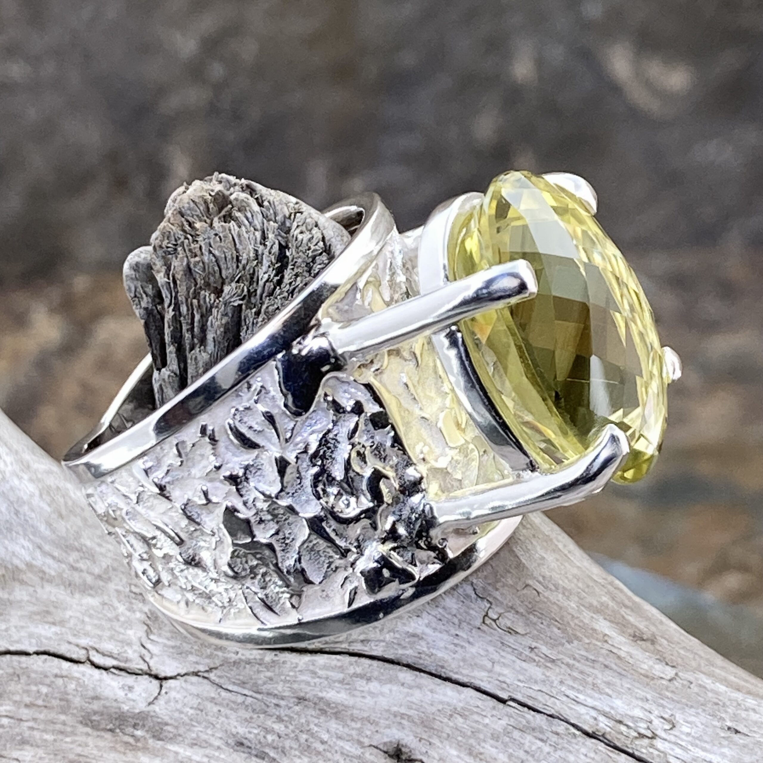 The Lemon Quartz ring glows like sunlight across the moon’s surface. Bright gold tones shimmer against textured silver, creating a design that feels open, radiant, and strong. Every ring is handmade to balance light, colour, and form.