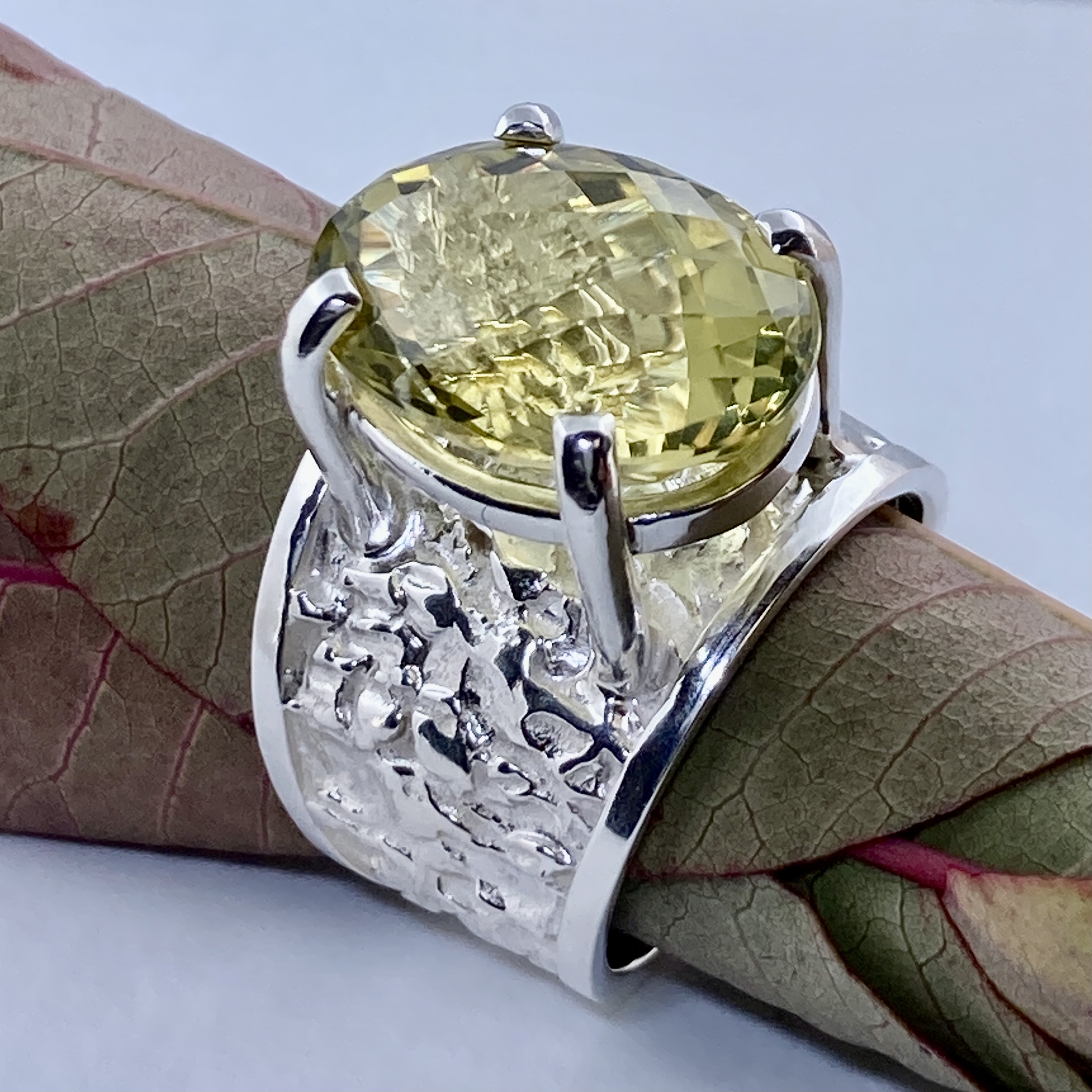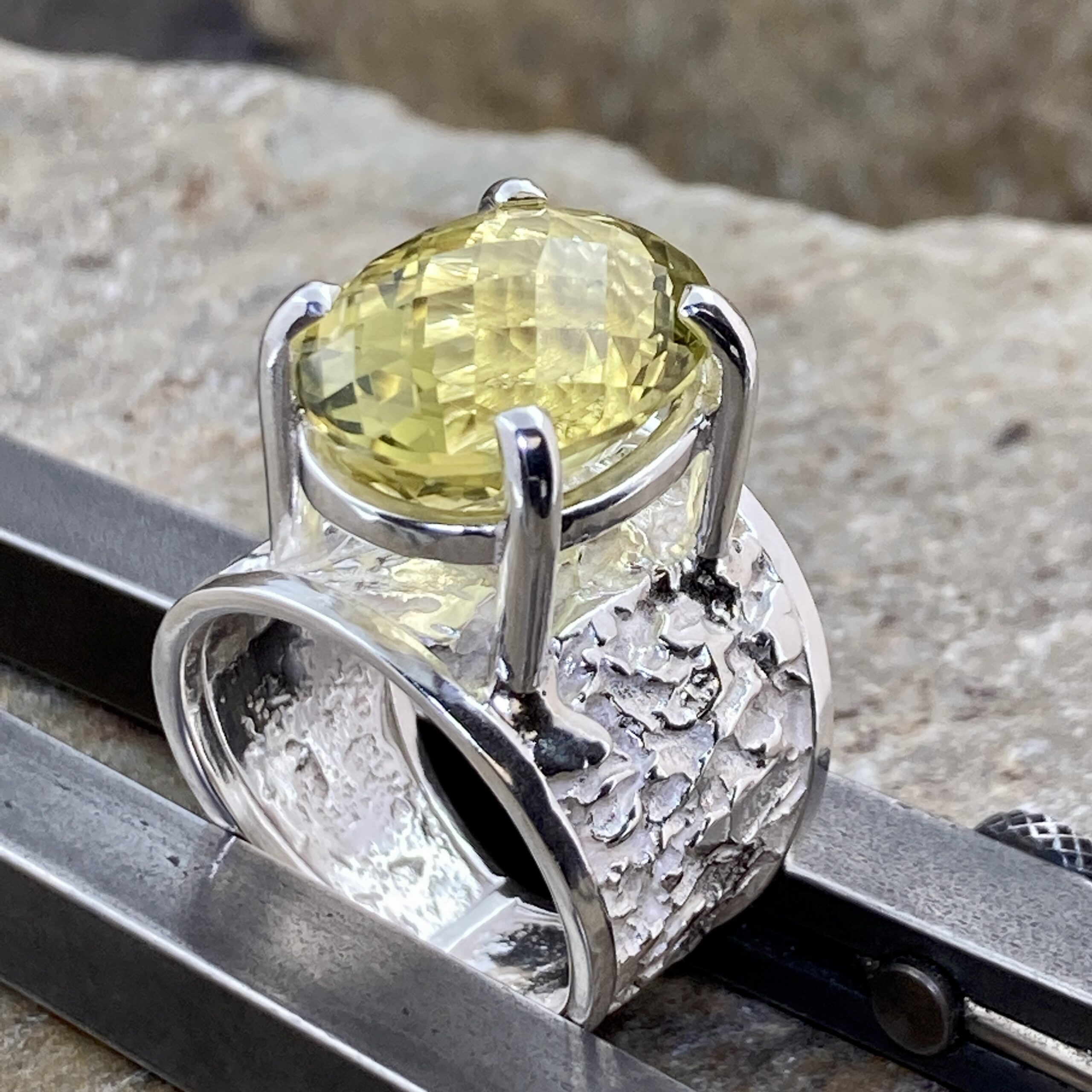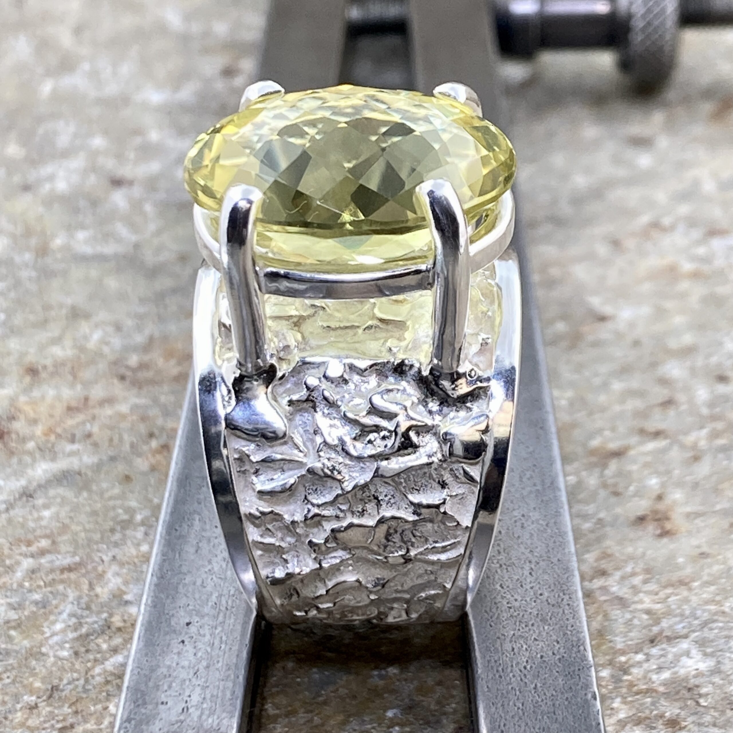 The gemstone is a 13.8 carat natural Lemon Quartz, oval in shape with a checkerboard cut. Its bright yellow tone catches the light beautifully. The prong setting lets the stone stay open and brilliant, giving maximum sparkle while keeping the design airy and elegant.