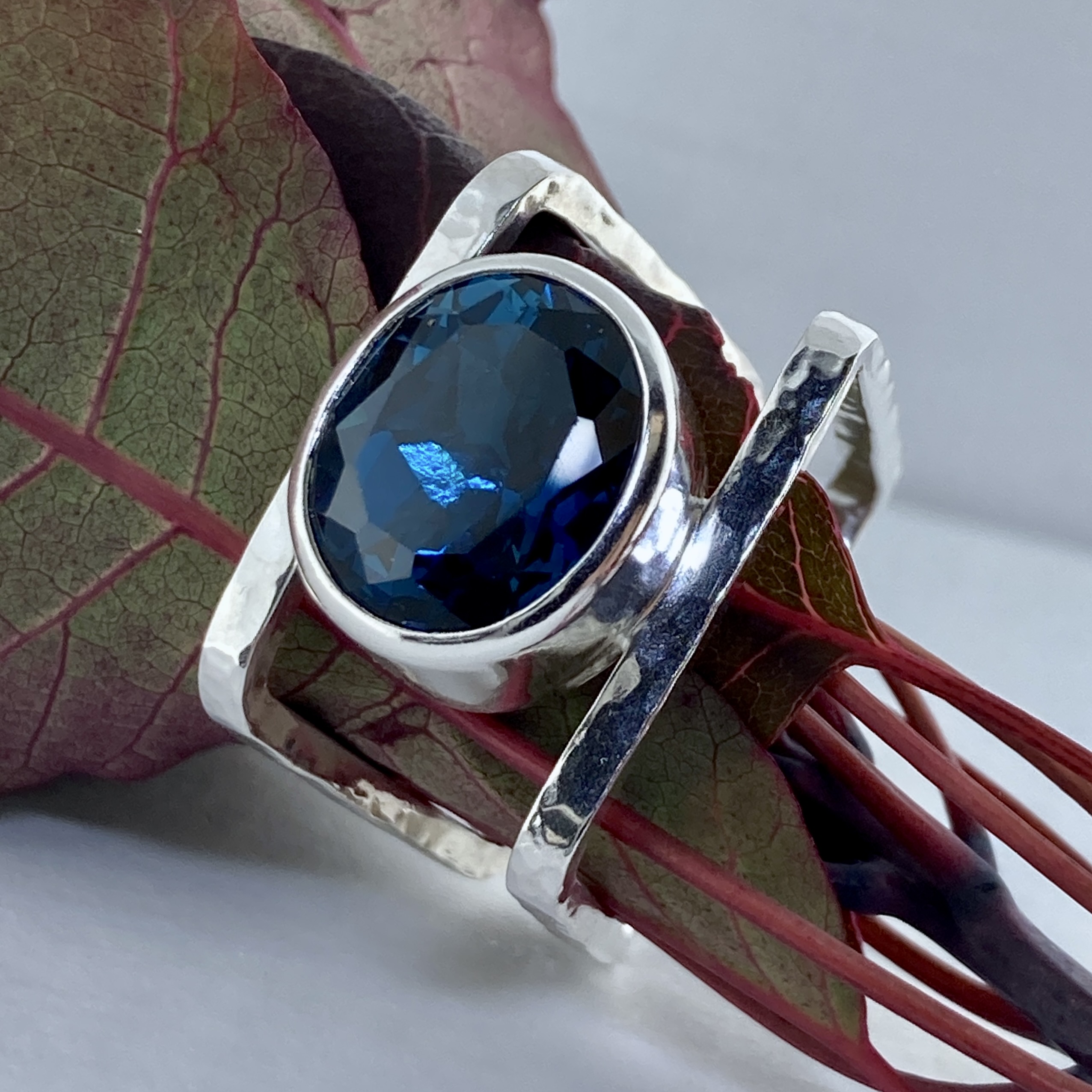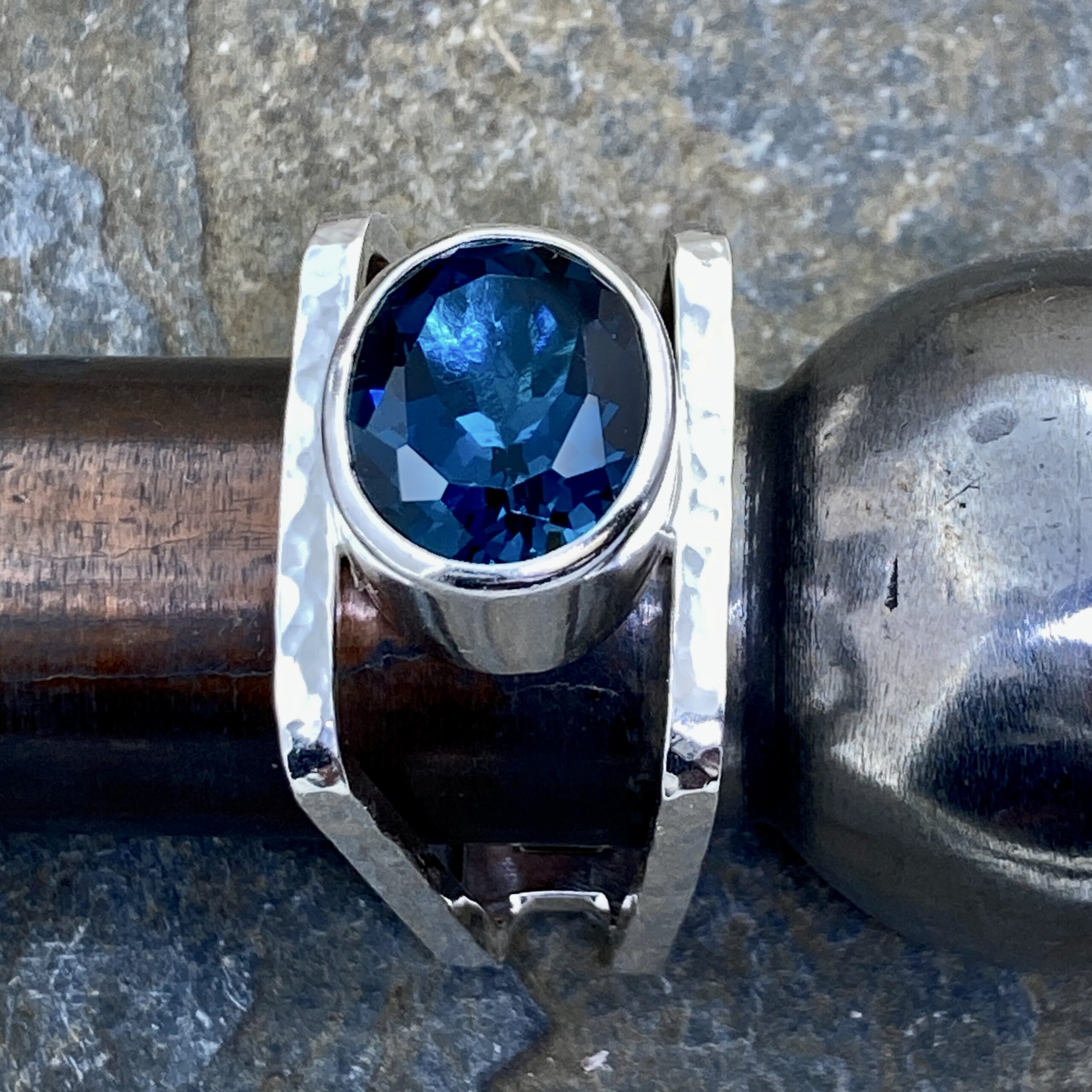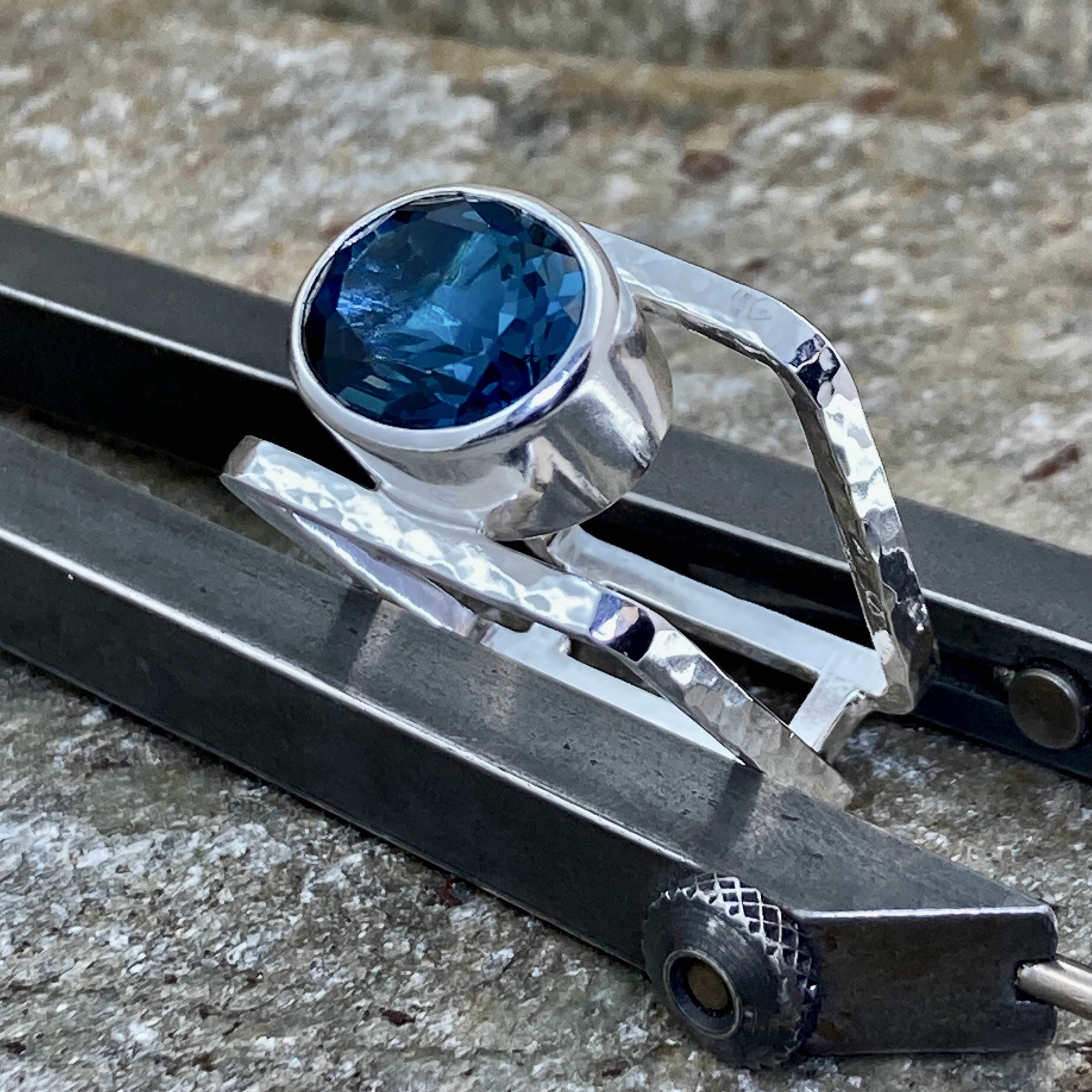 This 10 carat oval London Blue Topaz shows deep ocean-blue tones with exceptional clarity. The stone’s rich color contrasts beautifully with bright, textured Argentium silver, giving the piece both warmth and sophistication.