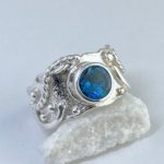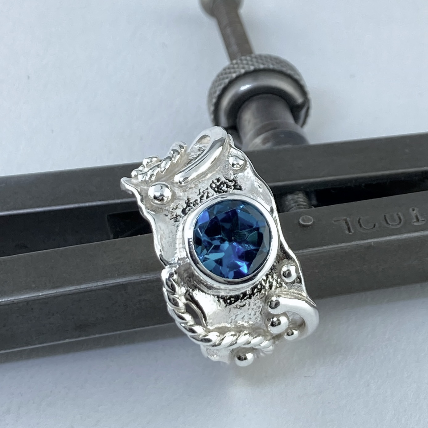 I form each ring using gentle heat and shaping tools to coax the silver into motion. After refining and polishing, the bezel-set gemstone becomes the focal point — clear and blue, like sunlight through deep water.