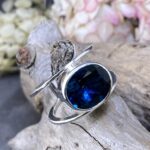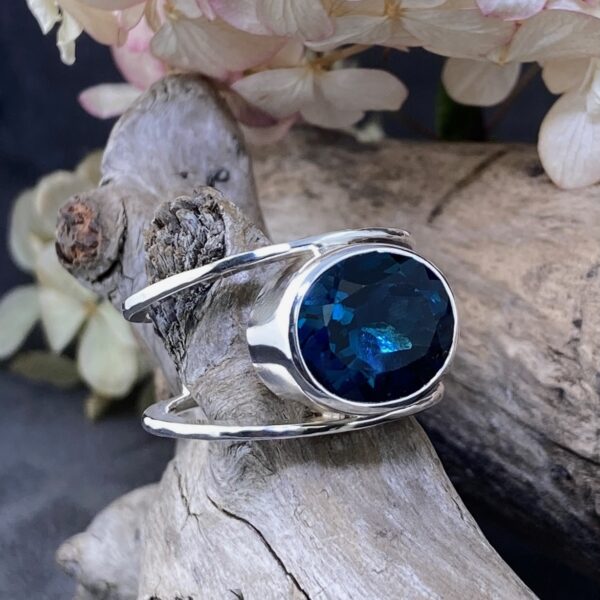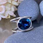 This 10.5 carat oval London Blue Topaz glows with deep, ocean-blue tones. Its clarity and cut enhance the reflective color, while the bezel setting holds it firmly within the silver frame. The result is a gemstone that feels both bold and serene.