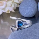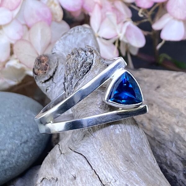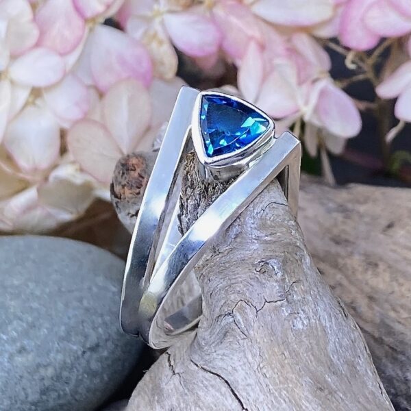 The gemstone is a natural London Blue Topaz weighing about 2 carats. It has a trillion cut that sparkles with blue and teal tones. I set the stone between the two silver bands in a custom bezel. This setting protects the edges and keeps the look clean.