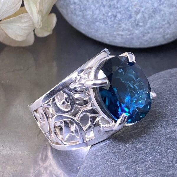 The London Blue Topaz Pebbles Ring in Argentium Silver shows how strength and light can work together. The broad silver band carries a rich blue gemstone that glows like deep water. Each fused pebble adds shape and rhythm, giving the surface a calm, natural flow.