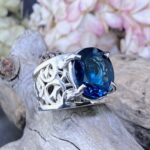 This oval London Blue Topaz weighs about 9.5 carats. It is held in a prong setting that allows light to move through the gem. The stone shows rich blue tones with flashes of teal and indigo, adding depth and brightness to the silver.