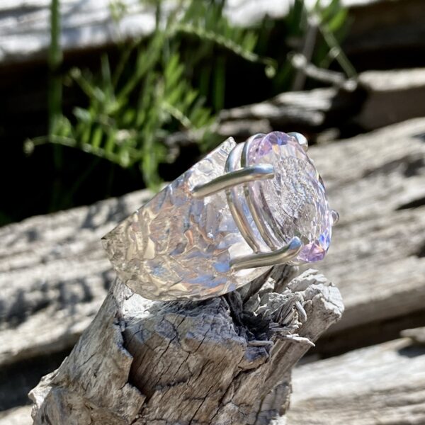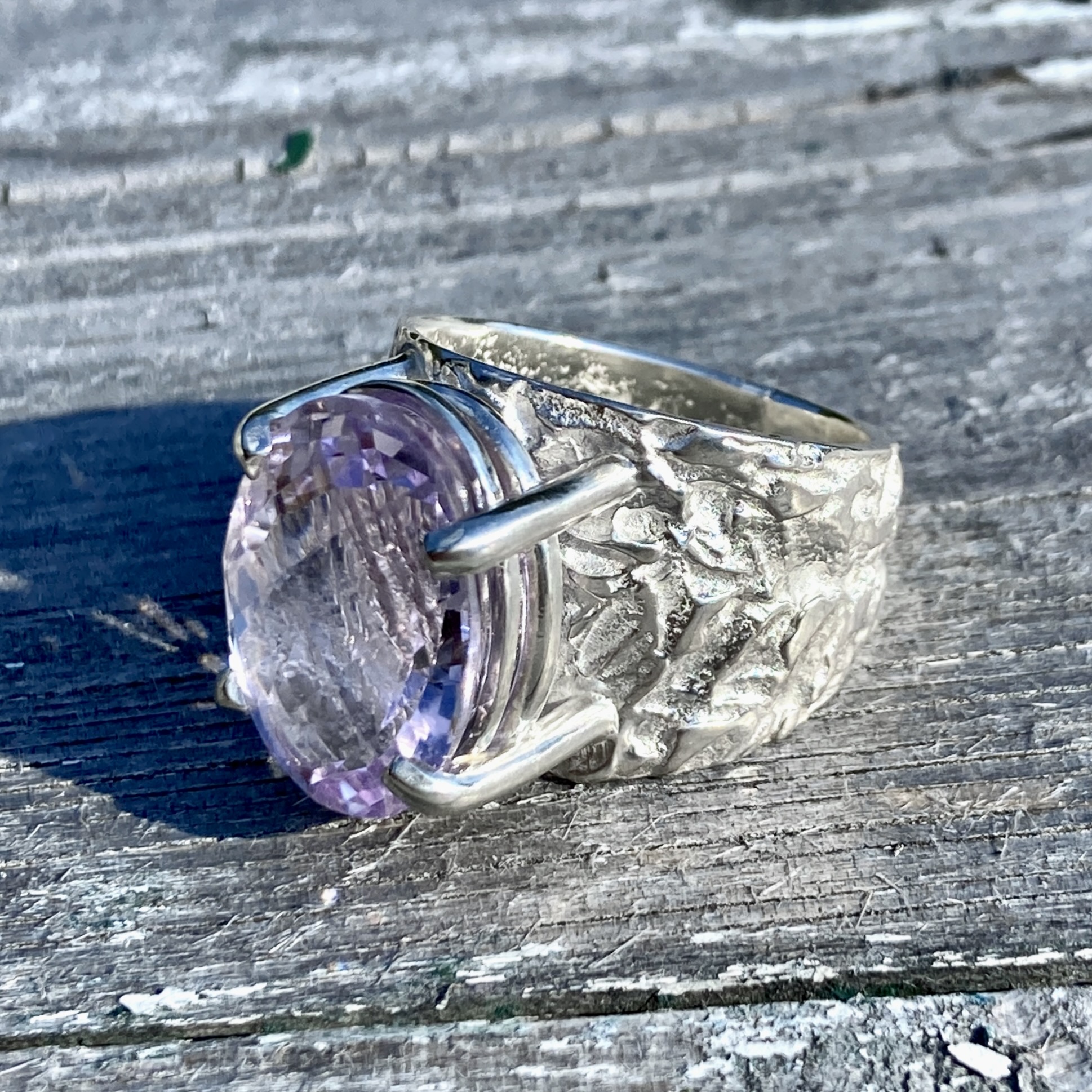 Handmade Lavender Amethyst ring in Argentium silver with a Lunar Band design. Large oval checkerboard cut stone set in an airy prong mount.