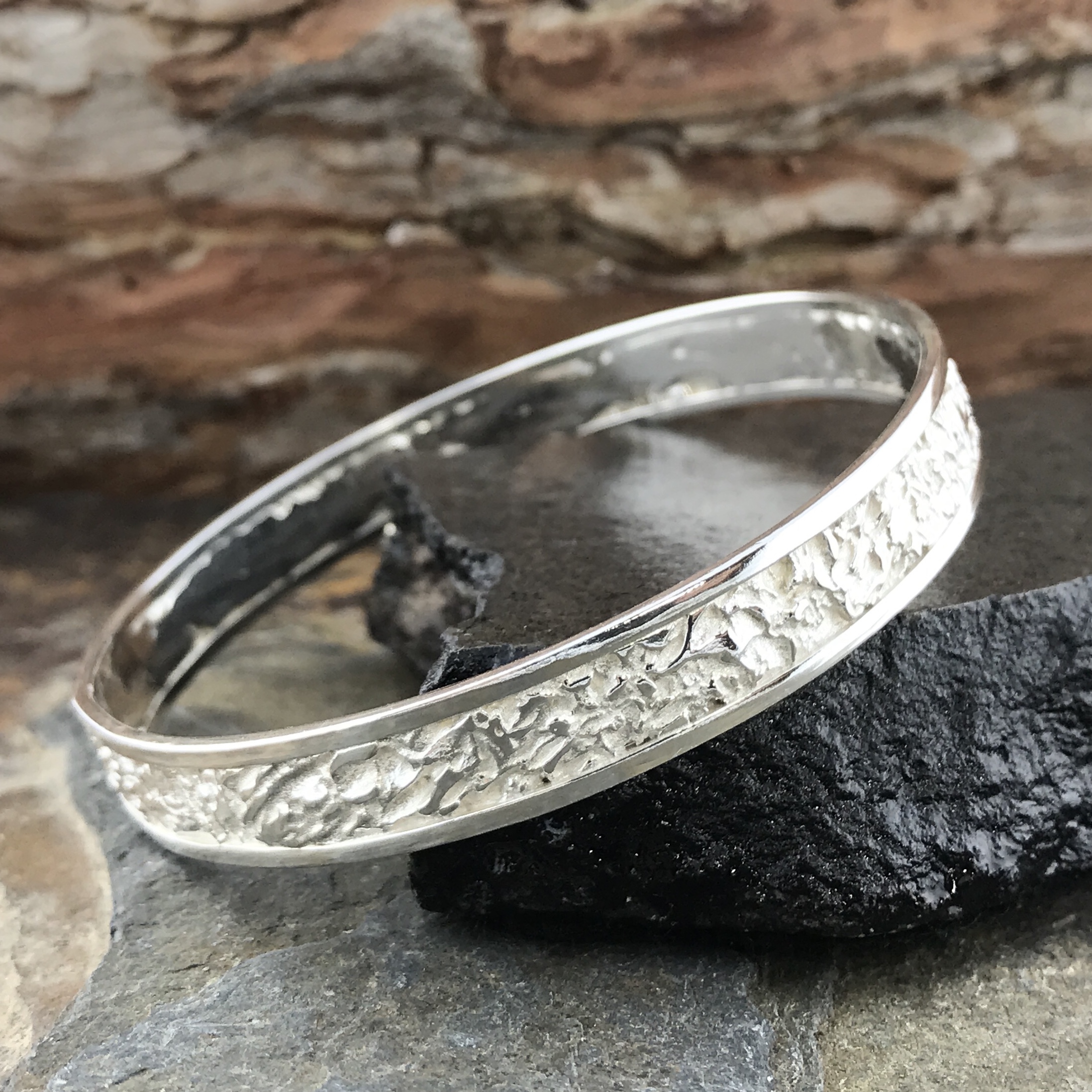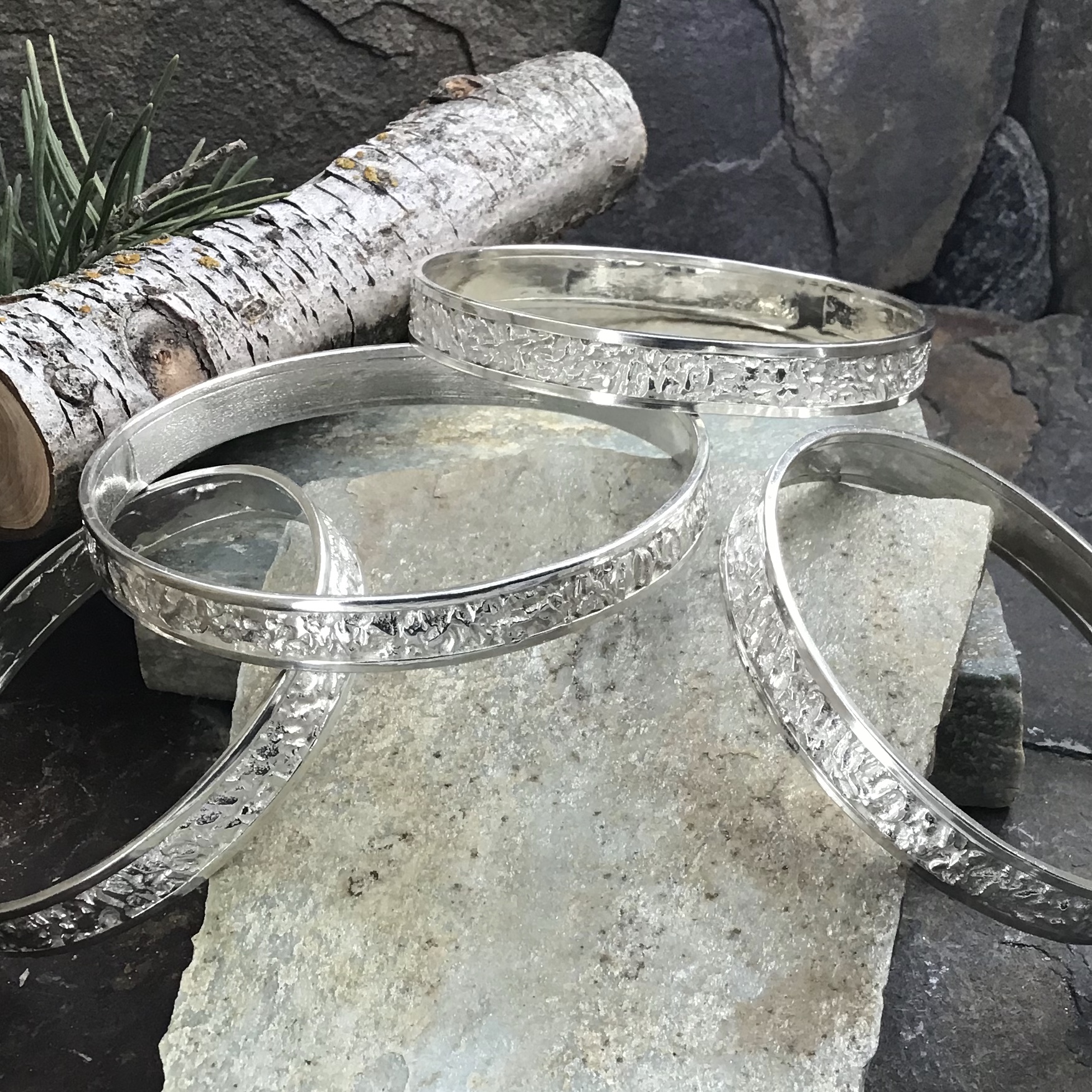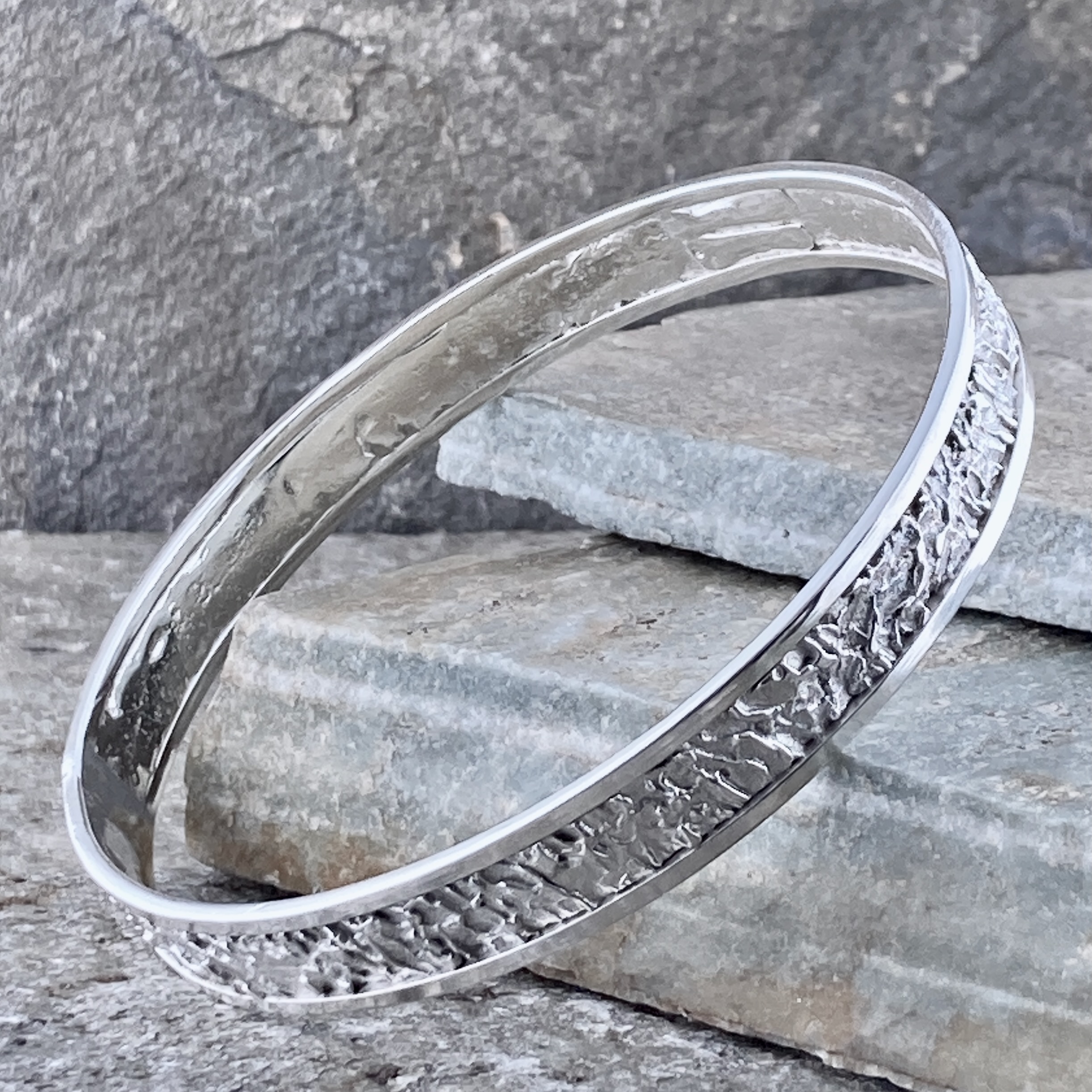 Argentium 940 silver is hypoallergenic and nickel-free. It stays bright longer than sterling silver. It is also harder, so it works well for a strong everyday bangle.