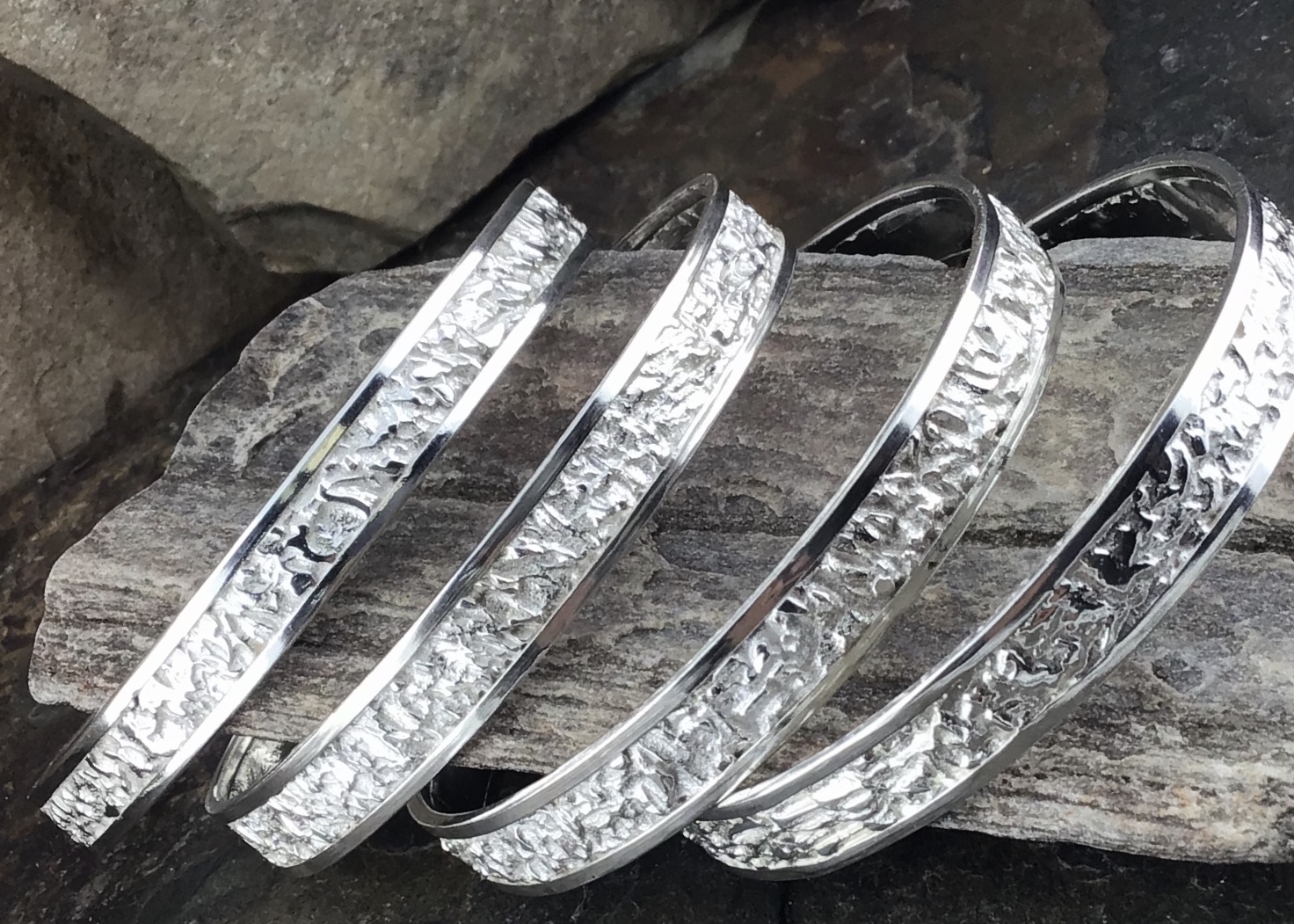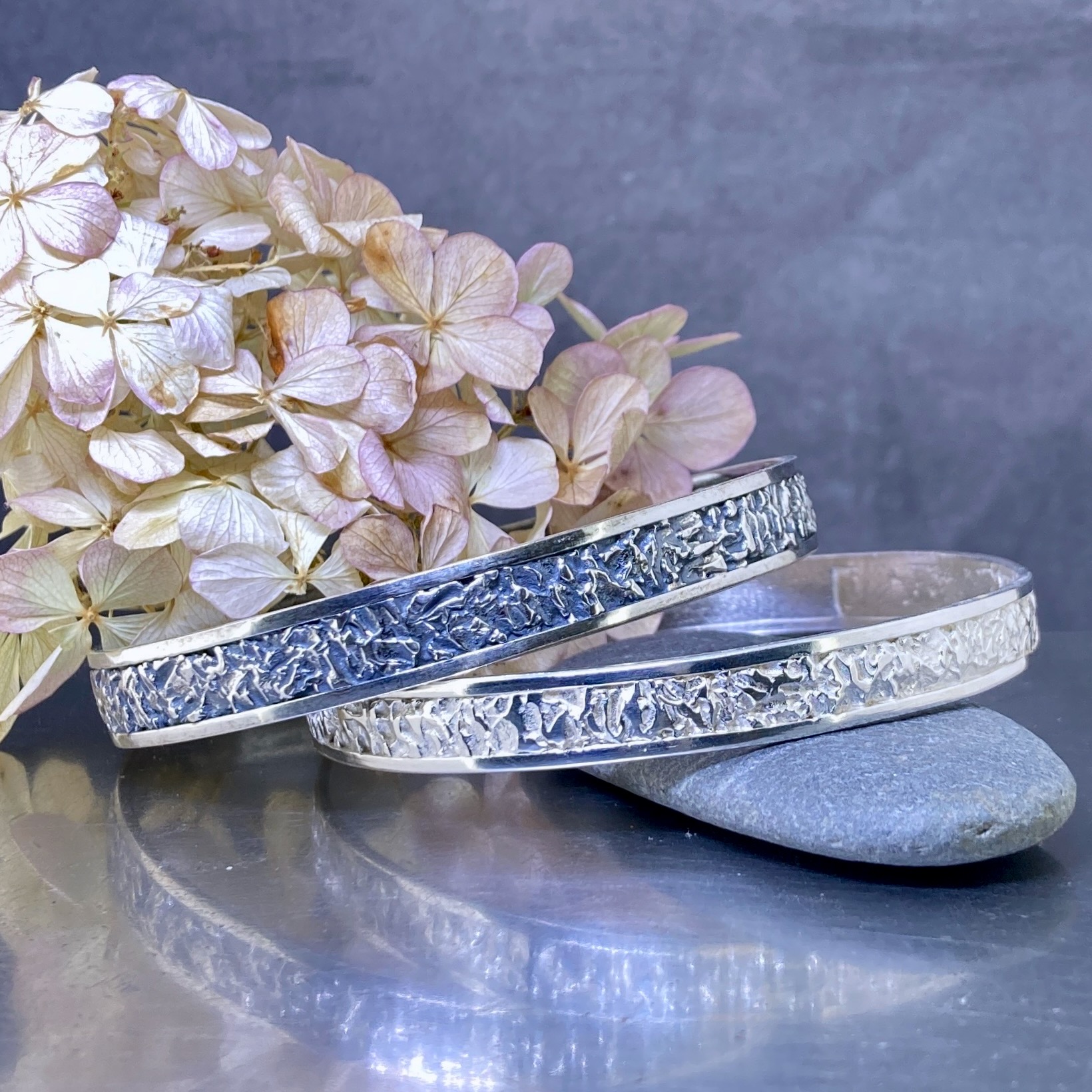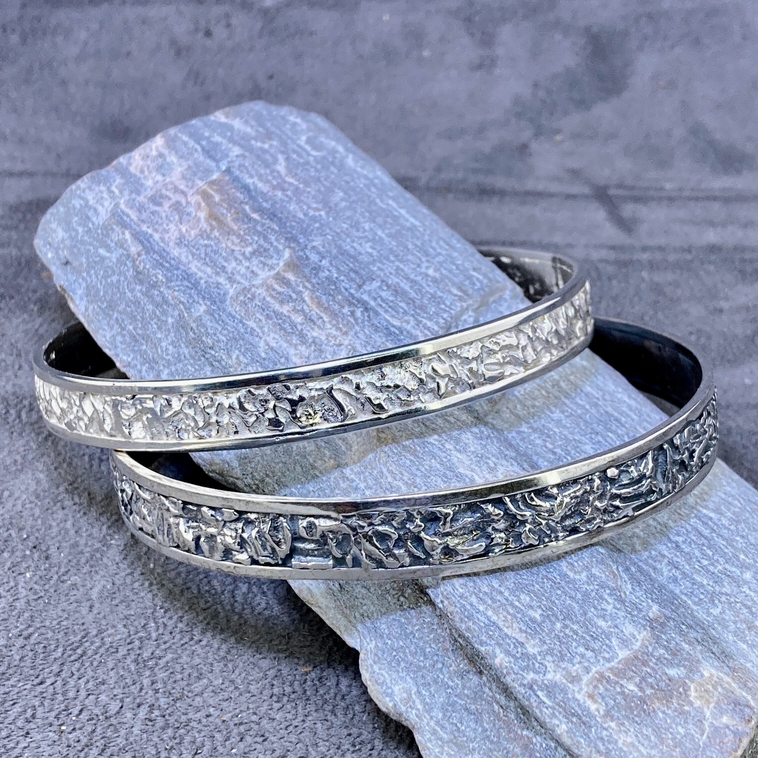 Argentium 940 silver is hypoallergenic and nickel-free. It stays bright longer than sterling silver. It is also harder, so it works well for a strong everyday bangle.