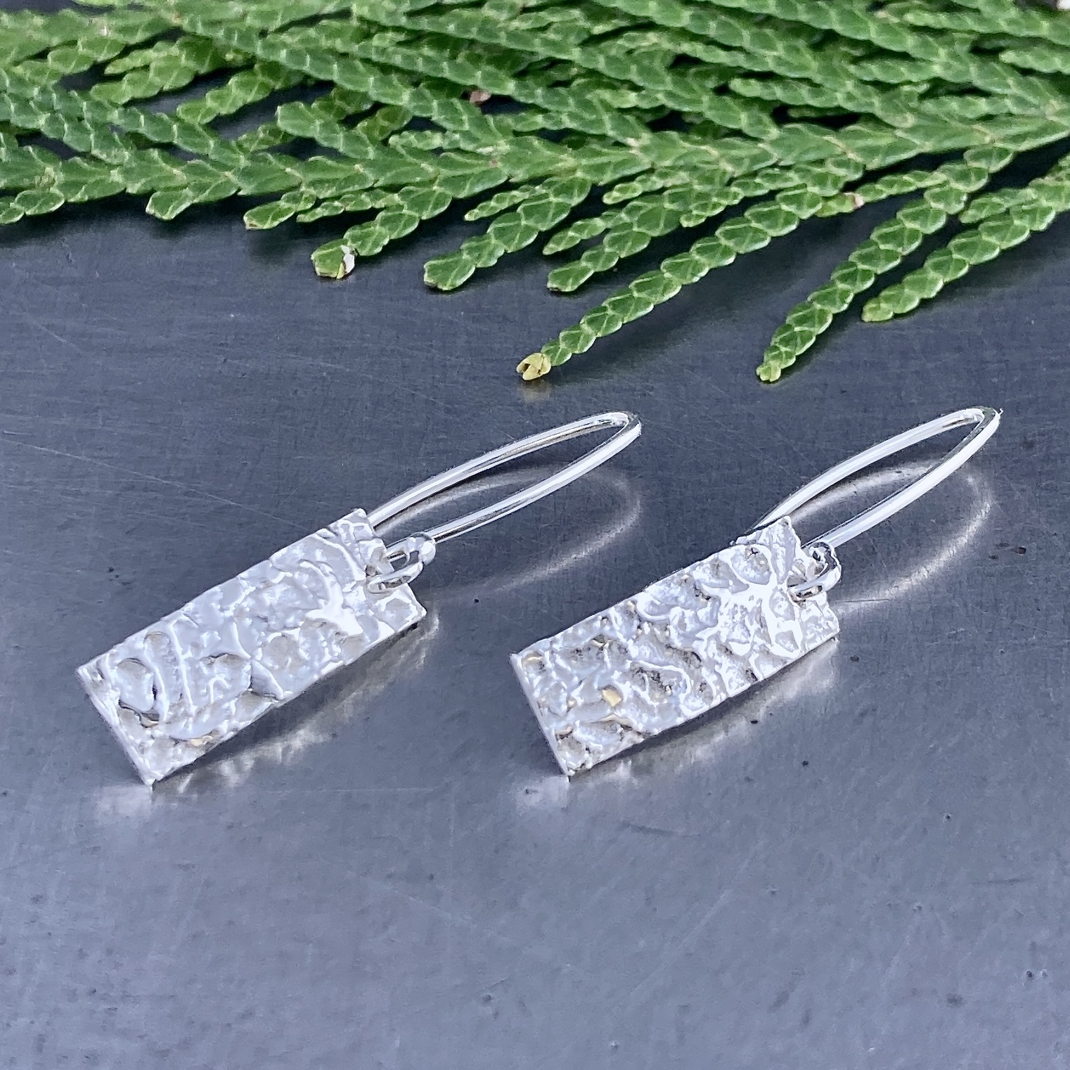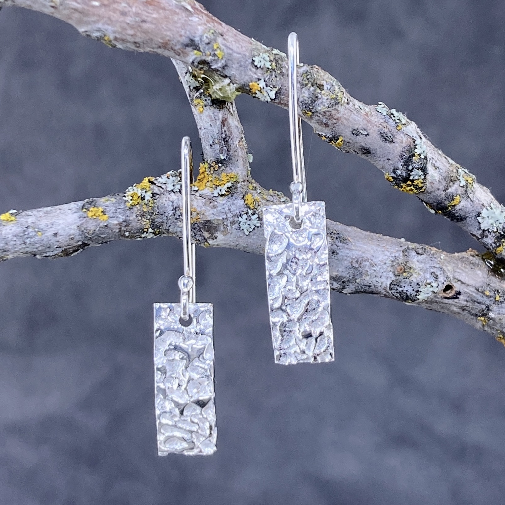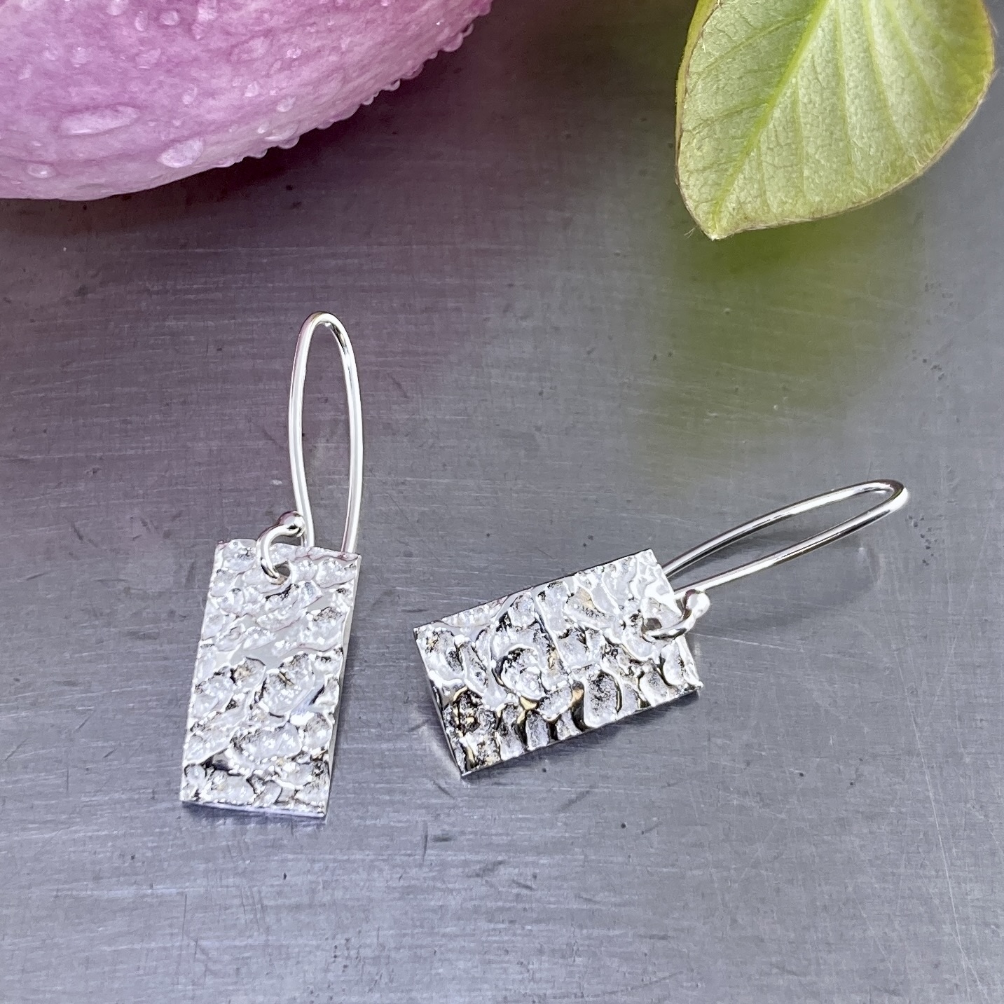 Lunar rectangle – dangle earring.  Argentium silver melted and formed to look like the surface of the moon.  The elegant simplicity of this clean rectangle design is perfect for everyday.