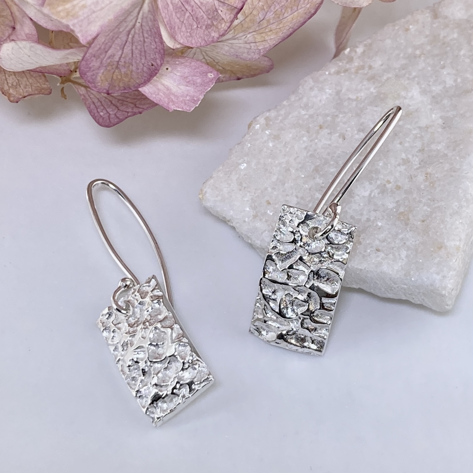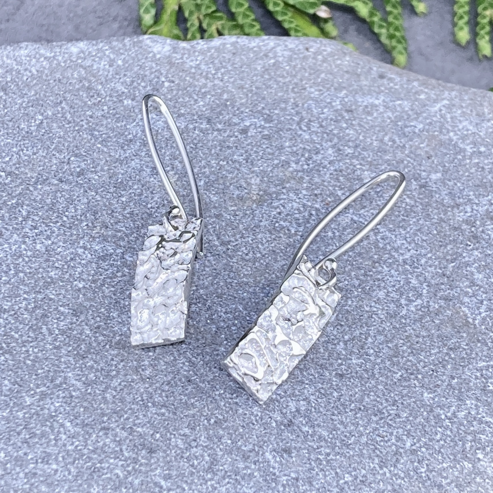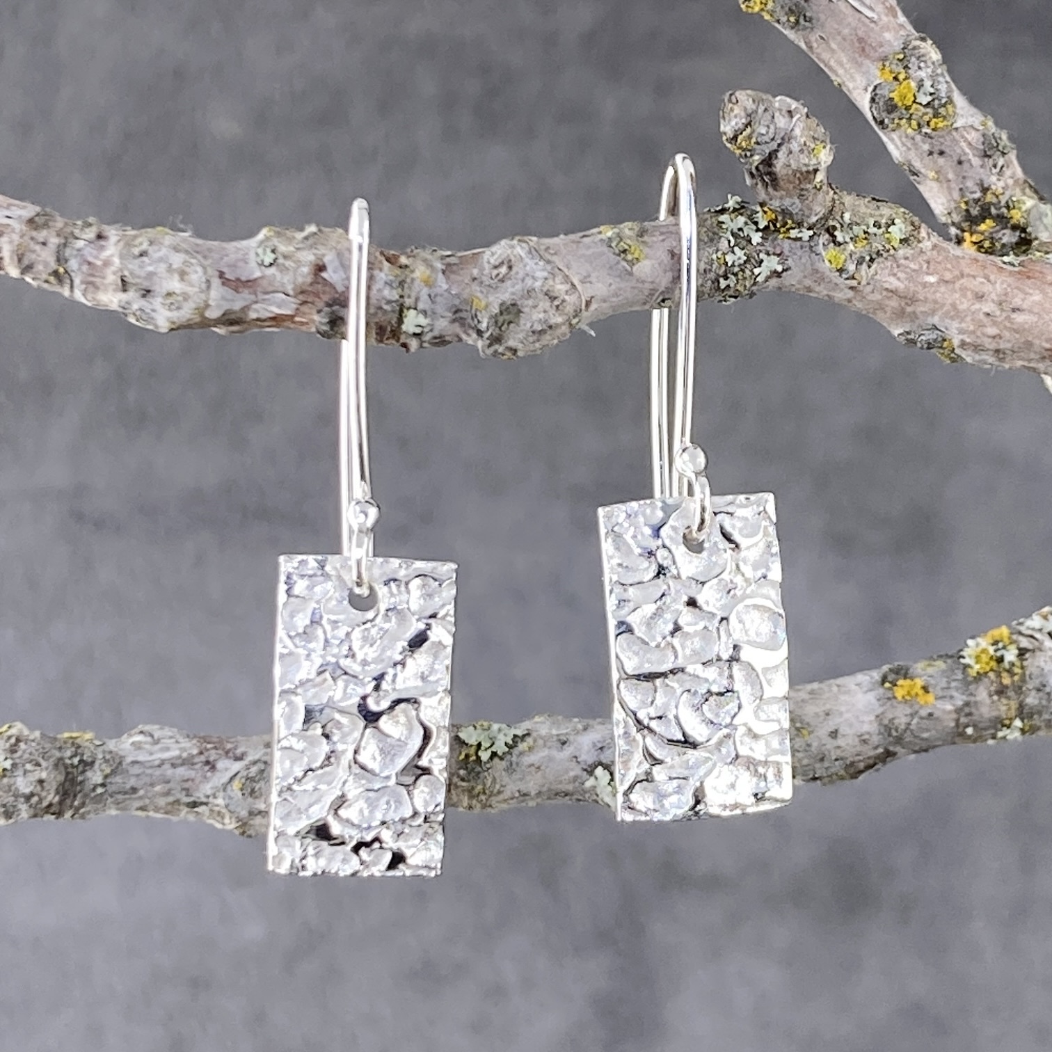 Lunar rectangle – dangle earring.  Argentium silver melted and formed to look like the surface of the moon.  The elegant simplicity of this clean rectangle design is perfect for everyday.