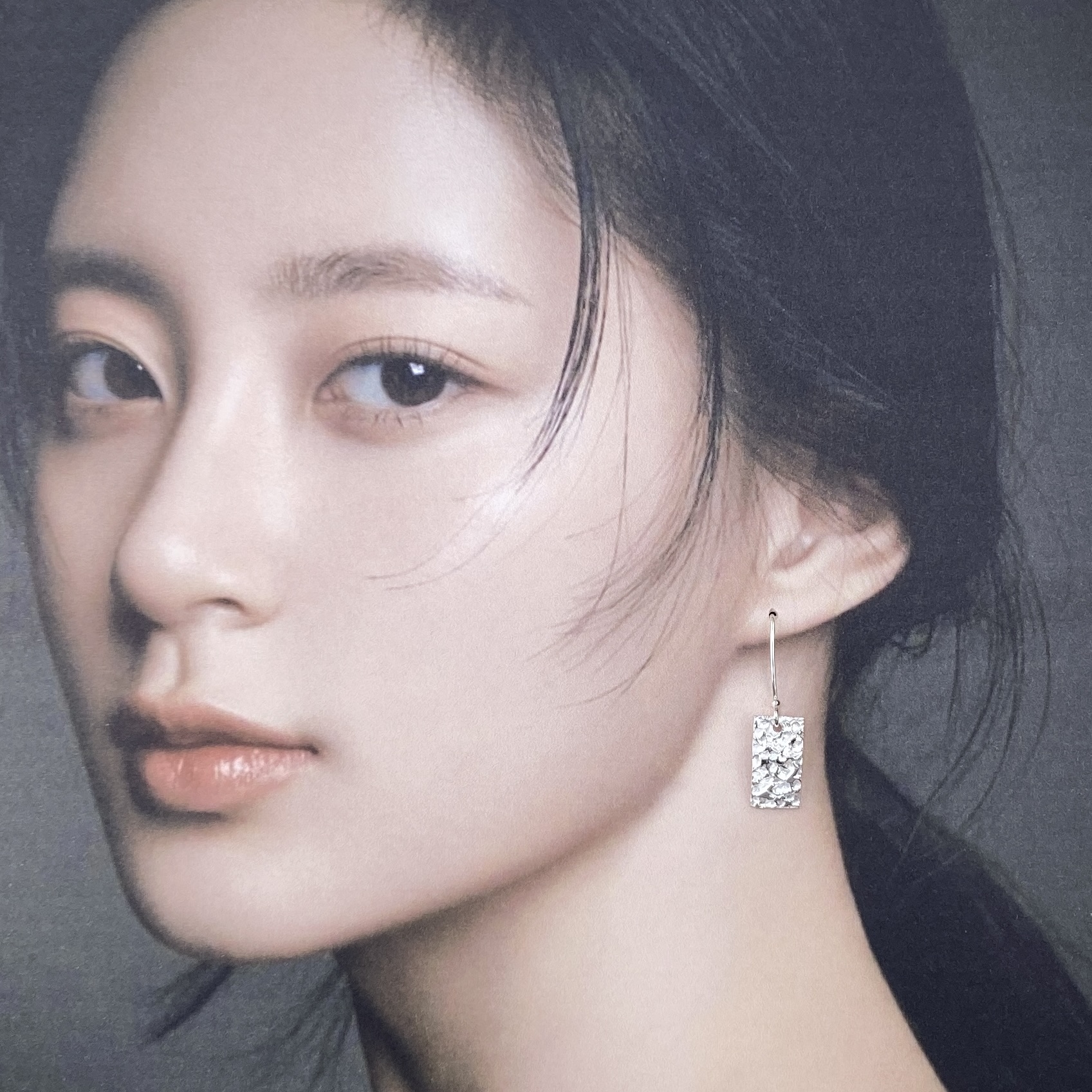 Lunar rectangle – dangle earring.  Argentium silver melted and formed to look like the surface of the moon.  Nickel free.