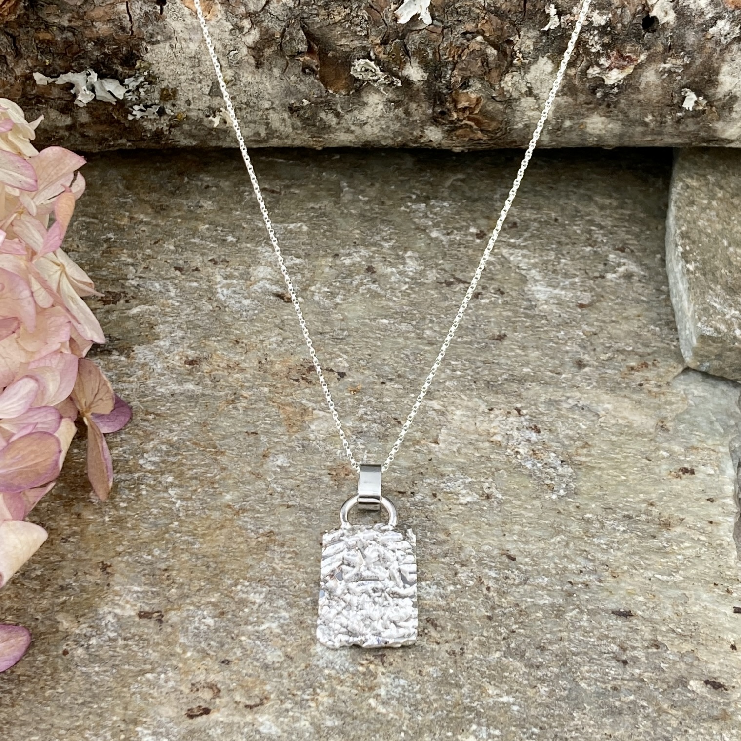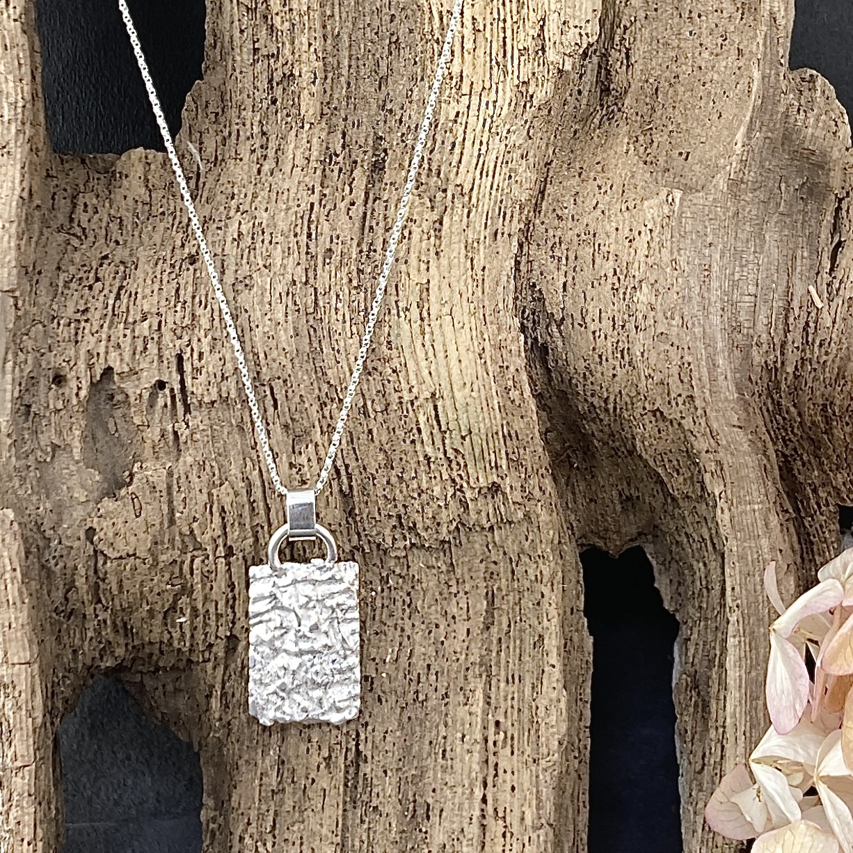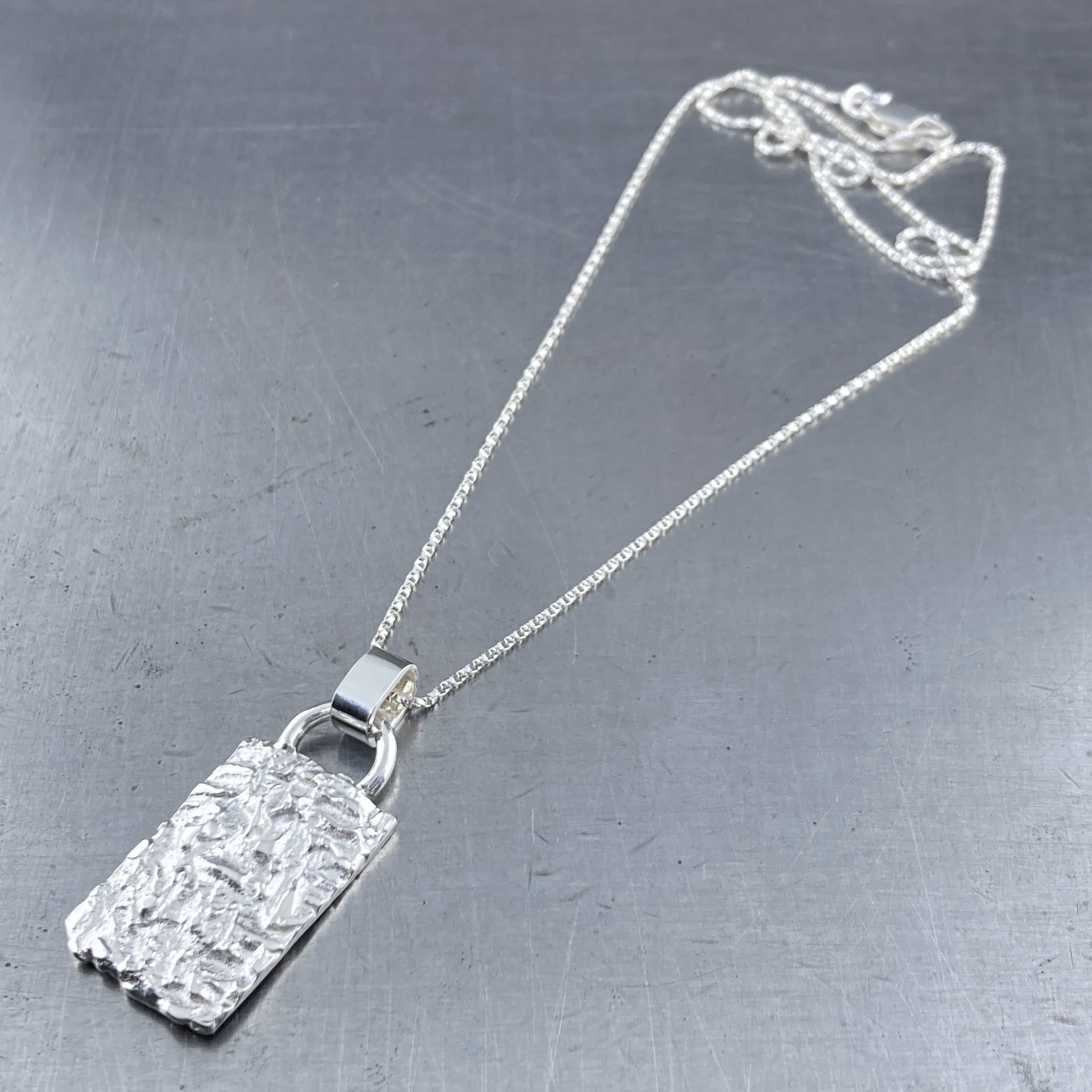 Included with the pendant is an 18″ Sterling Silver Twisted box chain