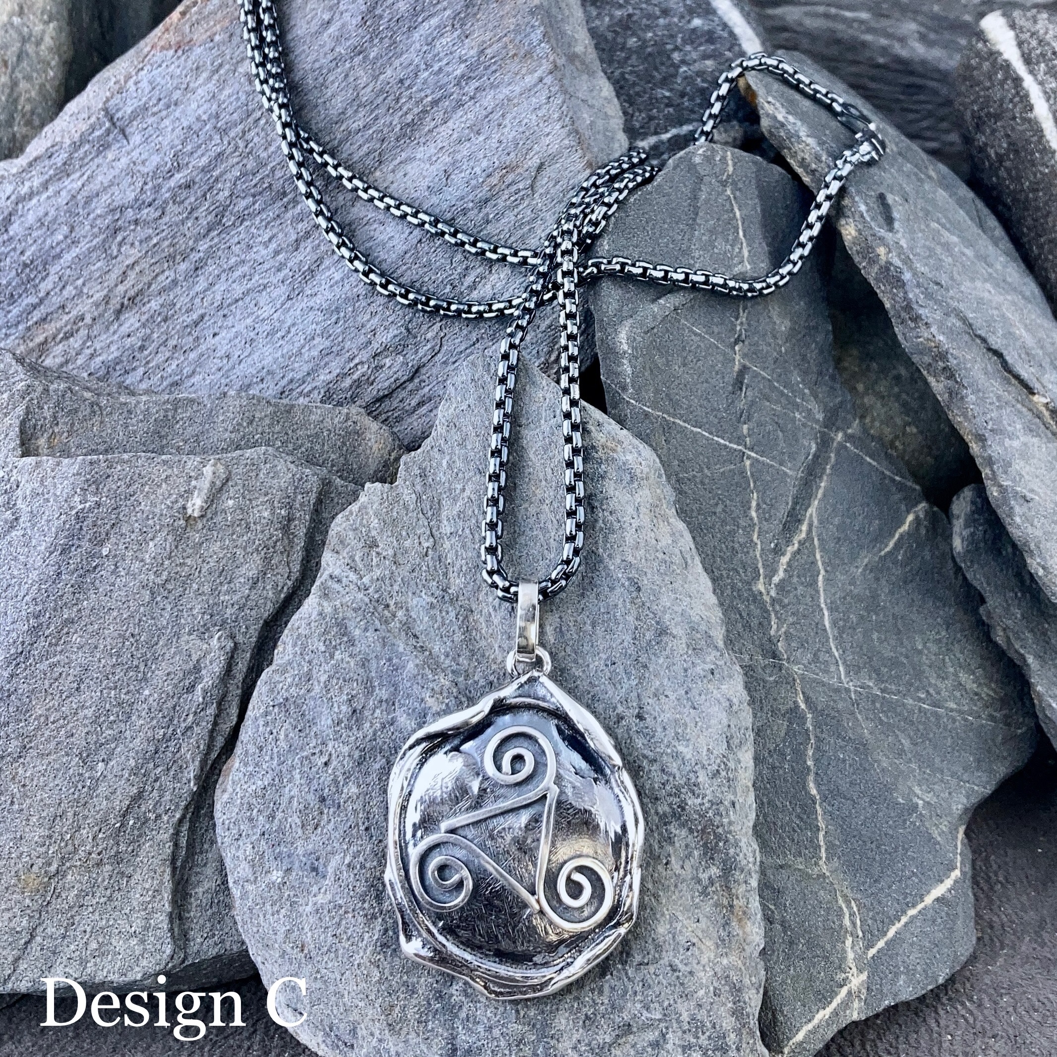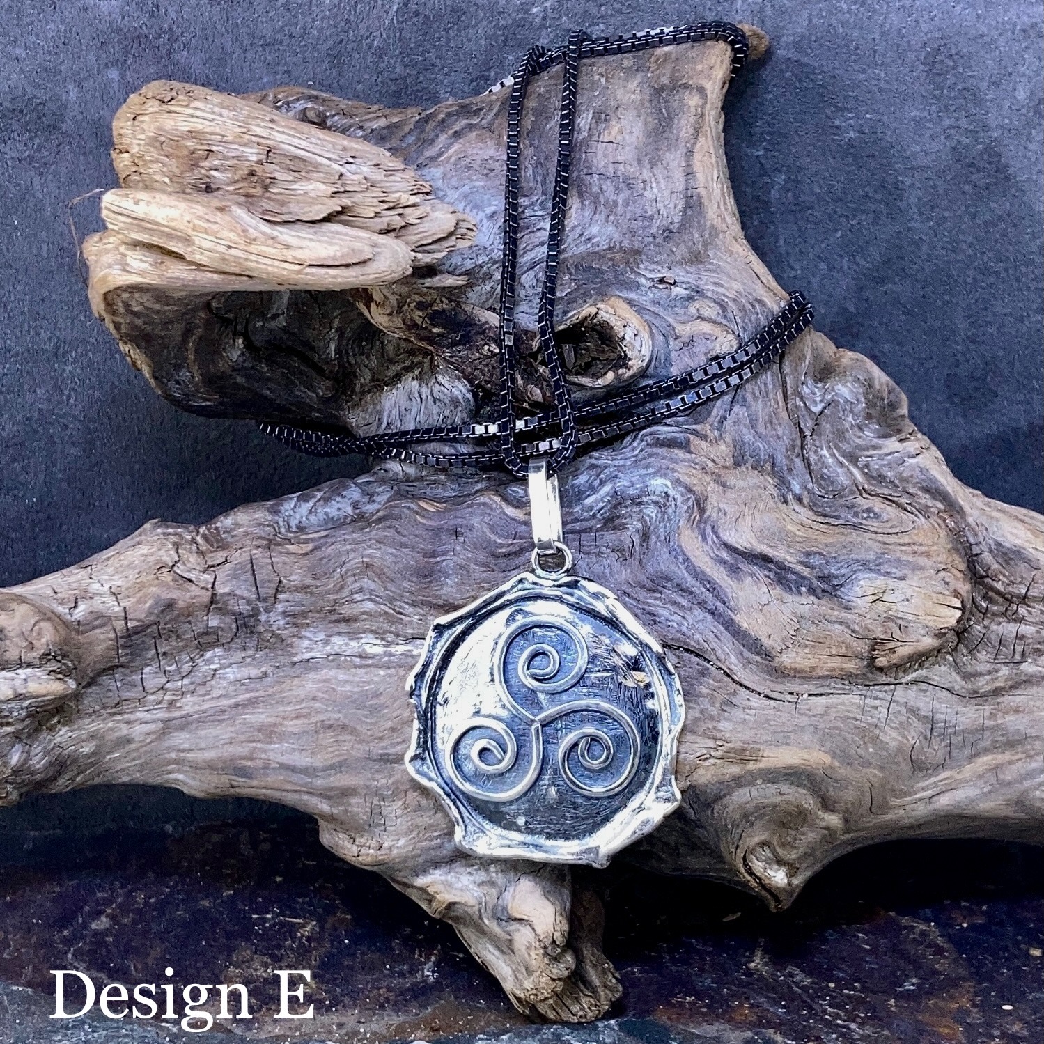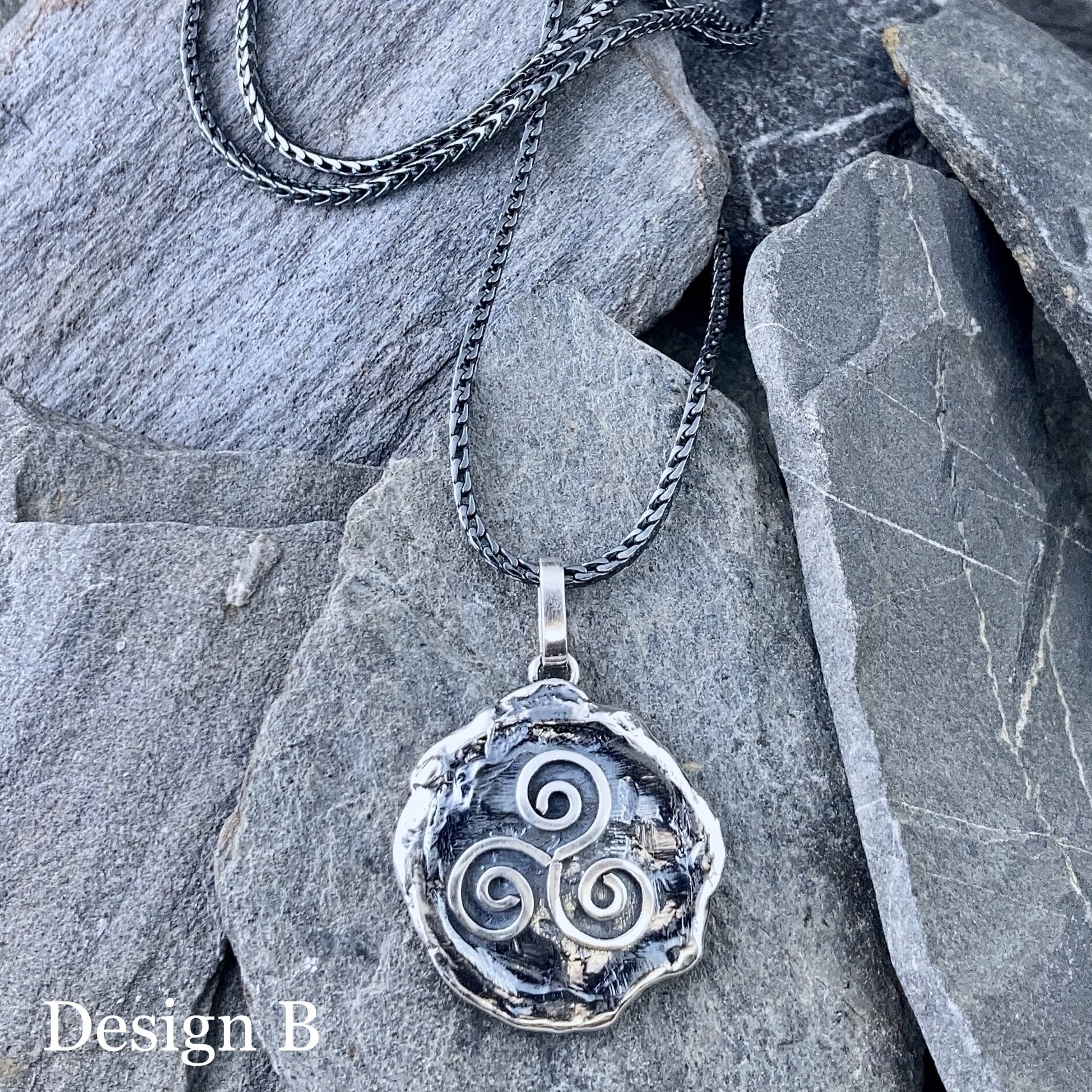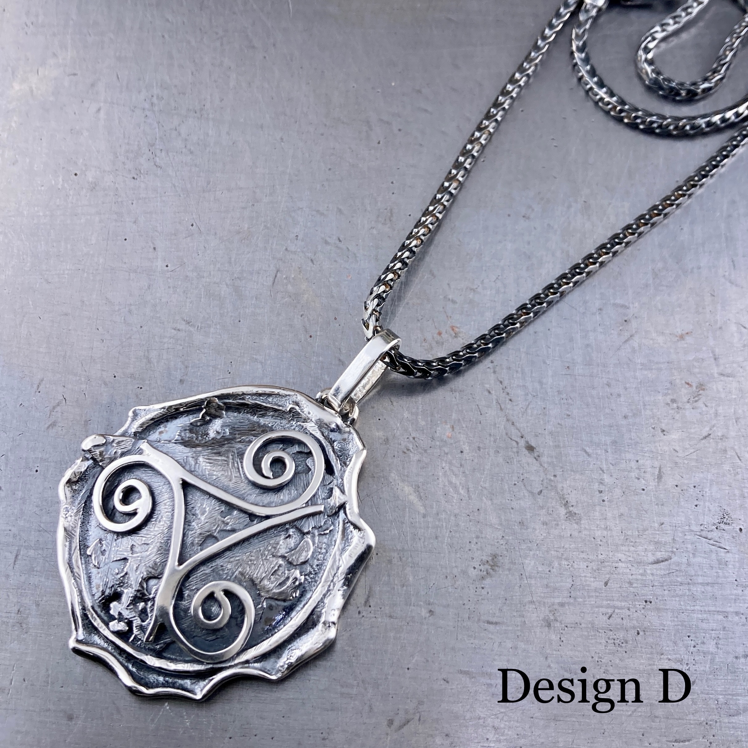 I form each pendant from melted Argentium Silver 940. First, I create the wax-seal boulder shape. Then I cut and shape the Triskele from solid silver wire. After forming the curves, I solder the symbol to the prepared surface. Finally, I apply an antique finish to both the pendant and the chain so they match.