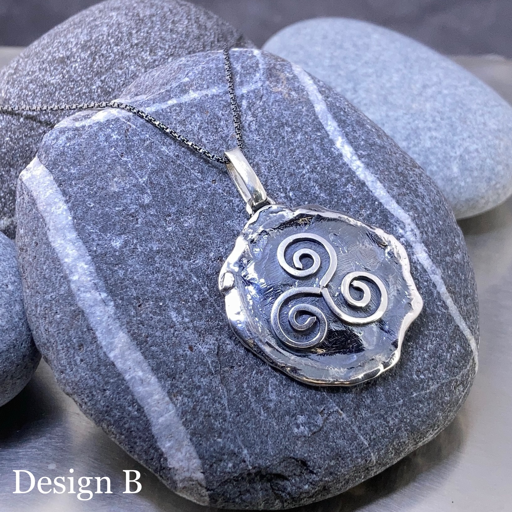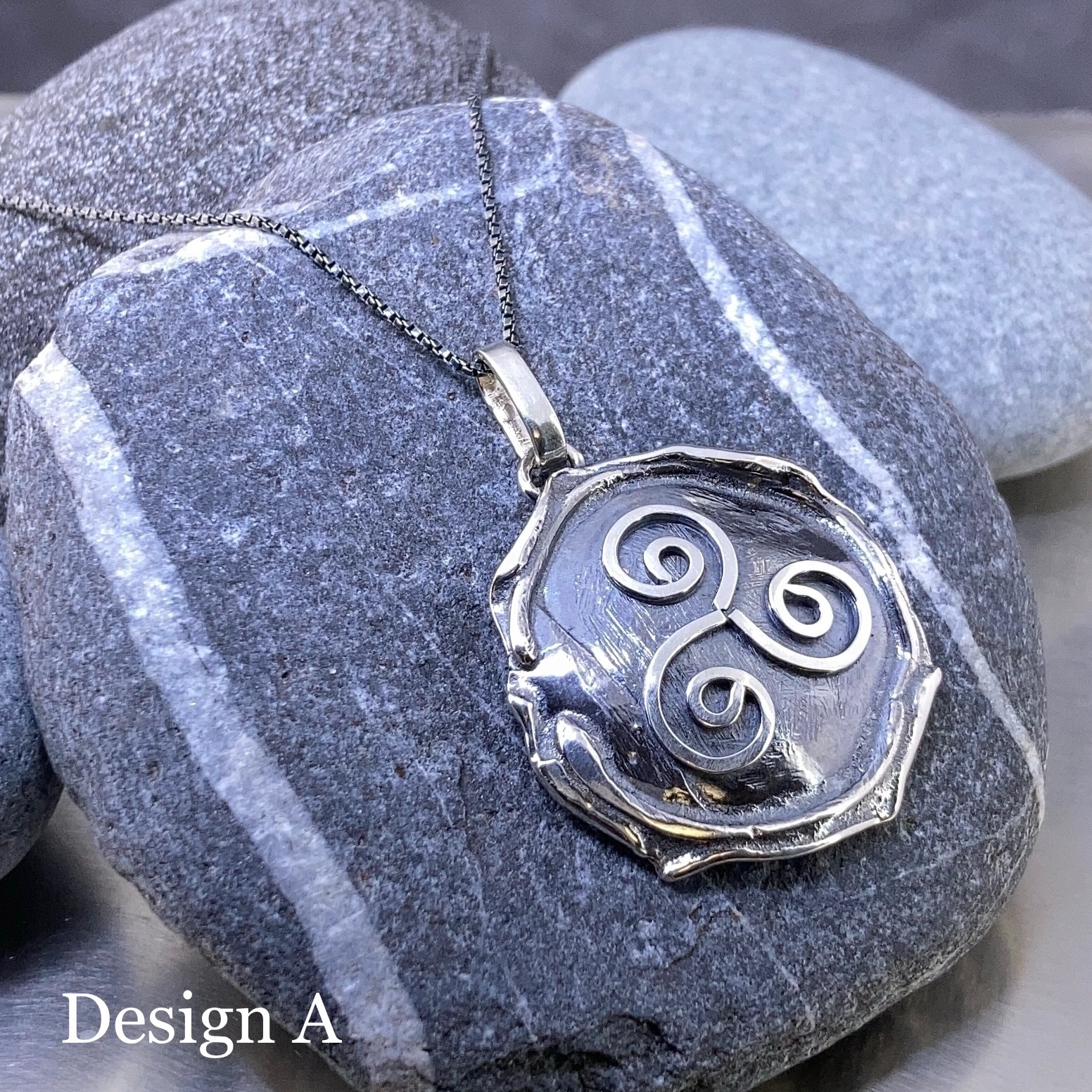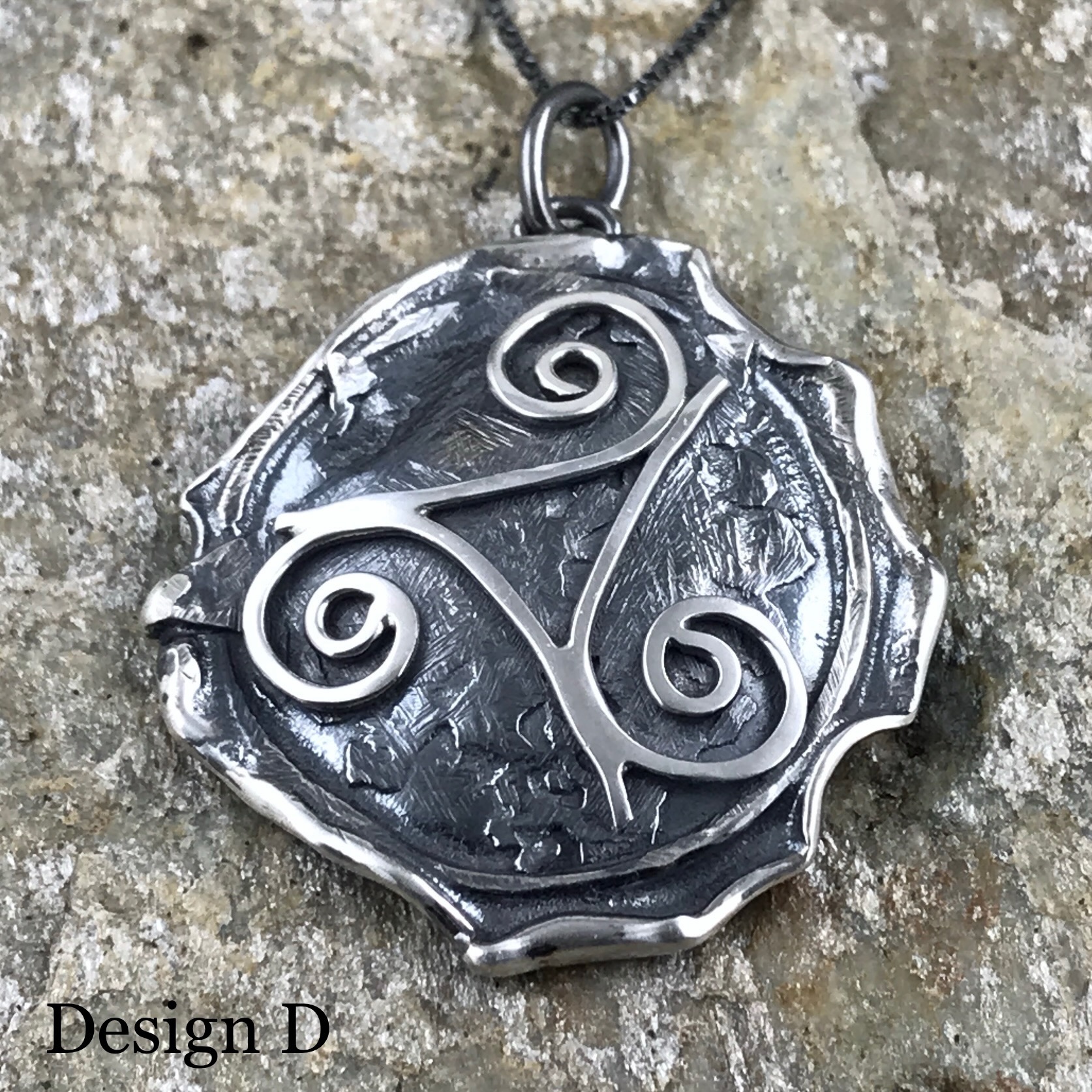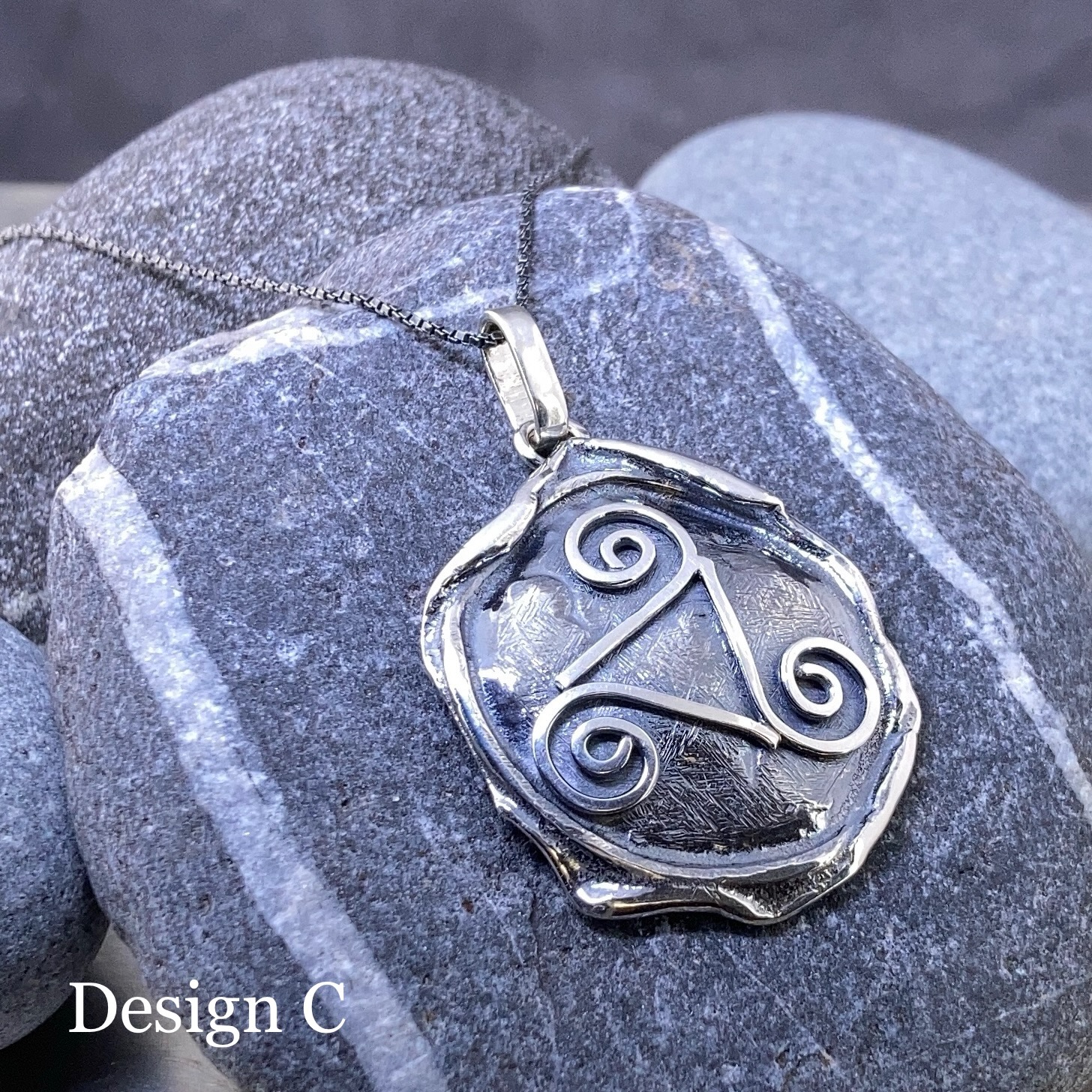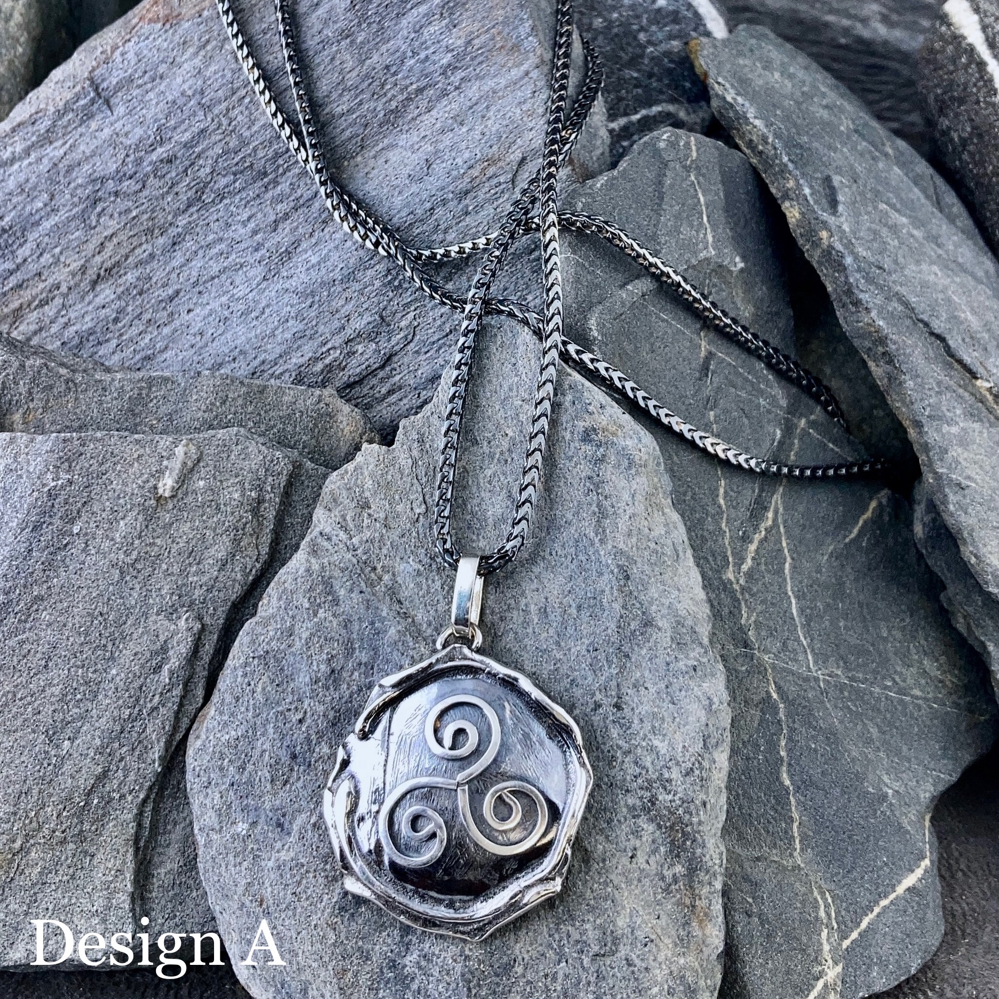 I form each pendant from melted Argentium Silver 940. First, I create the wax-seal boulder shape. Then I cut and shape the Triskele from solid silver wire. After forming the curves, I solder the symbol to the prepared surface. Finally, I apply an antique finish to both the pendant and the chain so they match.