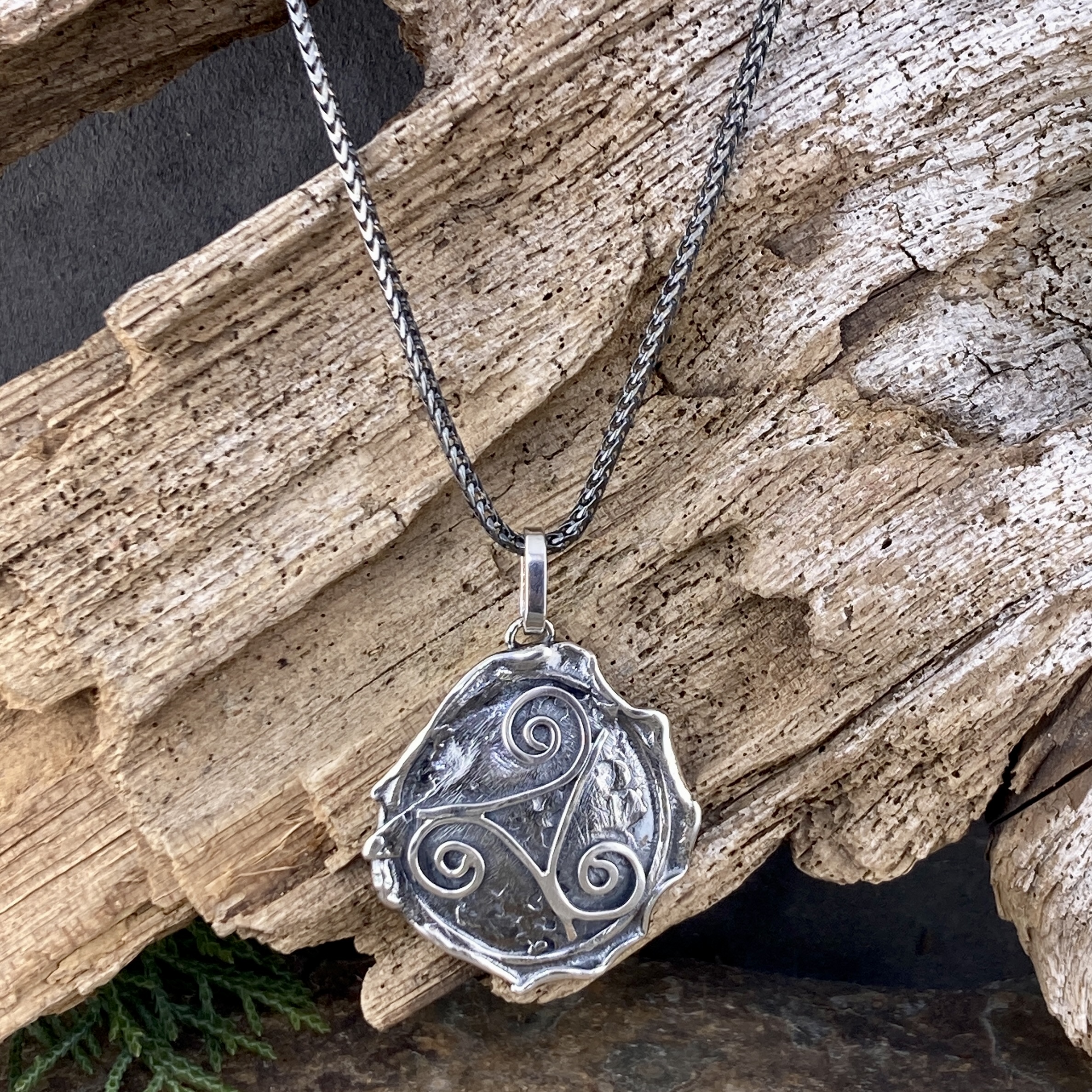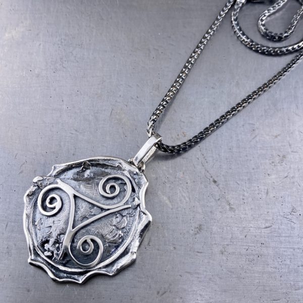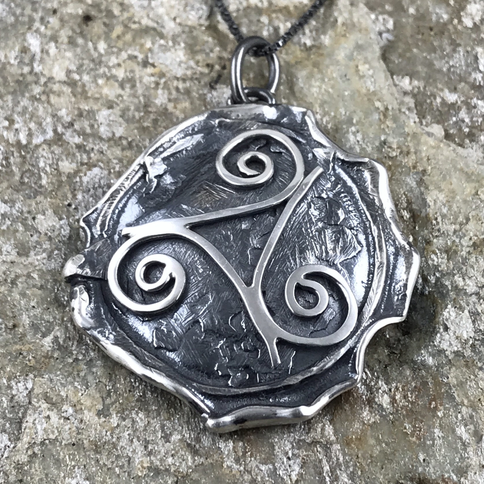Melted boulder (wax seal design) with a Celtic Triskele symbol. This is a Celtic design symbolizing the belief that everything important comes in threes. It is connected to ‘Harmony’ and ‘Earth’. I make the design by cutting and shaping Argentium Silver wire and then carefully soldering it to a melted Argentium boulder that I have prepared.