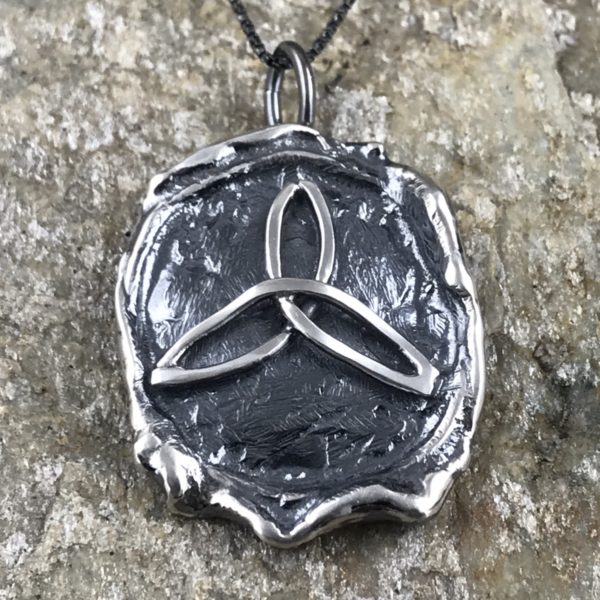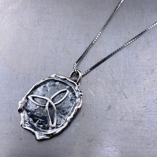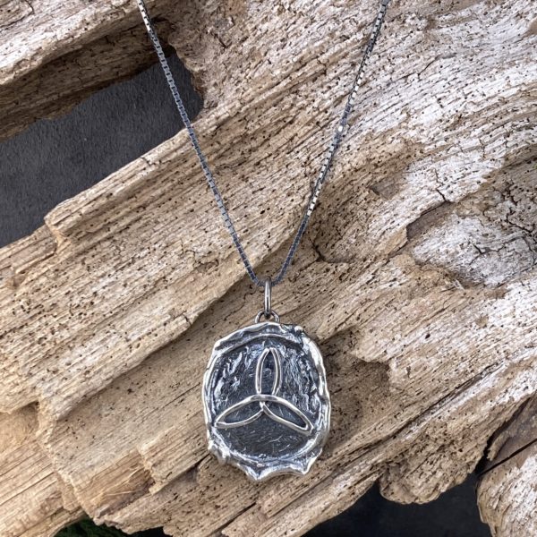 Melted boulder (was seal) with a trinity knot.  This Celtic design represents the Mother, the maiden and the Crone – the three life cycles of women.  I cut, bend and fuse the Trinity design, before carefully soldering it to the melted Argentium Silver boulder I have prepared.  And then I antique both the pendant and the chain.