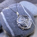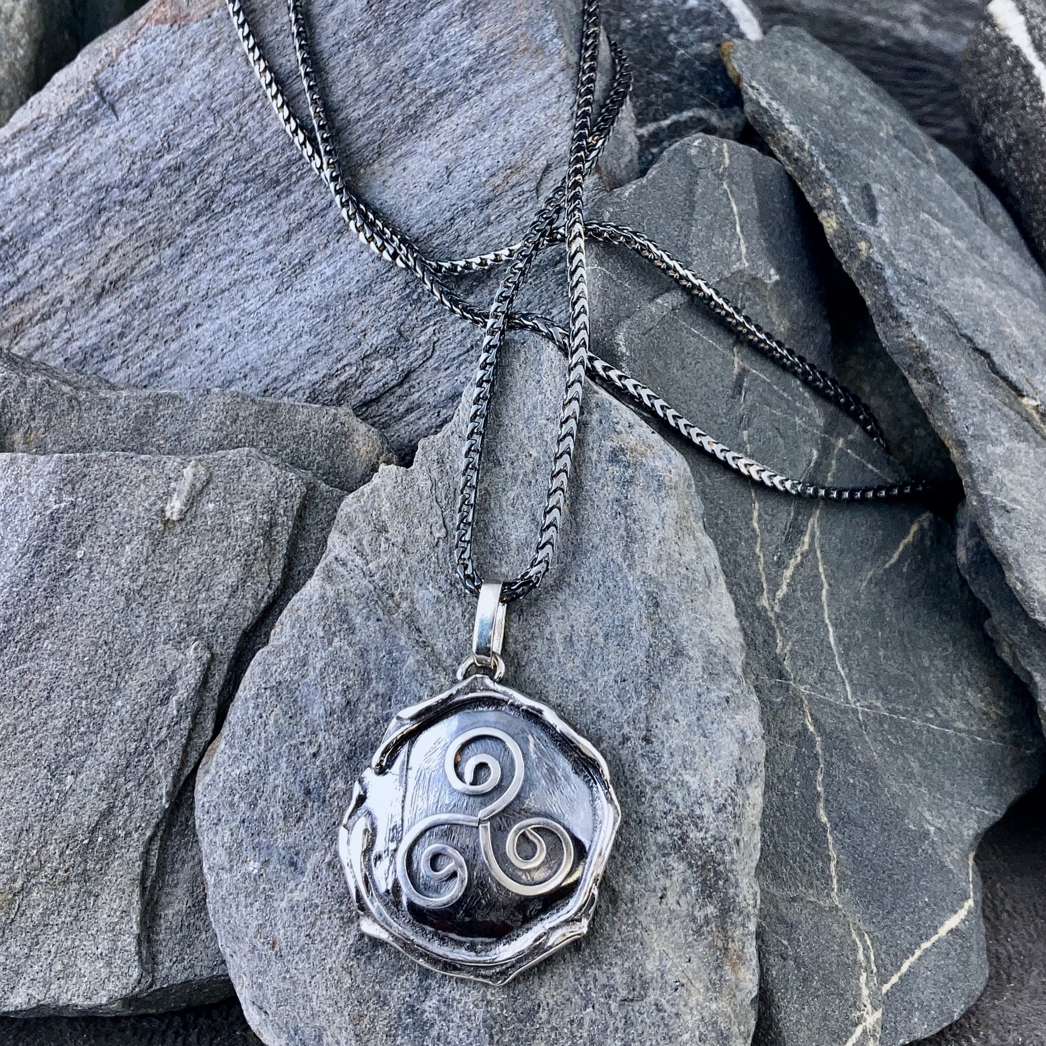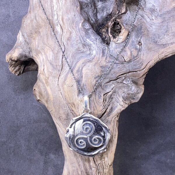 Melted boulder (wax seal design) with a Celtic Triskele symbol.  This is a Celtic design symbolizing the belief that everything important comes in threes.  It is connected to ‘Harmony’ and ‘Earth’.  I make the design by cutting and shaping Argentium Silver wire into a Triskele symbol. Then I carefully solder this symbol to a melted Argentium boulder that I have prepared.