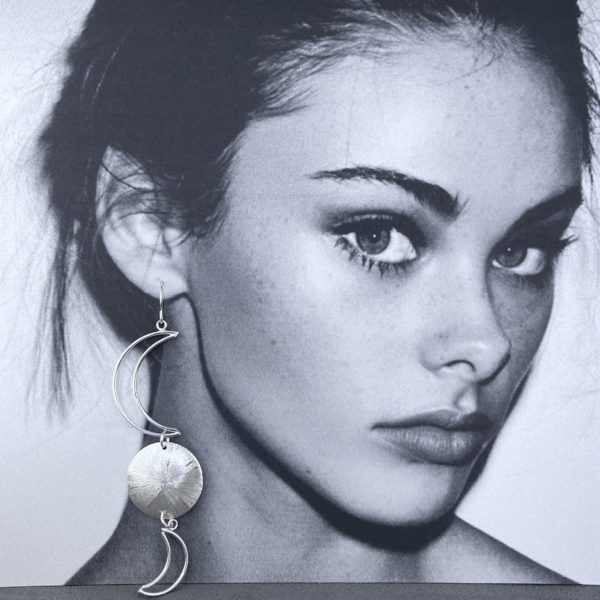 A long earring – but not heavy at all!  Showing the crescent moon waxing and waning, with a full moon in the middle.  I hand etched the full moon with rays for added detail and sparkle.