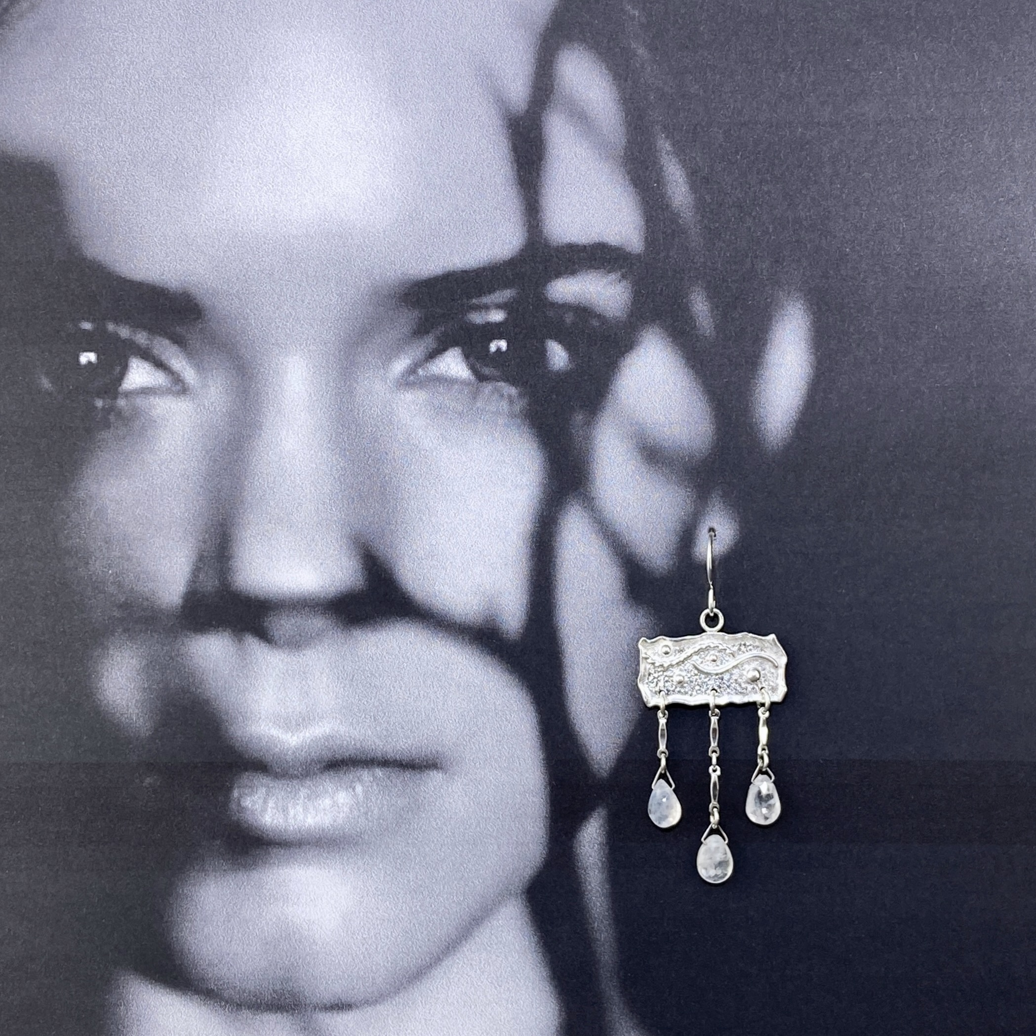 Moonstone teardrops accent a chandelier earring in the Water design group.