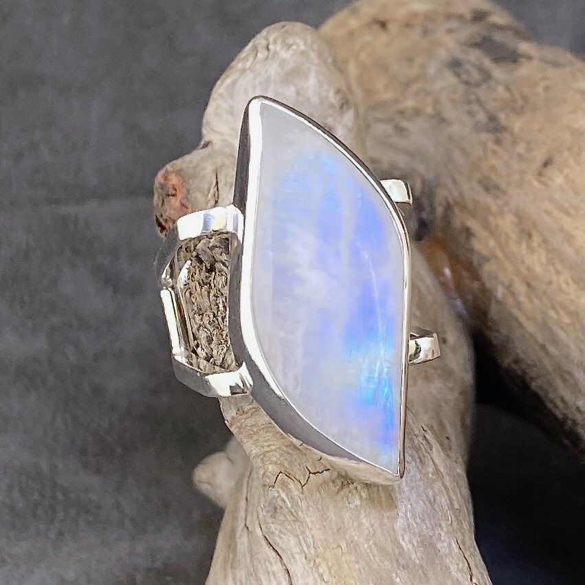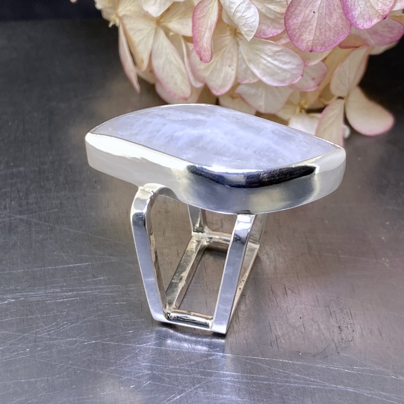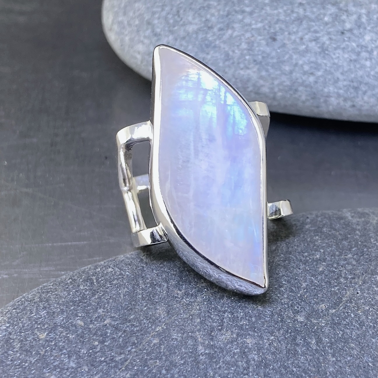 Moonstone Argentium Silver Ring Size 7.5 brings a sculptural edge to an ethereal gemstone. The square double-band design frames a large marquise Moonstone, creating a bold contrast between structure and shimmer.