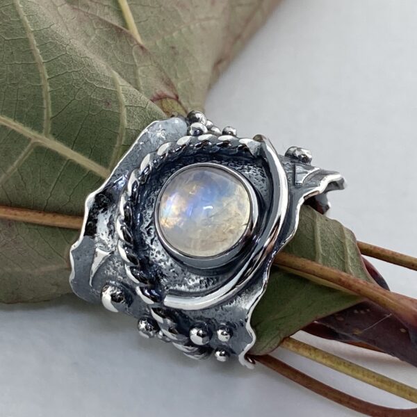 The Moonstone Ring Size 7.25 Argentium Silver Waves design reflects light and motion in harmony. A 3 carat cabochon Moonstone glows with a soft blue sheen, set in an antique silver band textured with gentle waves and pebbles. The wide surface allows the design to breathe, showing depth and flow with every movement.