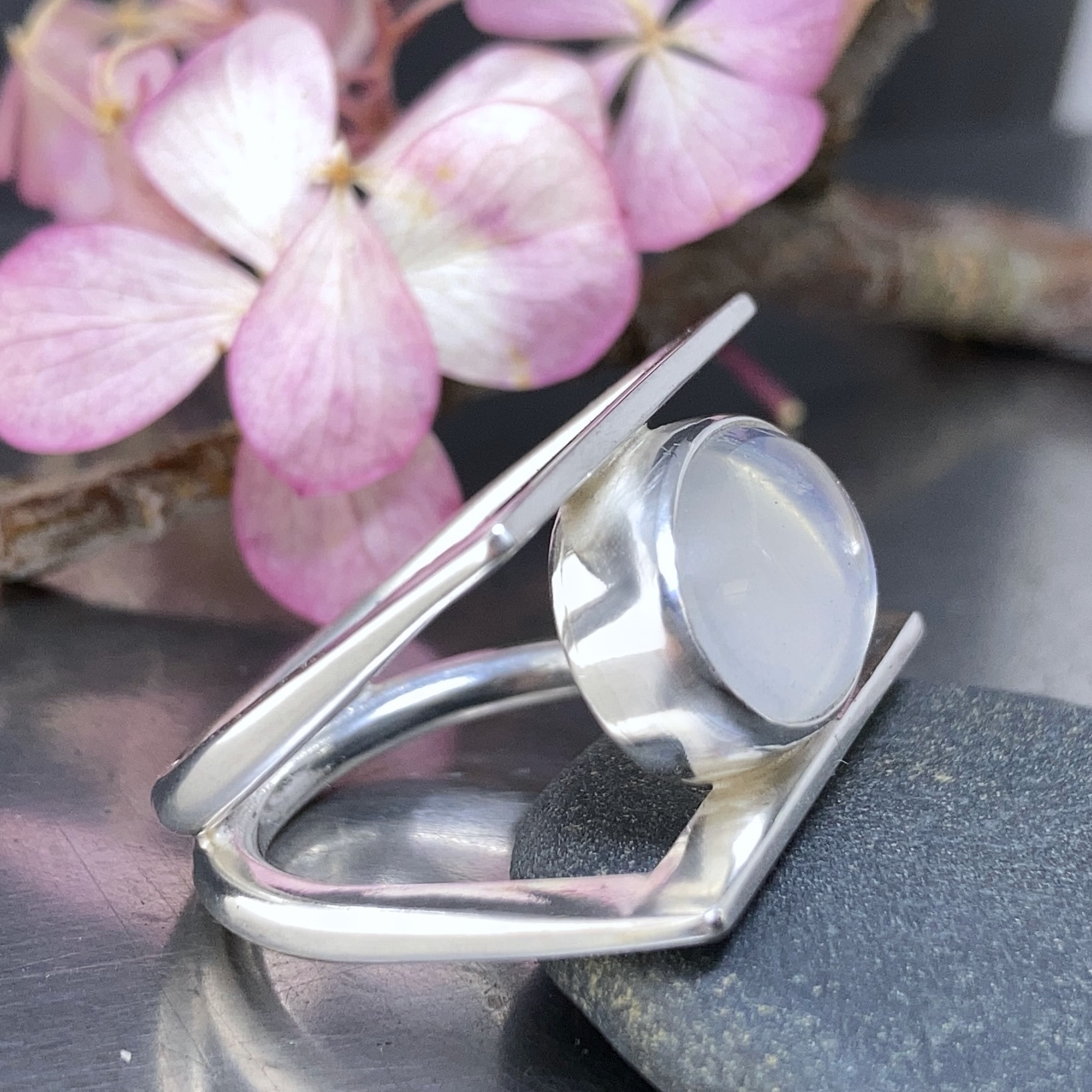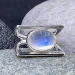 The Moonstone Argentium Silver Ring Size 8 embodies balance and form. Its Double-D band gives the piece architectural strength, while the natural gemstone adds quiet luminescence and depth.