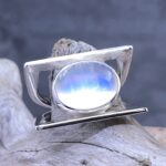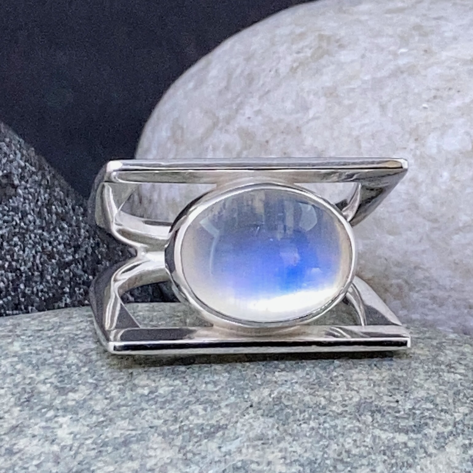 A 6-carat oval cabochon Moonstone is bezel set at the centre. The natural gem displays a soft internal glow — blue and silver reflections that shift as the ring moves. The simple, wide setting lifts the stone slightly, allowing the light to reveal its characteristic sheen.