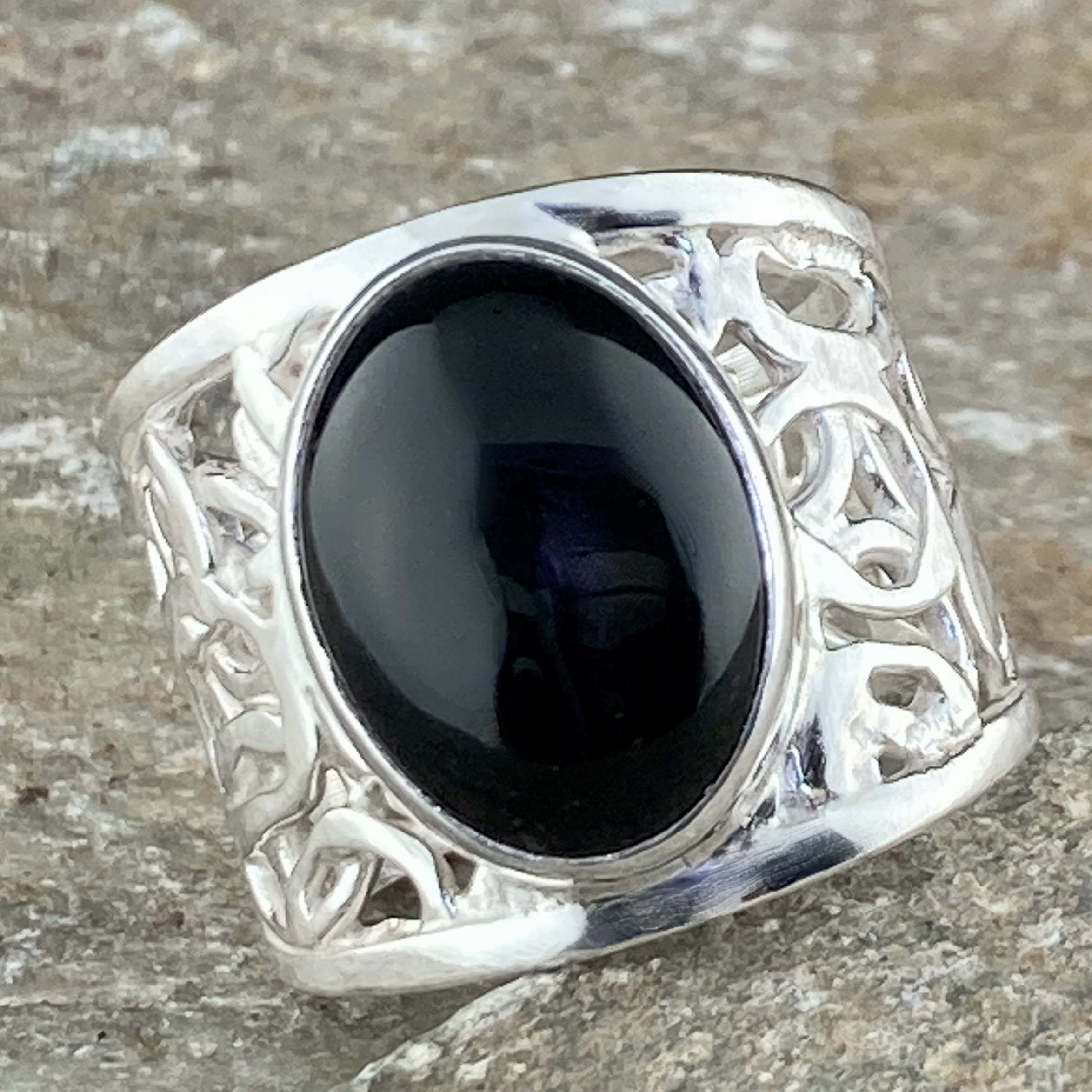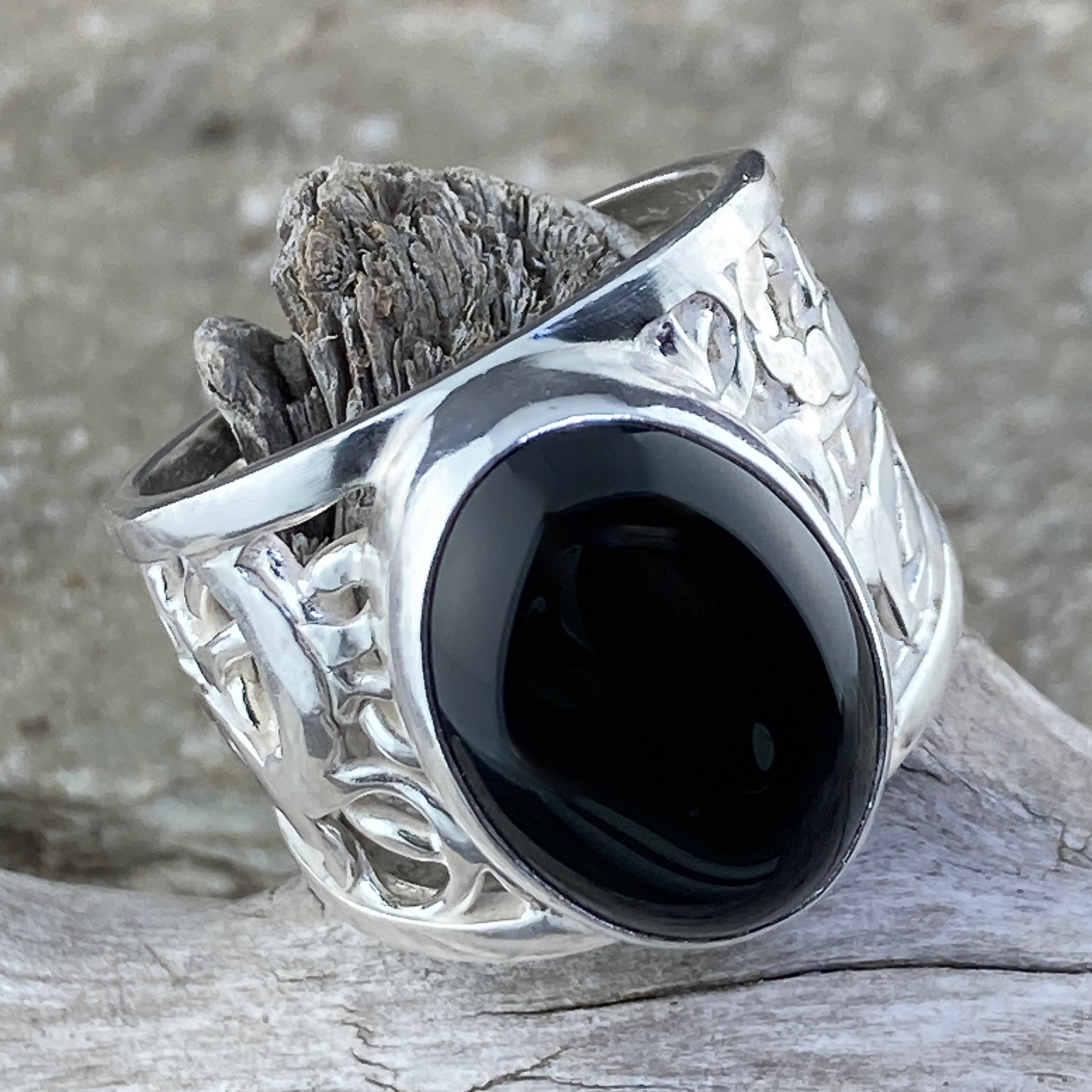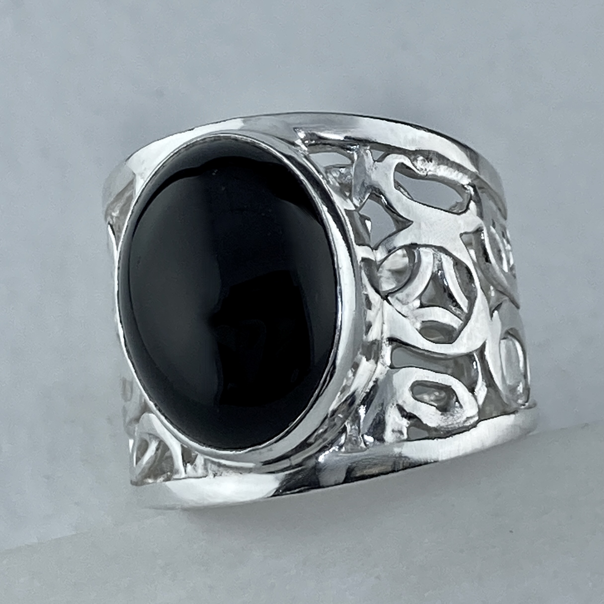 The gemstone is natural black Onyx, cut in an oval cabochon shape. Its deep tone contrasts beautifully with the bright silver surface. The bezel setting frames the stone cleanly and keeps it secure within the wide band.