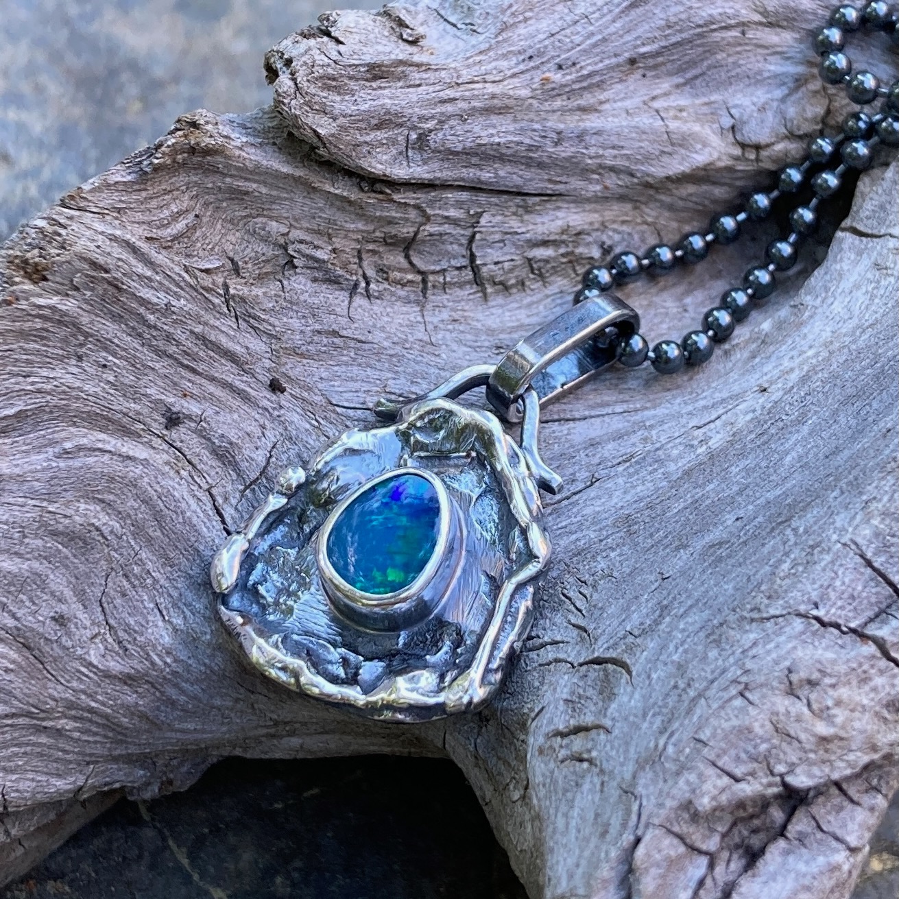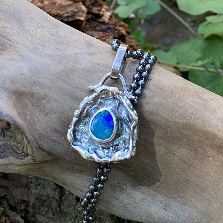 I select a gemstone to compliment the ‘wax seal’.  For this pendant I chose an Opal Doublet – .5 carats – from the Coober Pedy mines in Australia. I hand make the bezel for each gemstone, which I then soldered to the pendant base.  And then I solder on a bail.  Lots of polishing and shaping has to happen before the final antique patina can be applied.