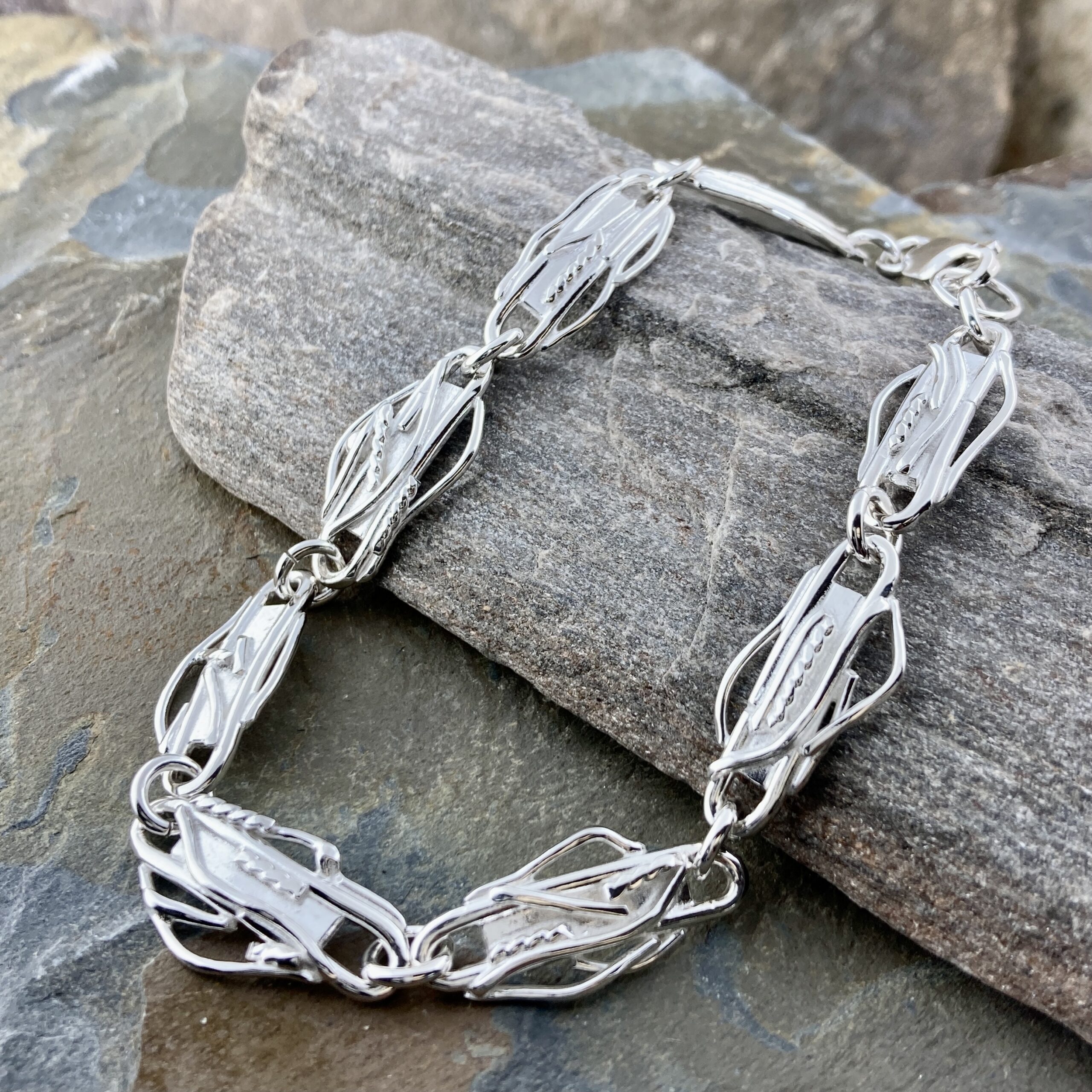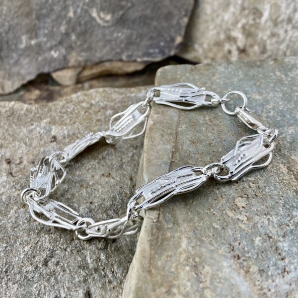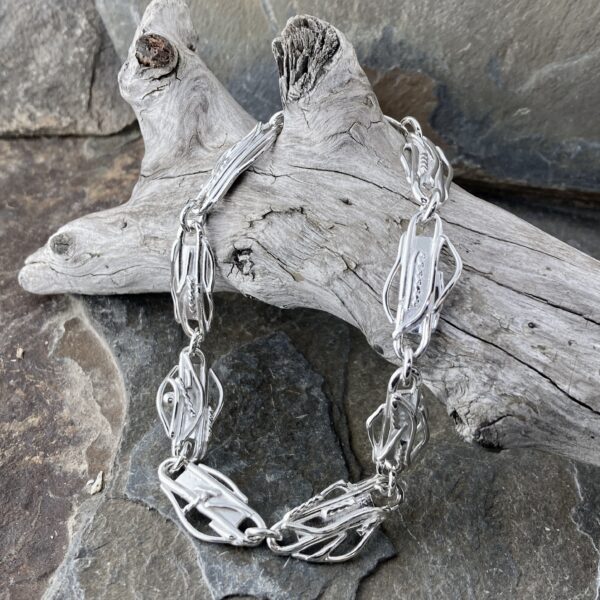 I handcraft the Twigs Panel Bracelet 9 inch in my BC studio. Each panel begins as 16–20 ga silver wire that I flatten, texture, and fuse into an open twig “forest.” I join the panels with soft, hidden hinges for comfortable movement and finish the piece in bright polished Argentium silver. Because every step is done by hand, each bracelet has its own character.