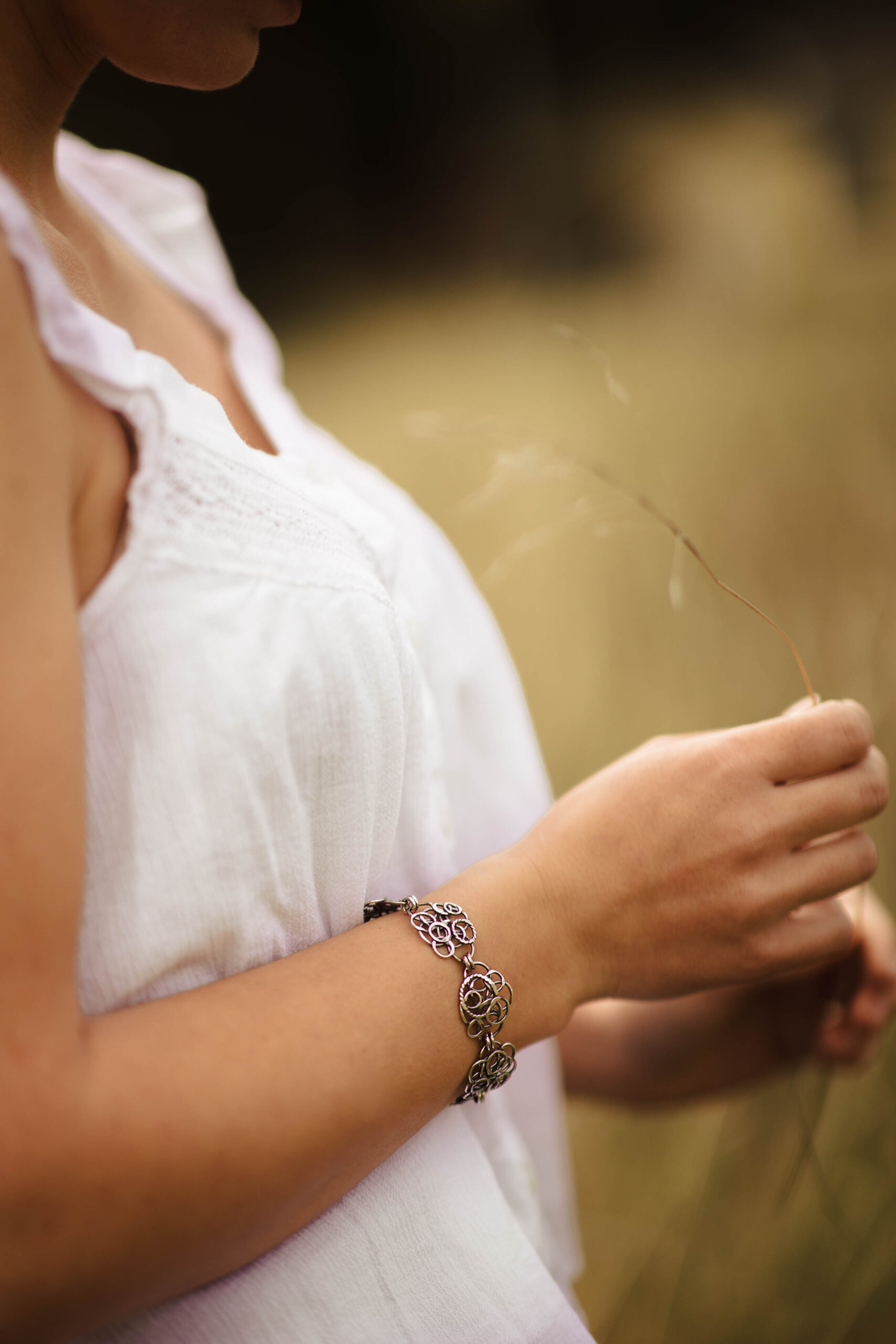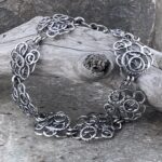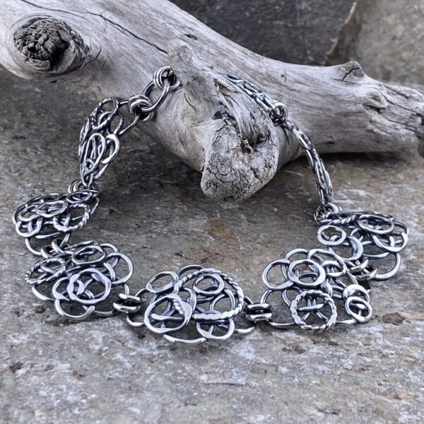 First, I fuse the hollow rings into panels. Next, I shape them into a gentle curve and attach double end rings for adjustable length. Then, I apply the antique finish, letting it settle into the textures to deepen the tone. Finally, I polish the raised areas lightly to reveal a soft silver glow. Each bracelet is handmade in my Creston, BC studio.