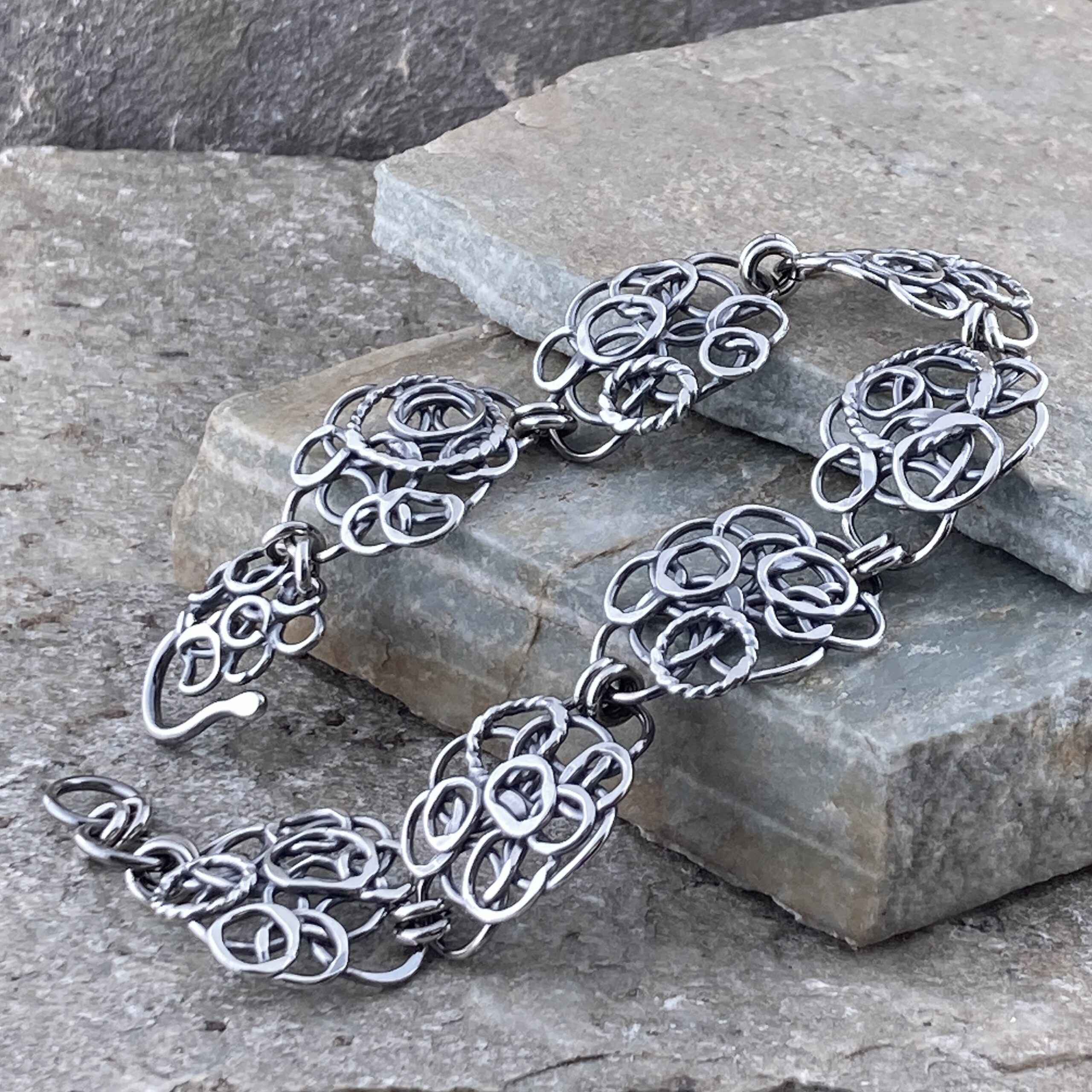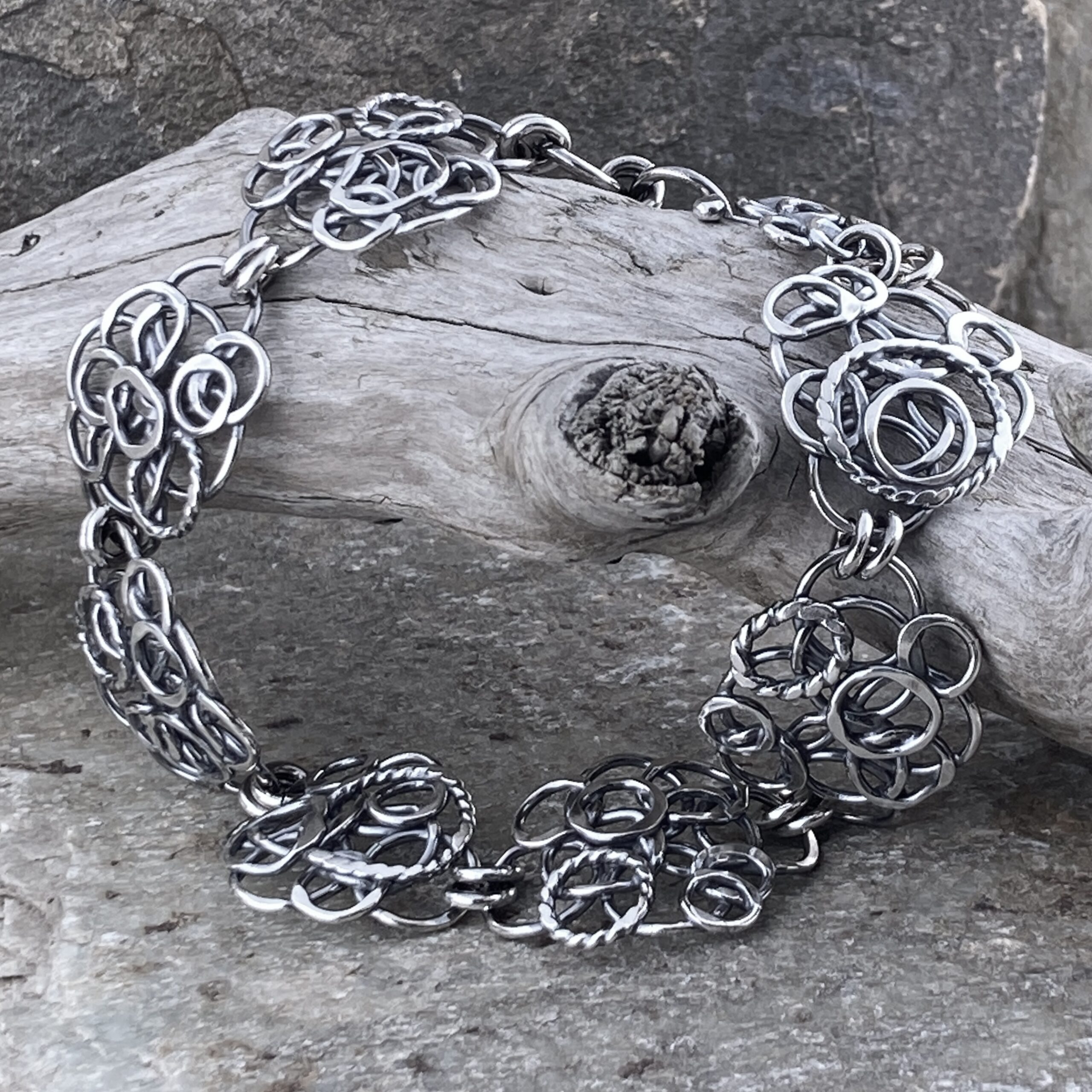 Each panel begins as hand-formed hollow rings made from Argentium silver. I fuse them together to create texture and balance. Next, I link the panels and add double end rings so you can adjust the length between 8 in and 8.5 in. Because each bracelet is handmade, small differences appear in every piece, giving it its own quiet rhythm.