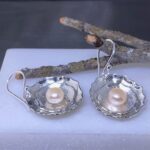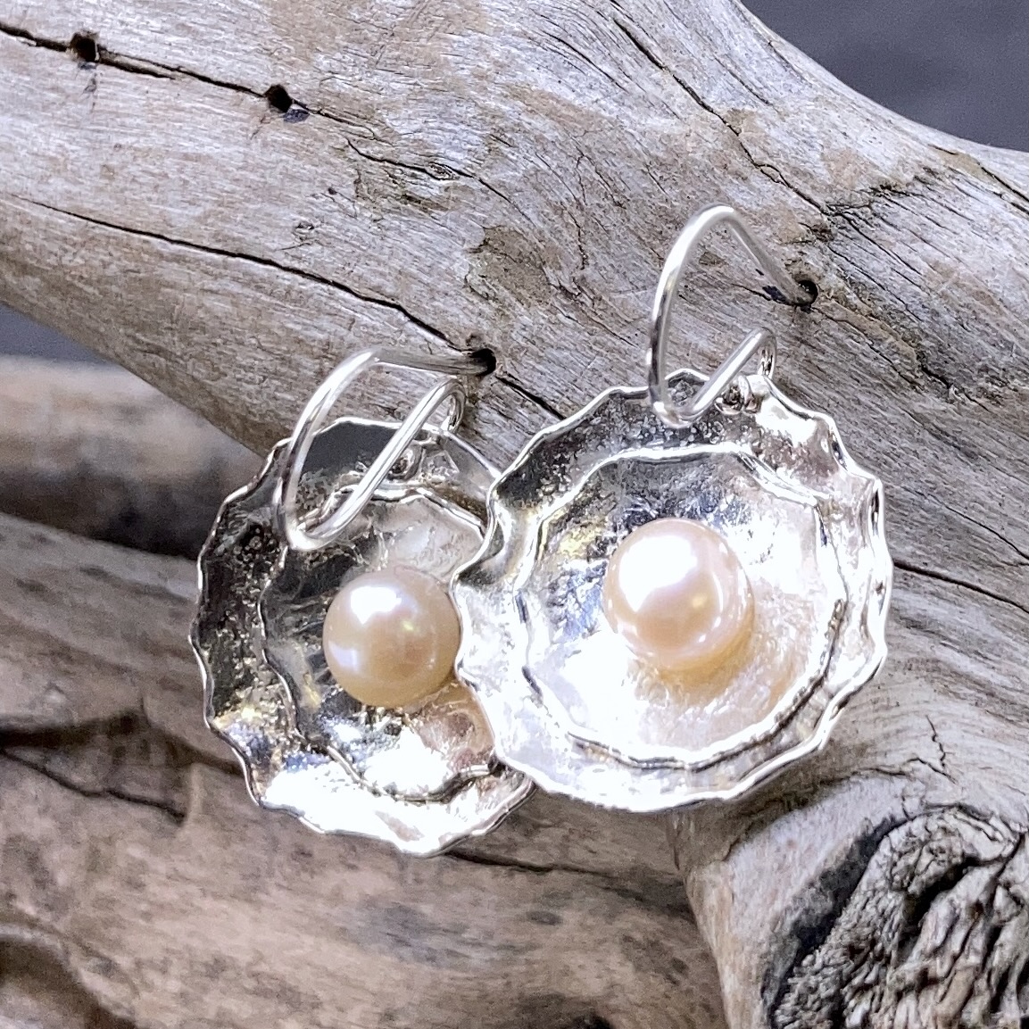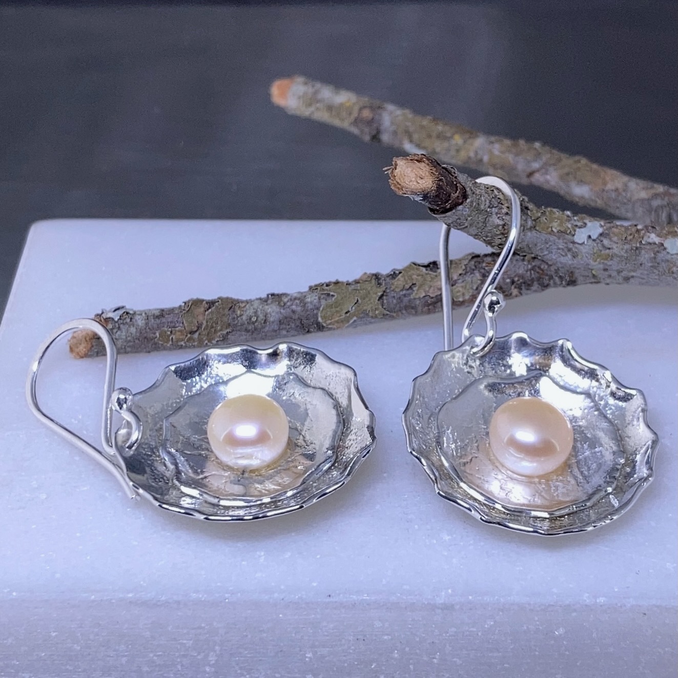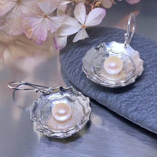 A pearl blossom earring design.  A 6 mm cream pearl is back drilled – so the pearl is attached with a post.  I have made two round Argentium silver petals and melted the edges for an organic look.