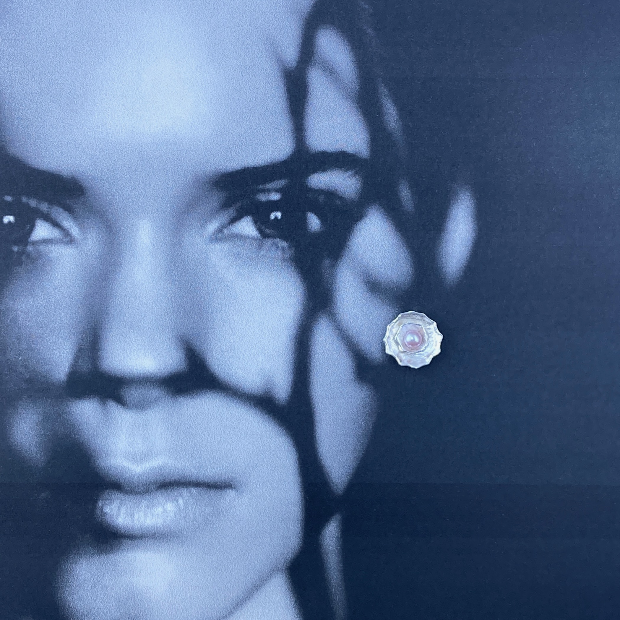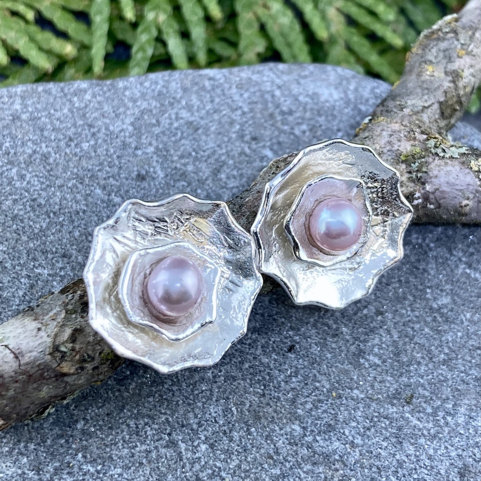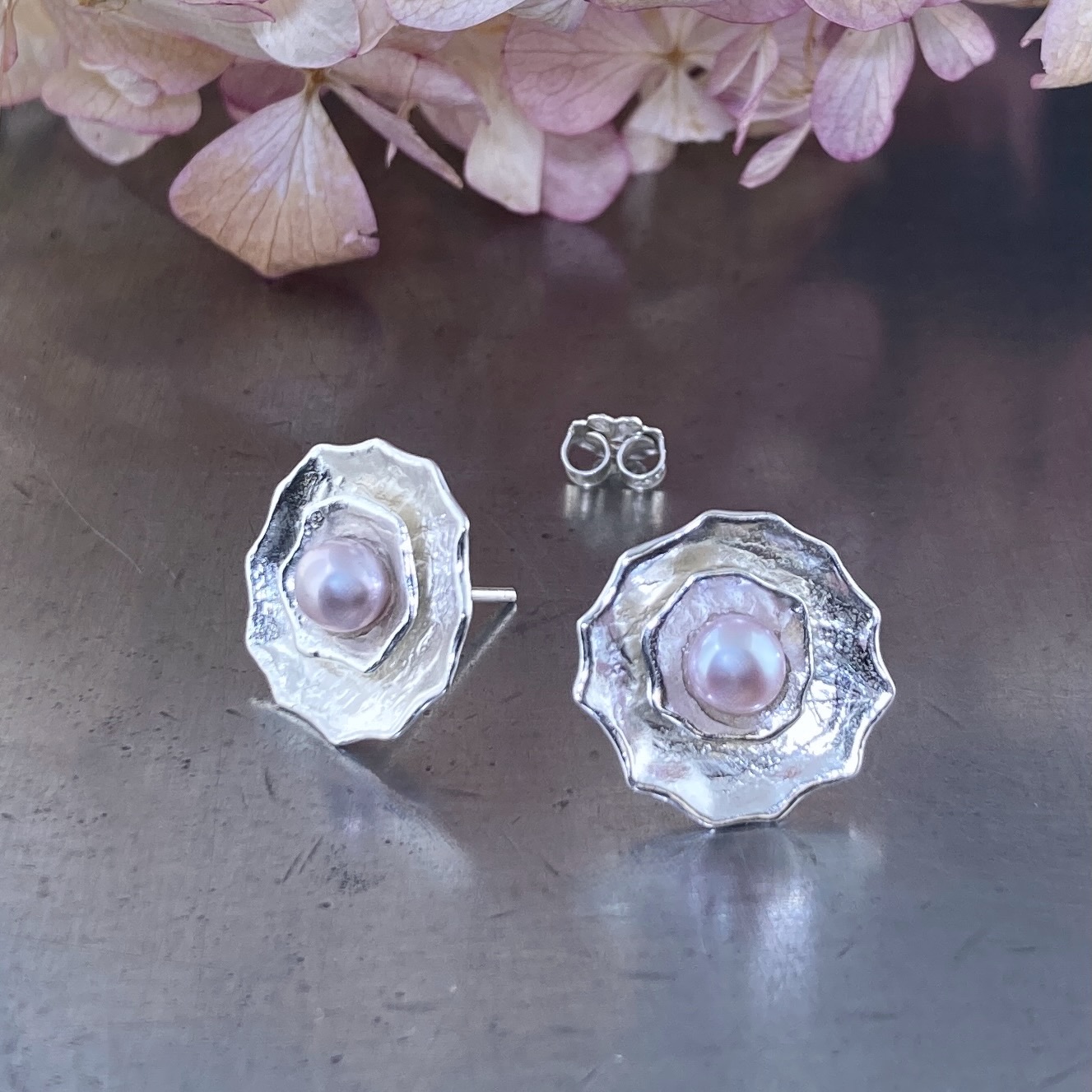 A pearl blossom earring design.  These earrings are a soft pink pearl that is back drilled – so the pearl is attached with a post.  I have made two round petals and melted the edges for an organic look.