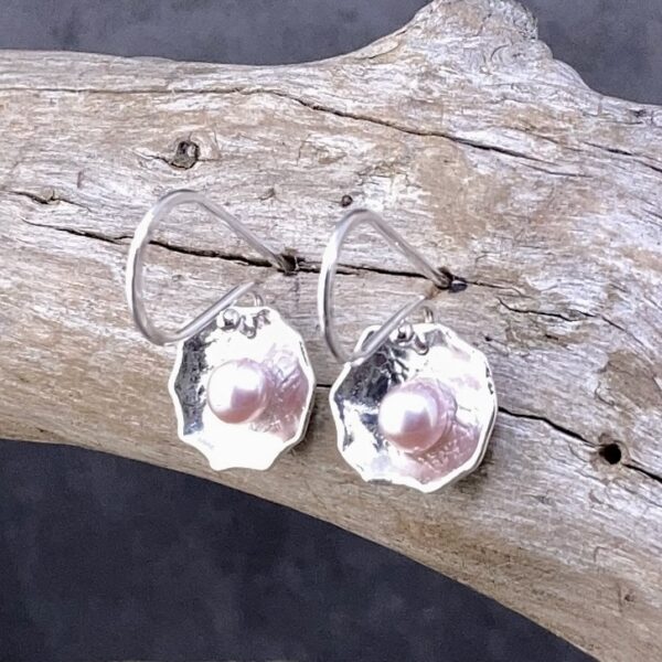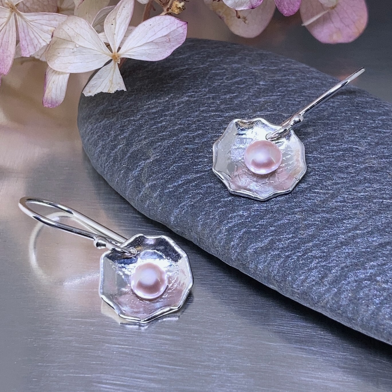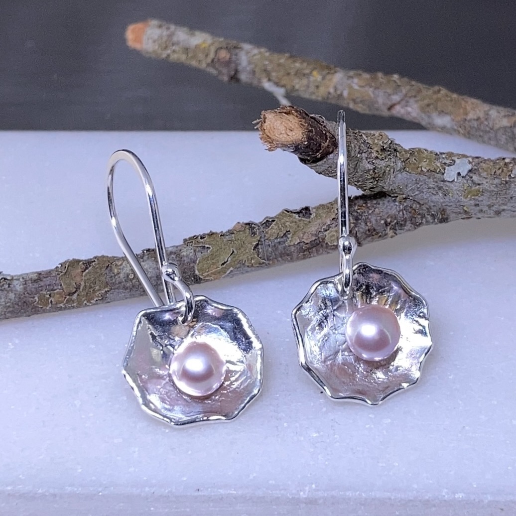 A pearl blossom earring design.  A 4.5 mm pink pearl is back drilled – so the pearl is attached with a post.  I have made two round Argentium silver petals and melted the edges for an organic look.