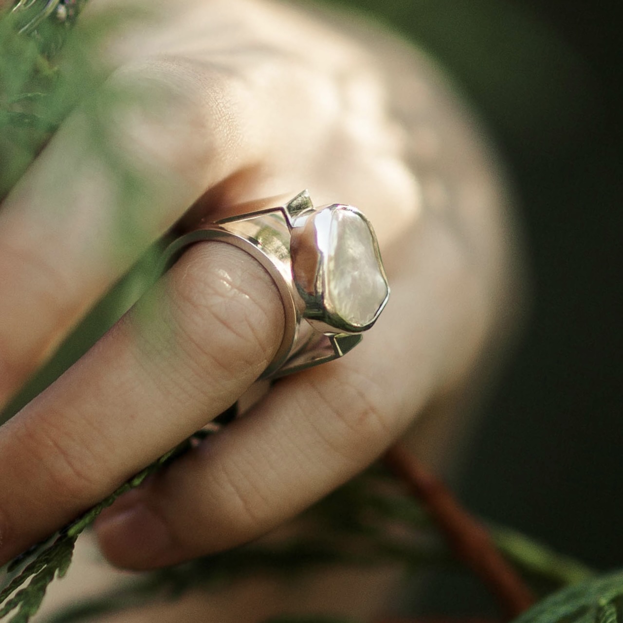 Each ring begins with a hand-formed square-round band, shaped to balance visual weight and comfort. The bezel is custom-fit to the pearl, securing it while letting the organic surface remain the focus.
