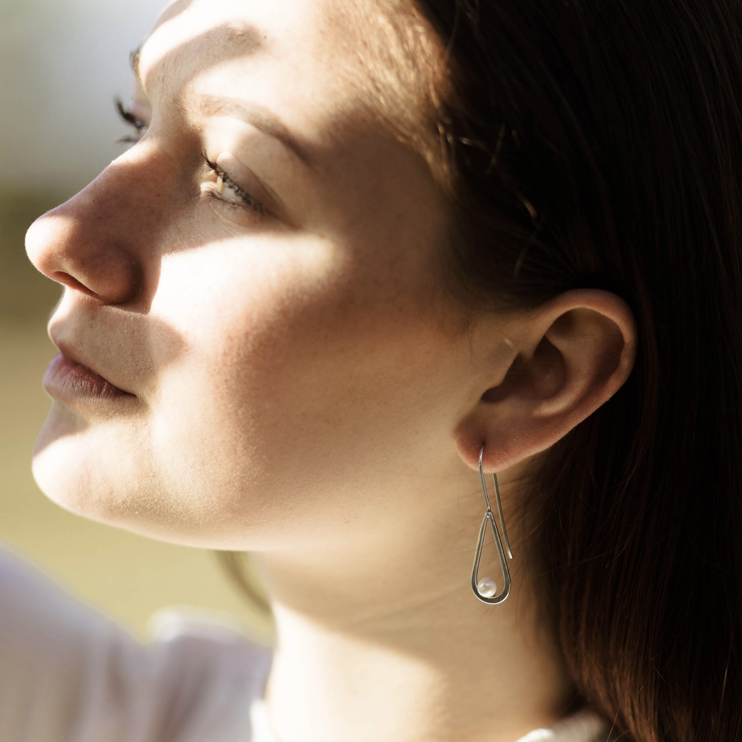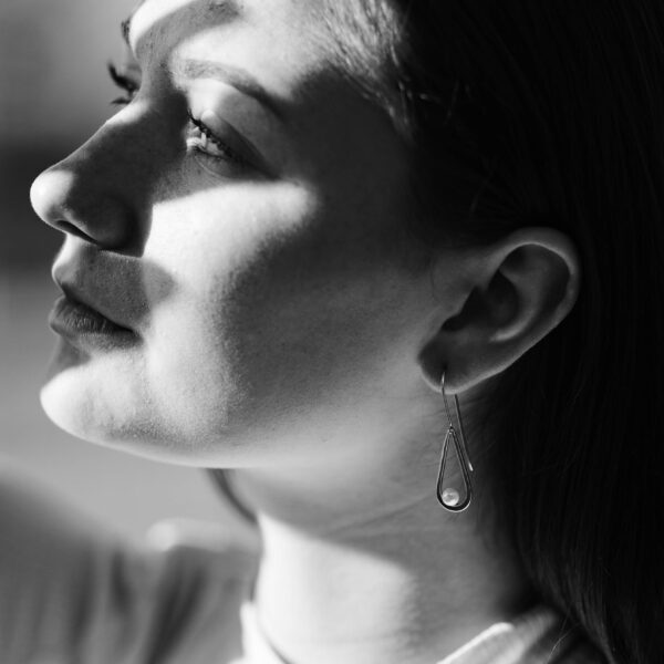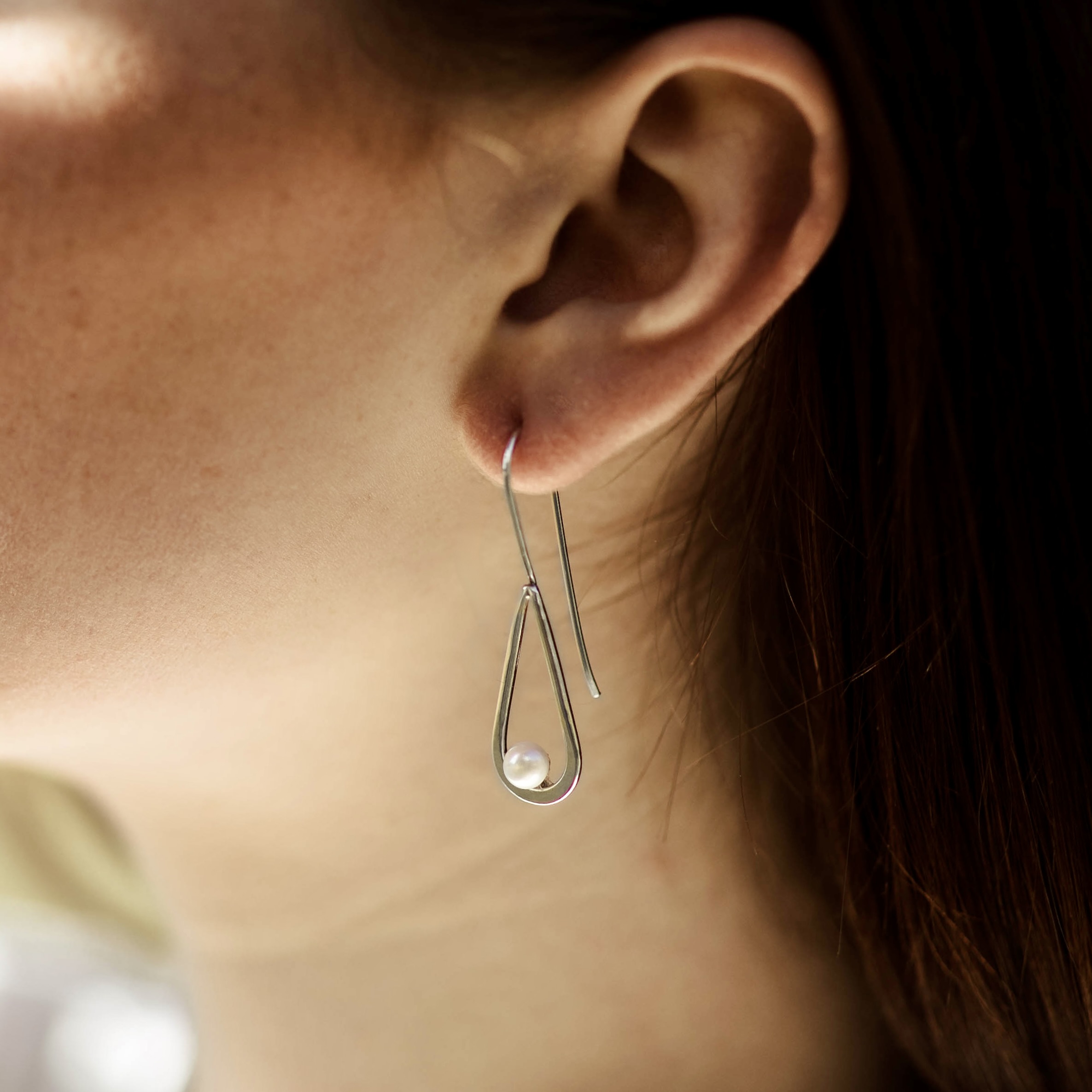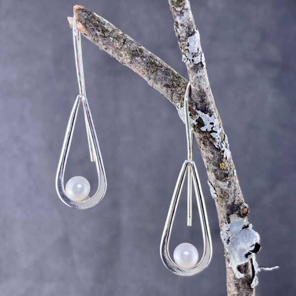 A white pearl that is half drilled. Â So there is a post to secure the pearl to the earring. Â A gentle teardrop of silver curves around the pearl. Â And a soldered-on, long earwire to finish the design.