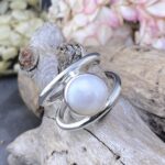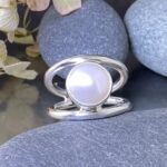 The round double-band might be the most comfortable ring ever! This creamy white pearl is tucked between 2 solid bands of Argentium silver. The ring is wide at the front and narrow at the back to support a large stone, and minimize the band width.