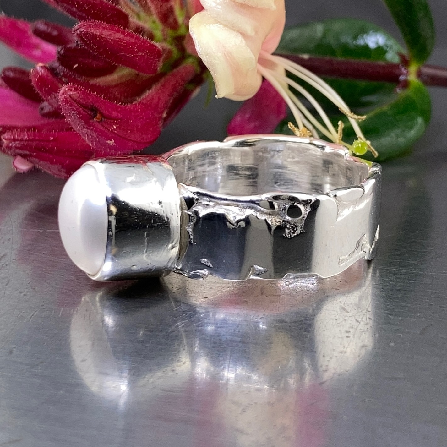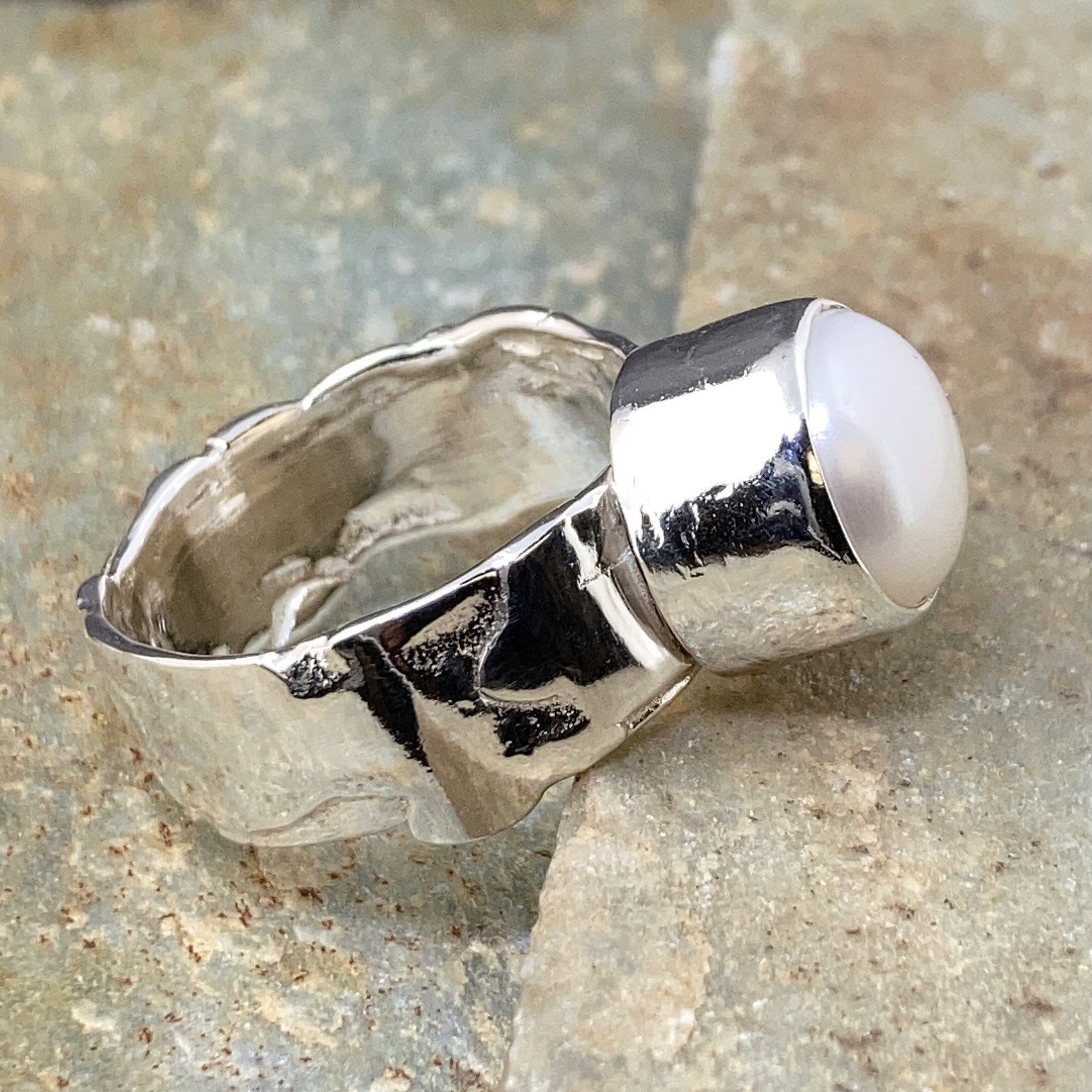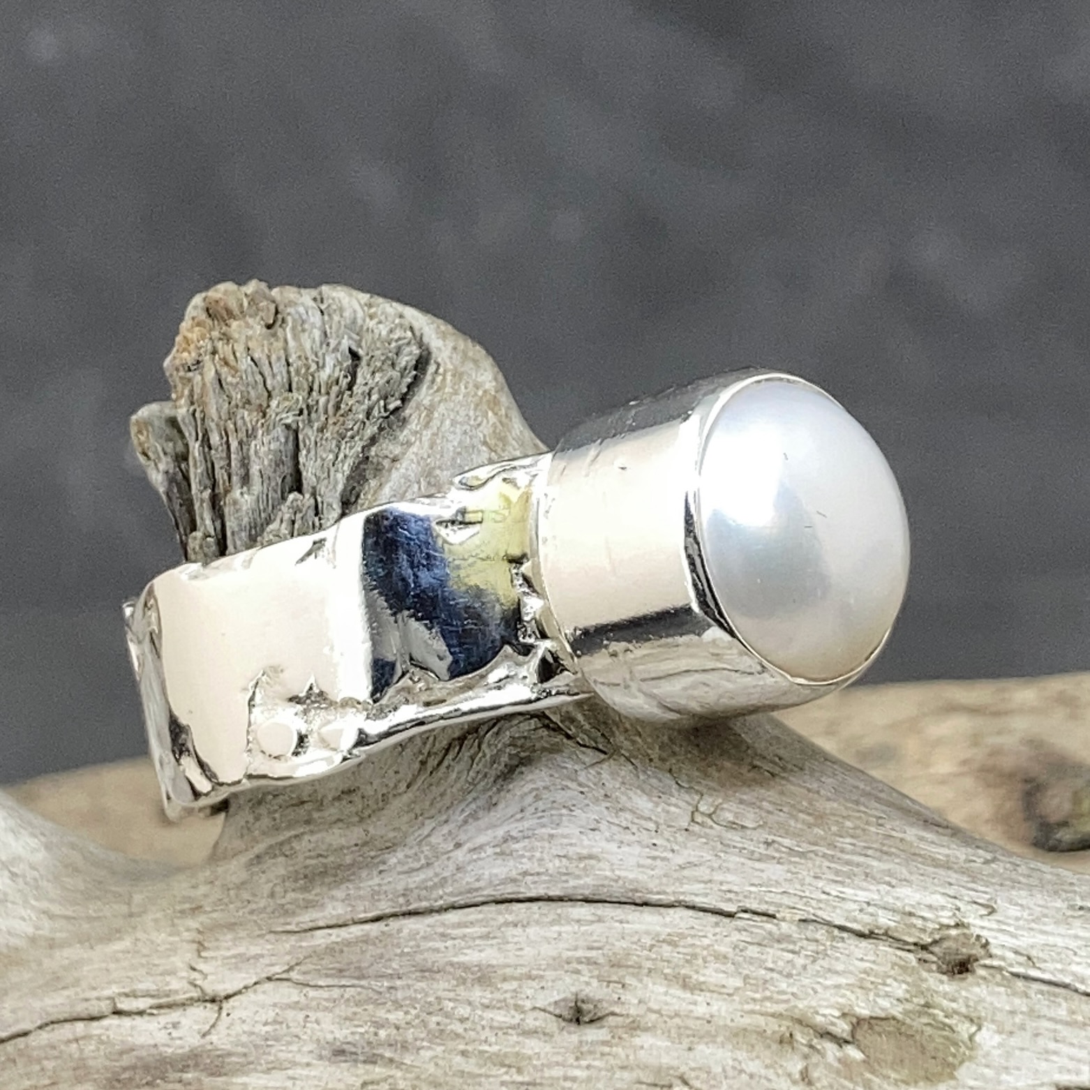 Handmade Pearl ring in Argentium silver with a River Band design. Natural pearl set in a tall bezel with smooth centre and rugged edges.