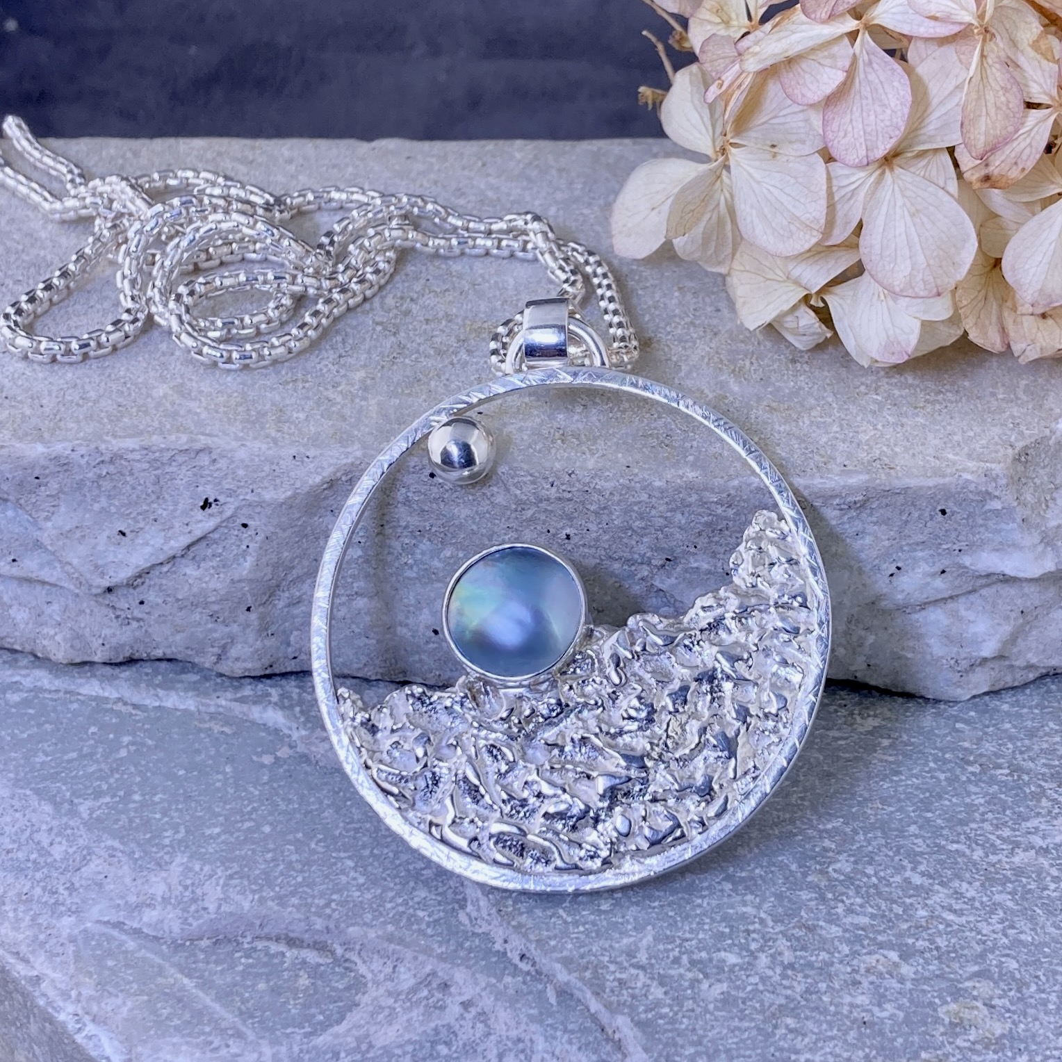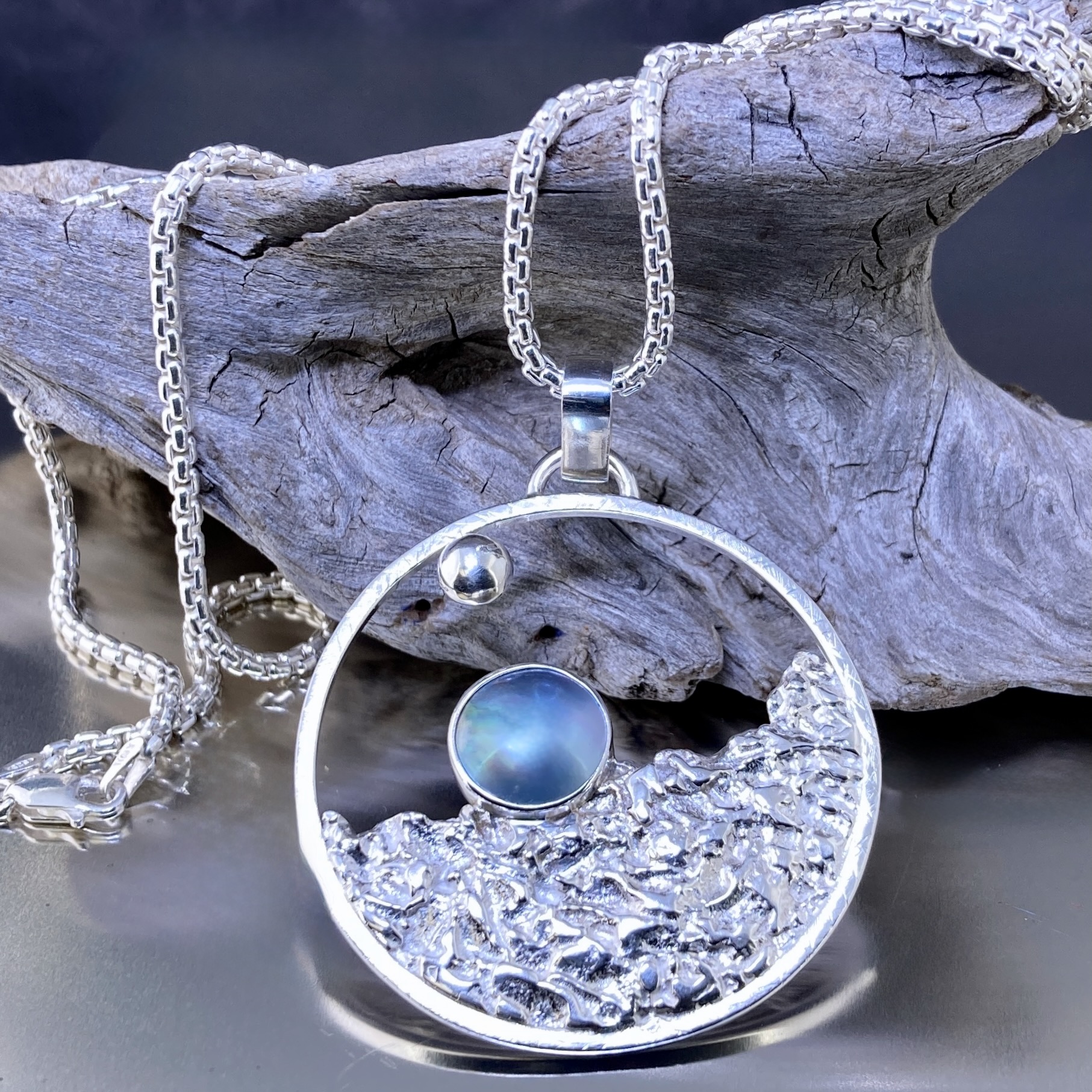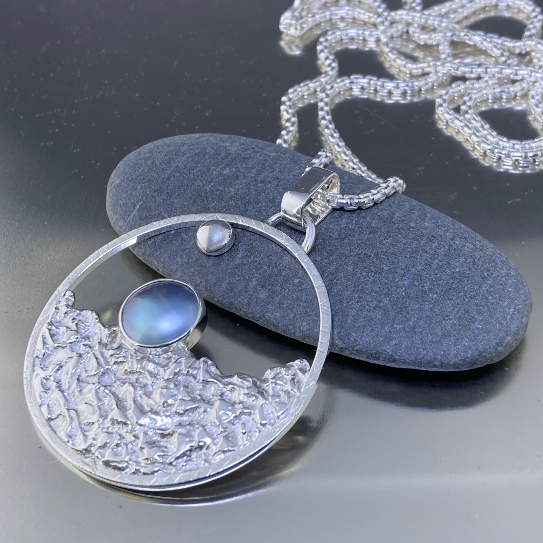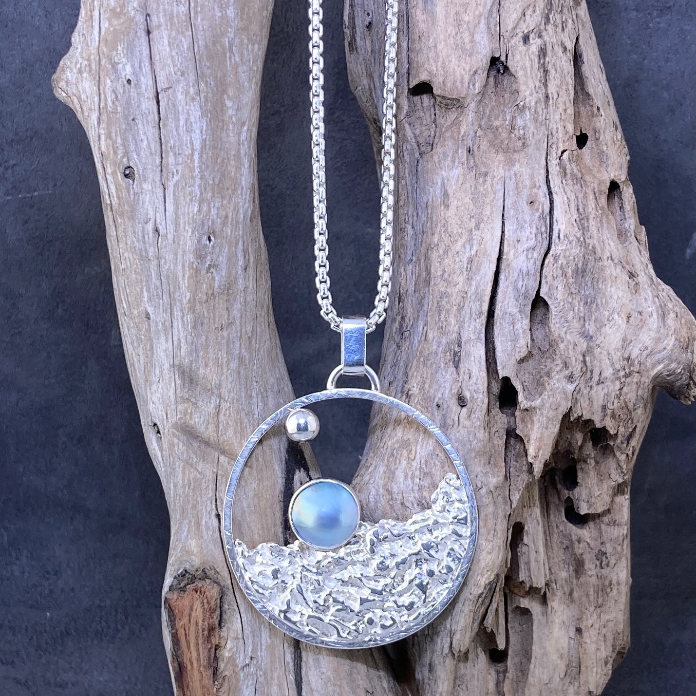 This Sun and Moon pendant is handmade in solid Argentium Silver 940. First, I texture the lunar surface to create depth and contrast. Then I set a silver blue-grey Mabe pearl at the centre. I also add a subtle planet accent to complete the celestial theme. Finally, I refine and polish the surface to a clean, bright finish.