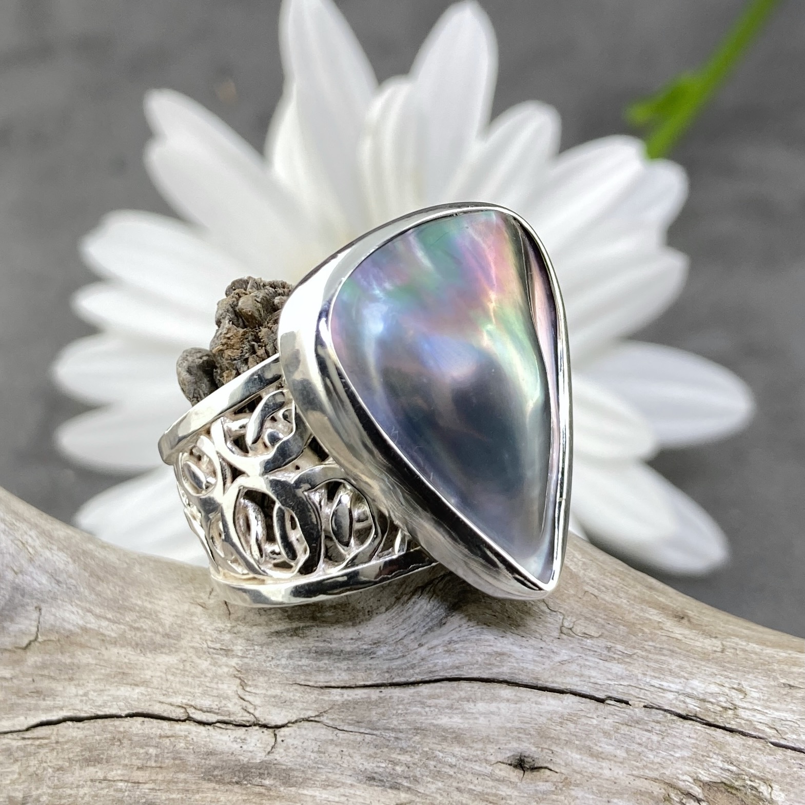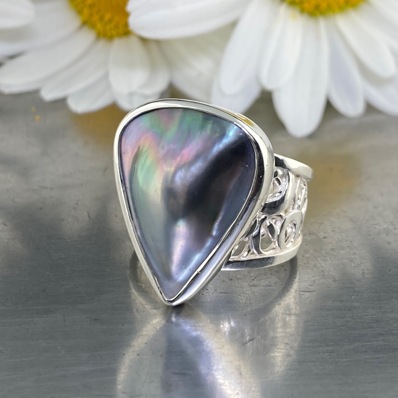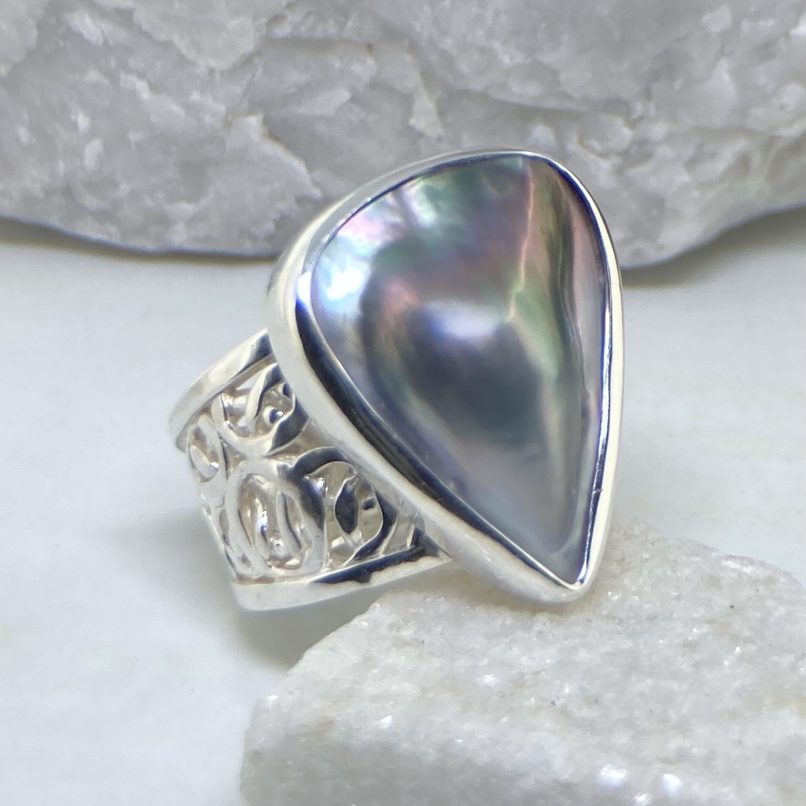 The gemstone is a natural Tahitian Pearl in a large teardrop shape. It is bezel set for protection and smooth finish. The soft metallic sheen of the pearl contrasts beautifully with the bright silver, adding depth and calm presence to the piece.